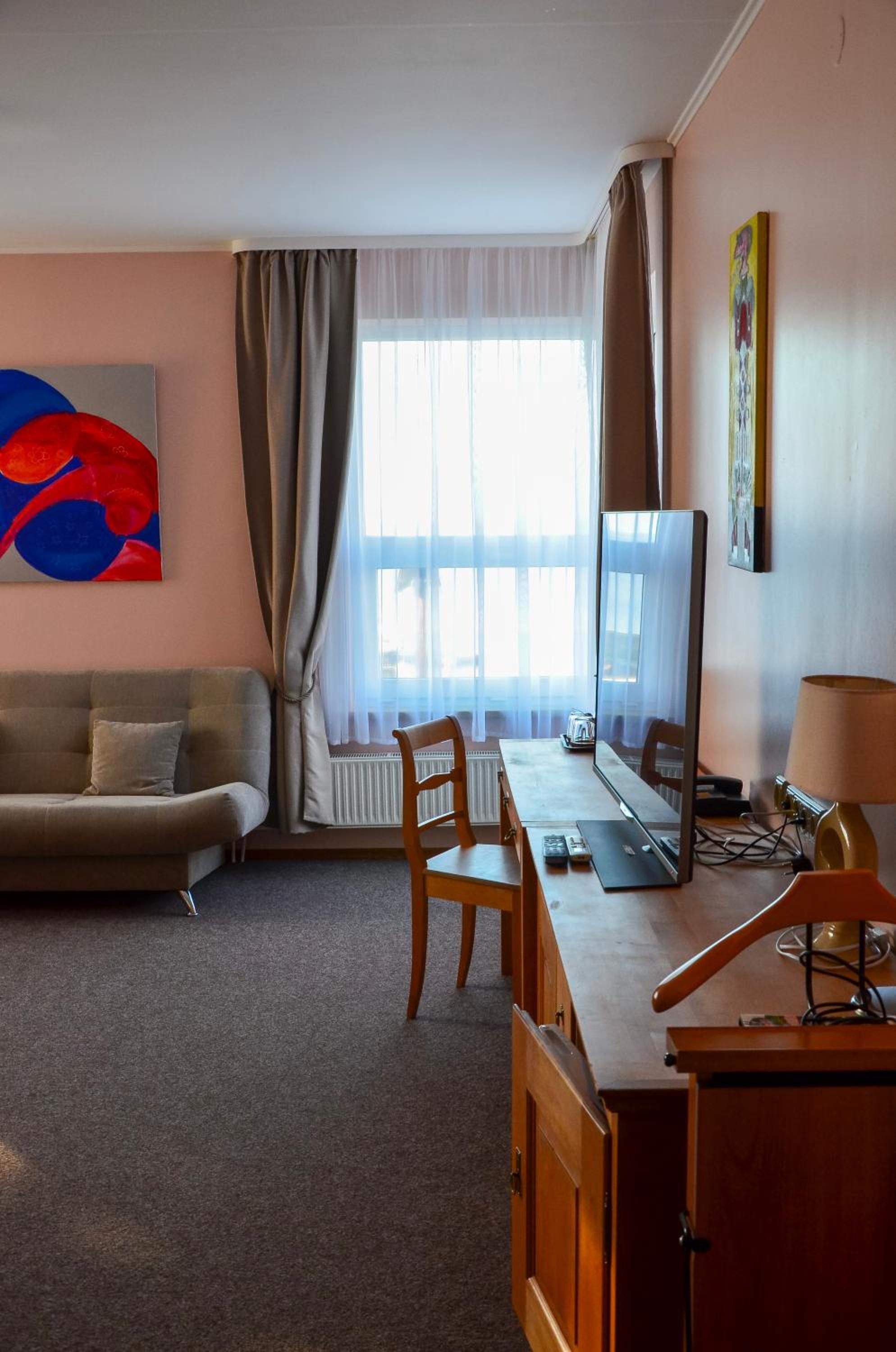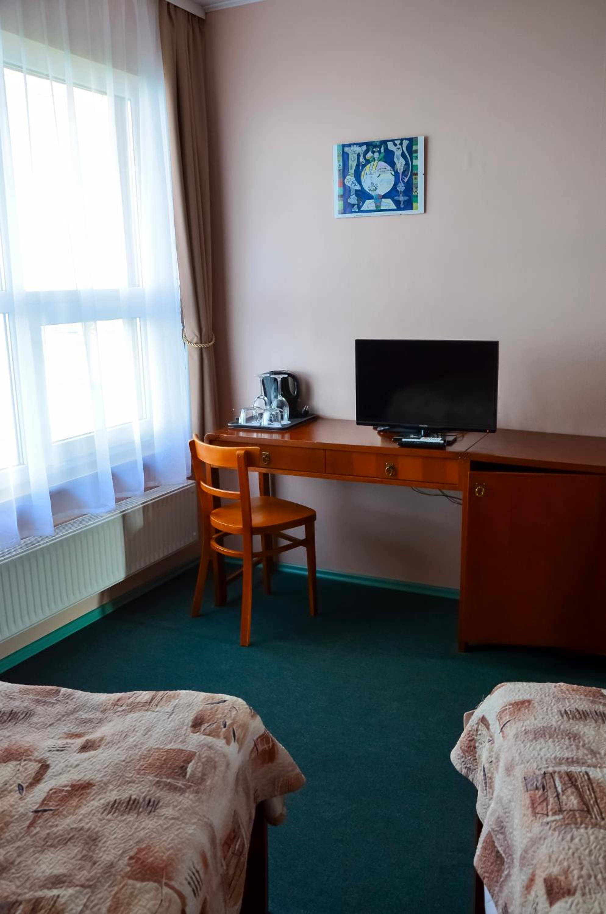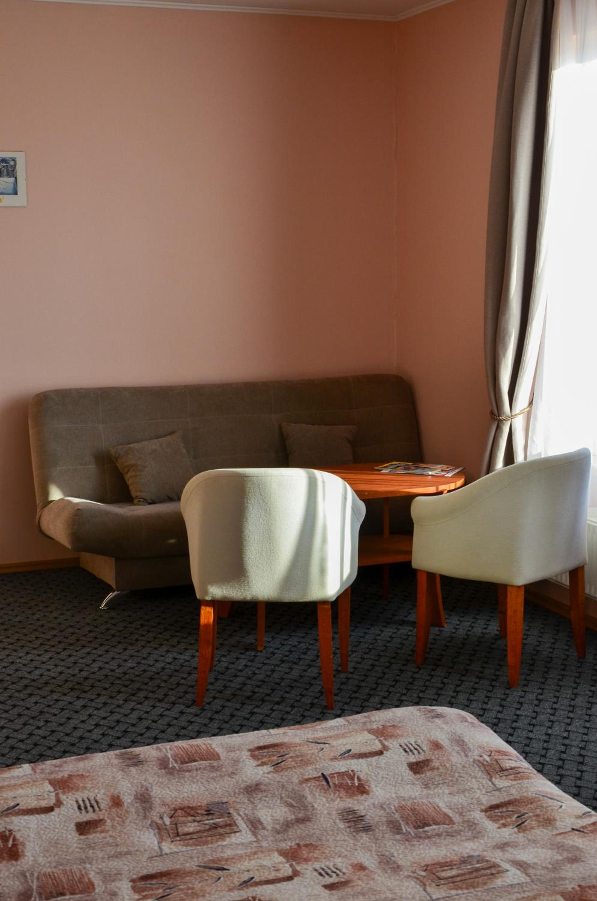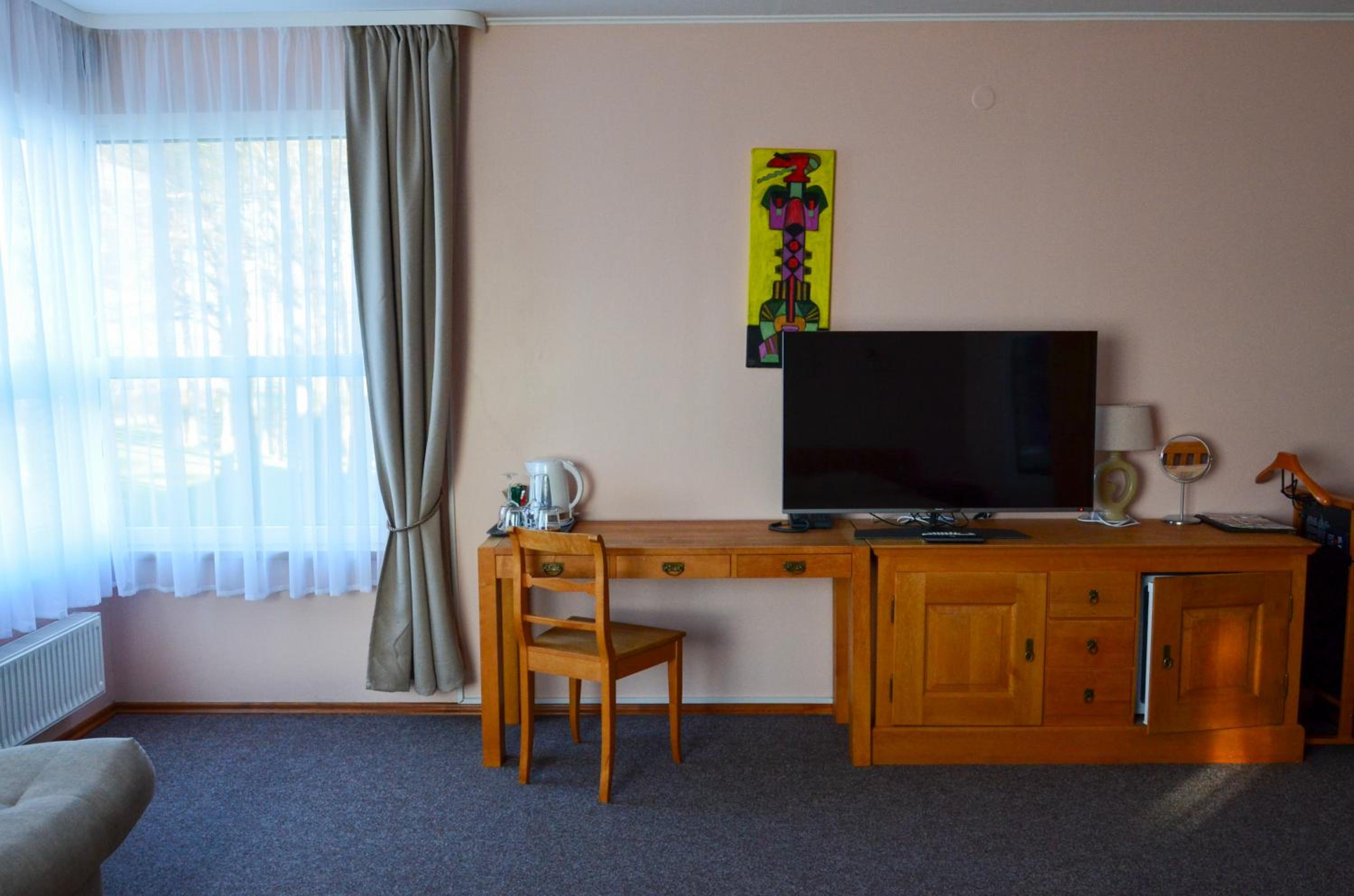 Direkter Blick auf das Kurische Haff und die Wanderdünen der Nehrung aus dem Zimmer, Ausstattung u.a. mit Kühlschrank und Wasserkocher, was beides sehr hilfreich war, Unterstellmöglichkeit für die Fahrräder, netter Service, es fehlte an nichts. Absolut empfehlenswert, auch Übernachtung im Zelt, Bungalow etc. möglich. Wer möchte, kann direkt vom Hotel mit einer kleinen Fähre nach Nidden auf die Nehrung fahren.