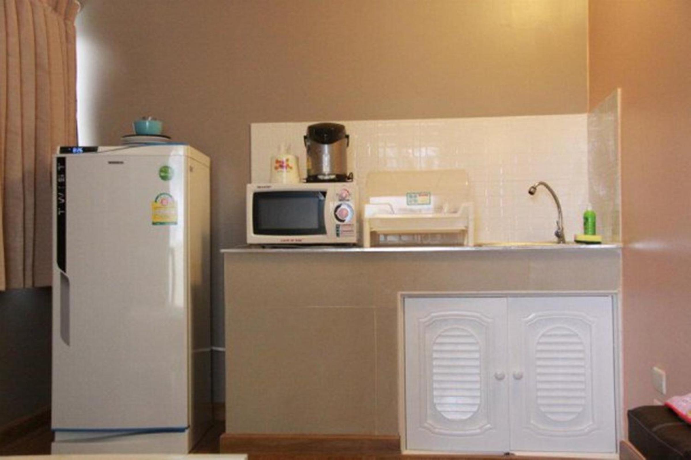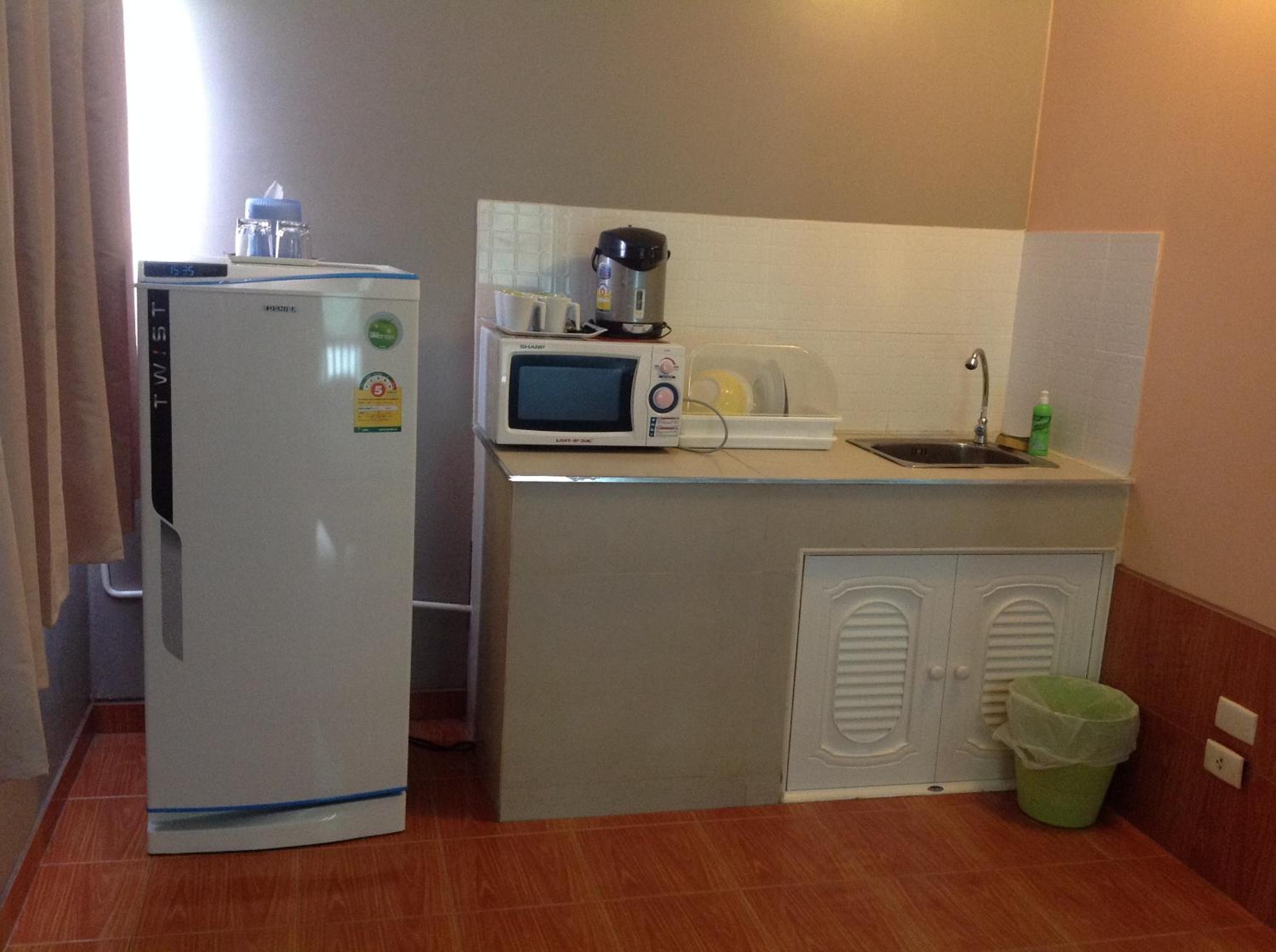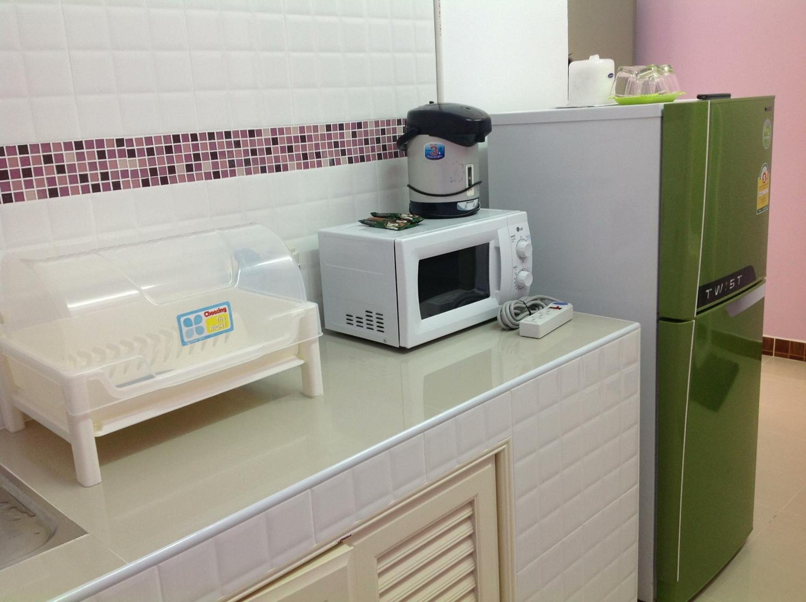 อุปกรณ์ครบครัน มีเตาไมโครเวฟ มีกาน้ำร้อน มีจานชาม มีน้ำยาล้างจานให้เรียบร้อย