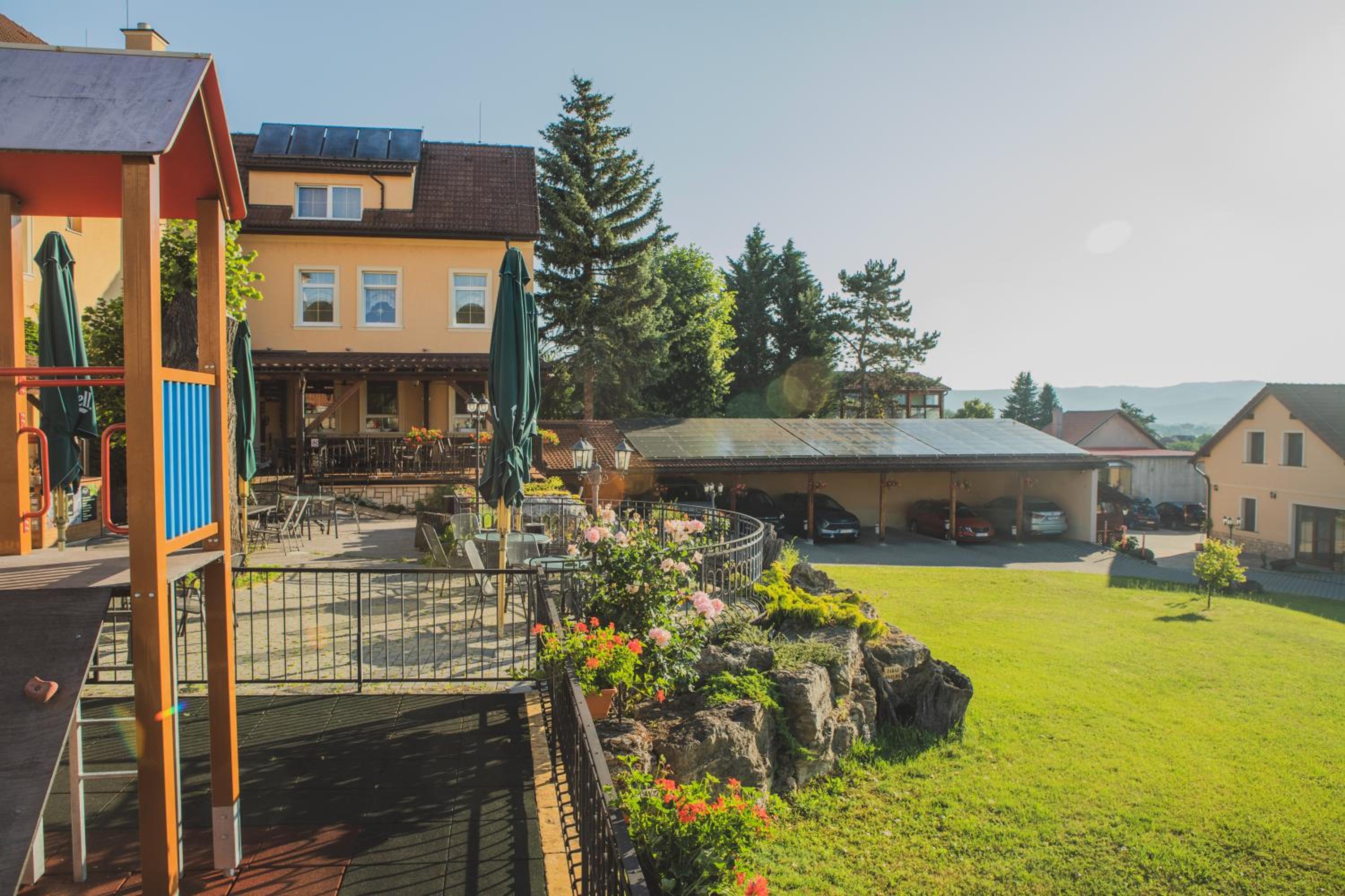 Guests can enjoy the on-site restaurant with a summer terrace or explore the playing corner with a trampoline. With a bus stop just 10 meters away and private parking available, exploring the area is easy. Don't forget to visit the local zoo and thermal spa nearby for a memorable experience.