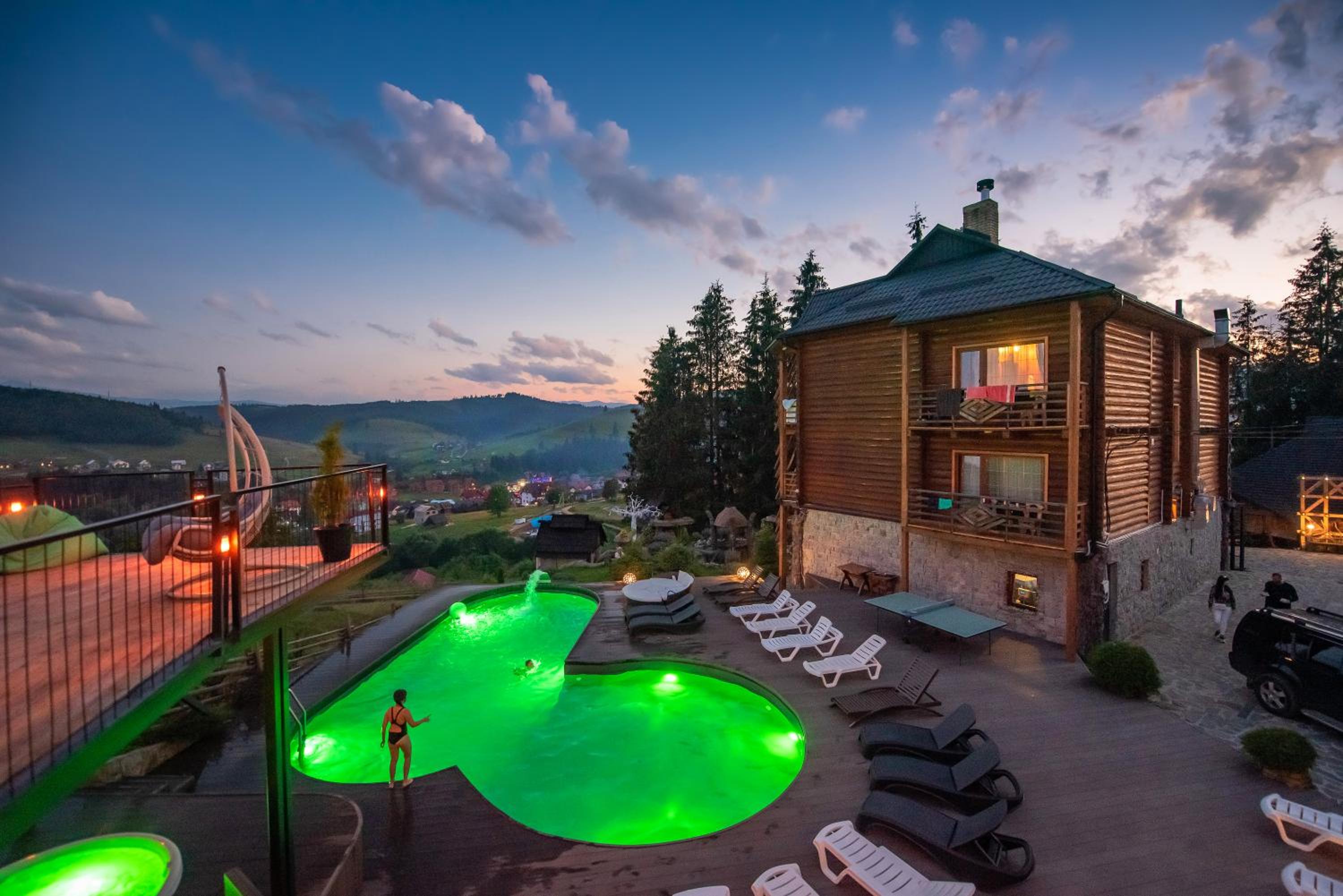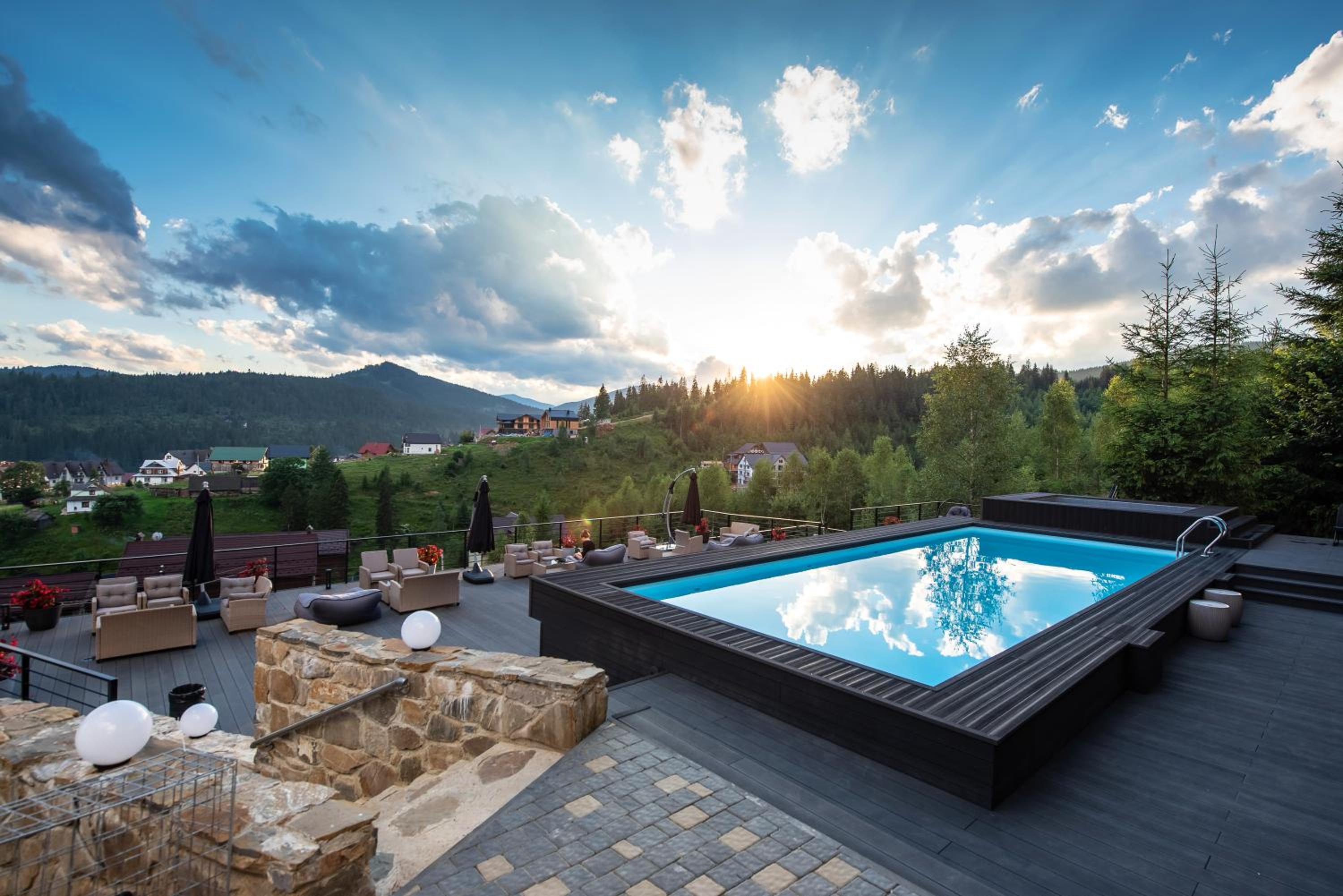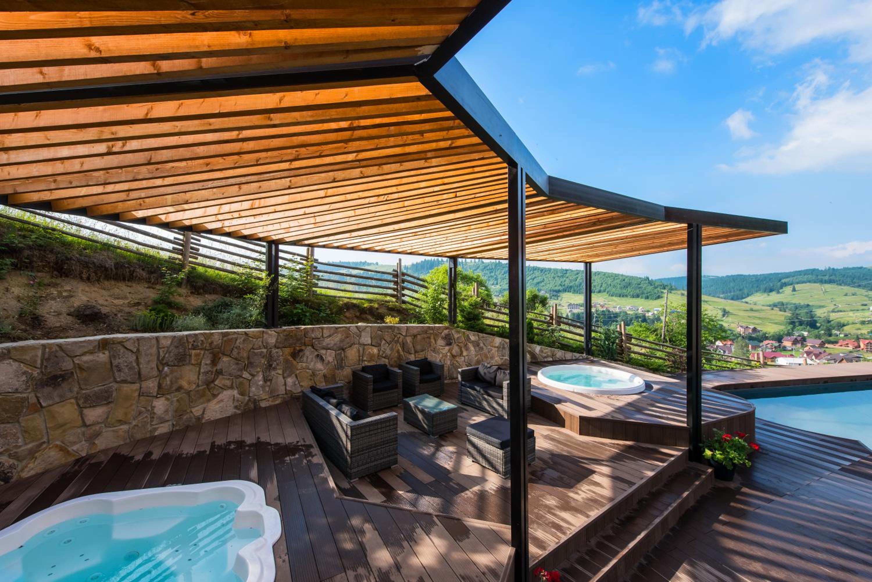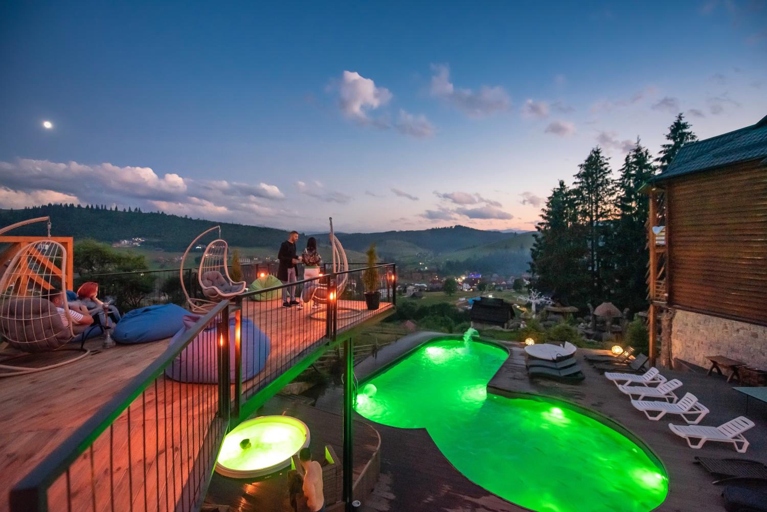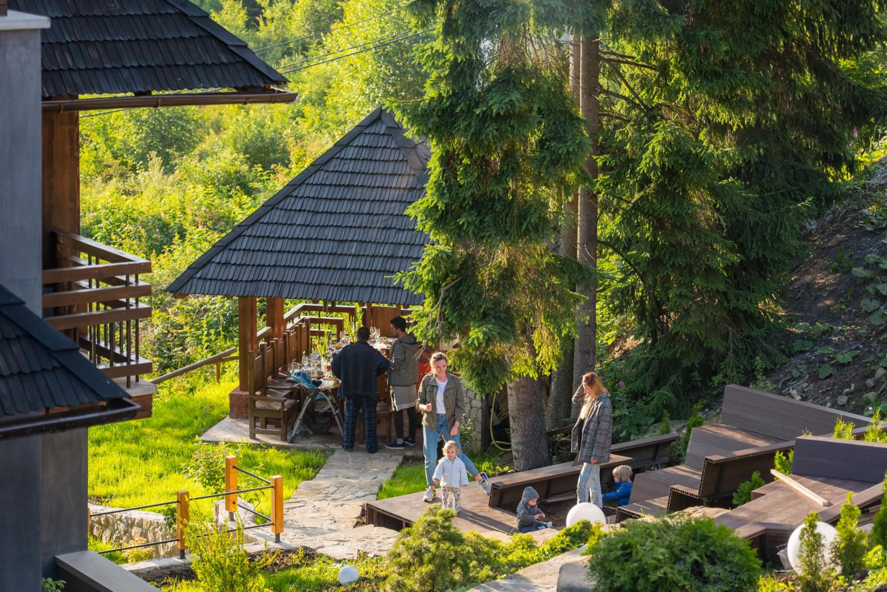 Територія — неймовірна! Все утопає у зелені, казкові фотозони, альтанки, вогнище під зорями, відкритий басейн і джакузі з видом на гори. Це місце ніби створене для перезавантаження й натхнення.