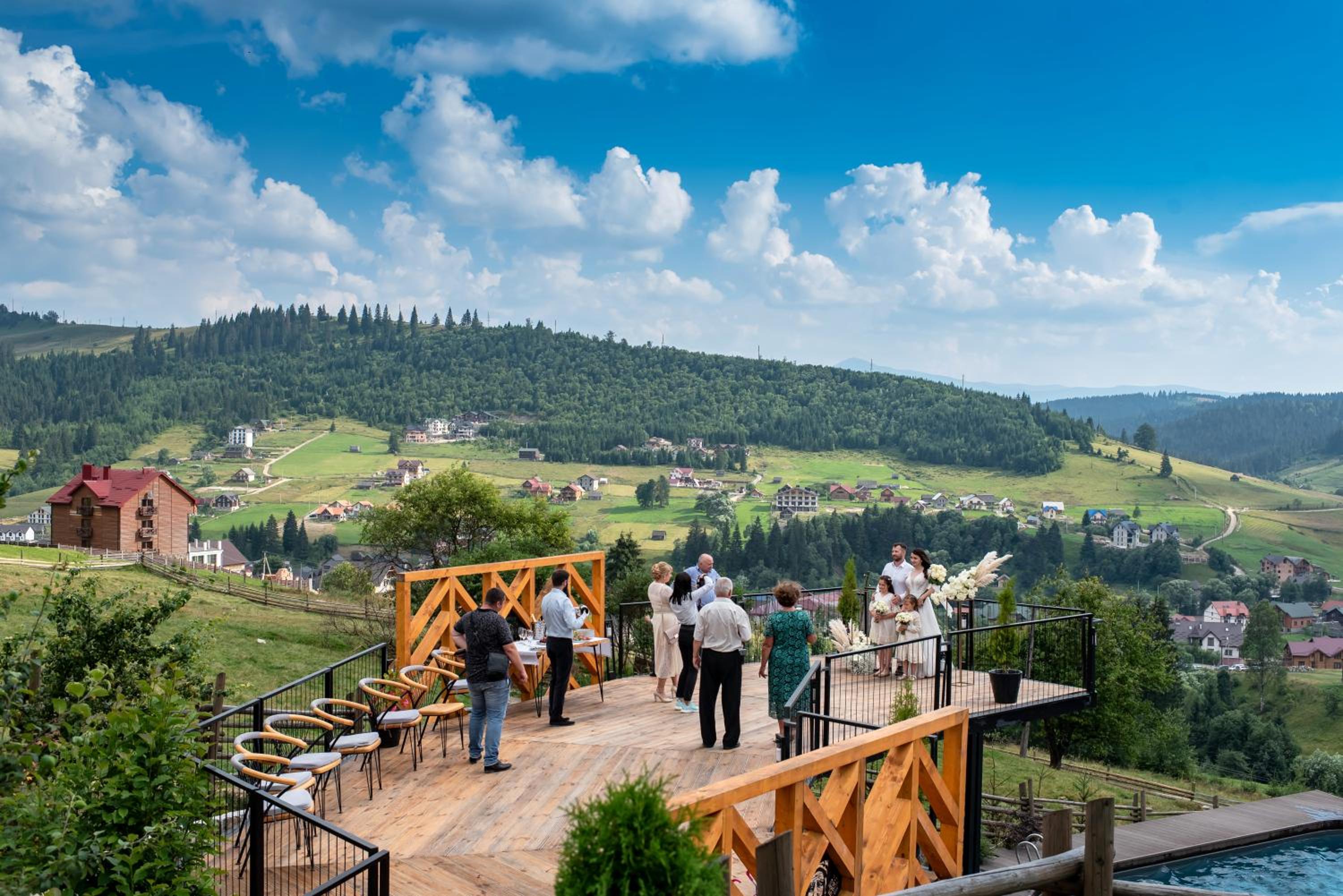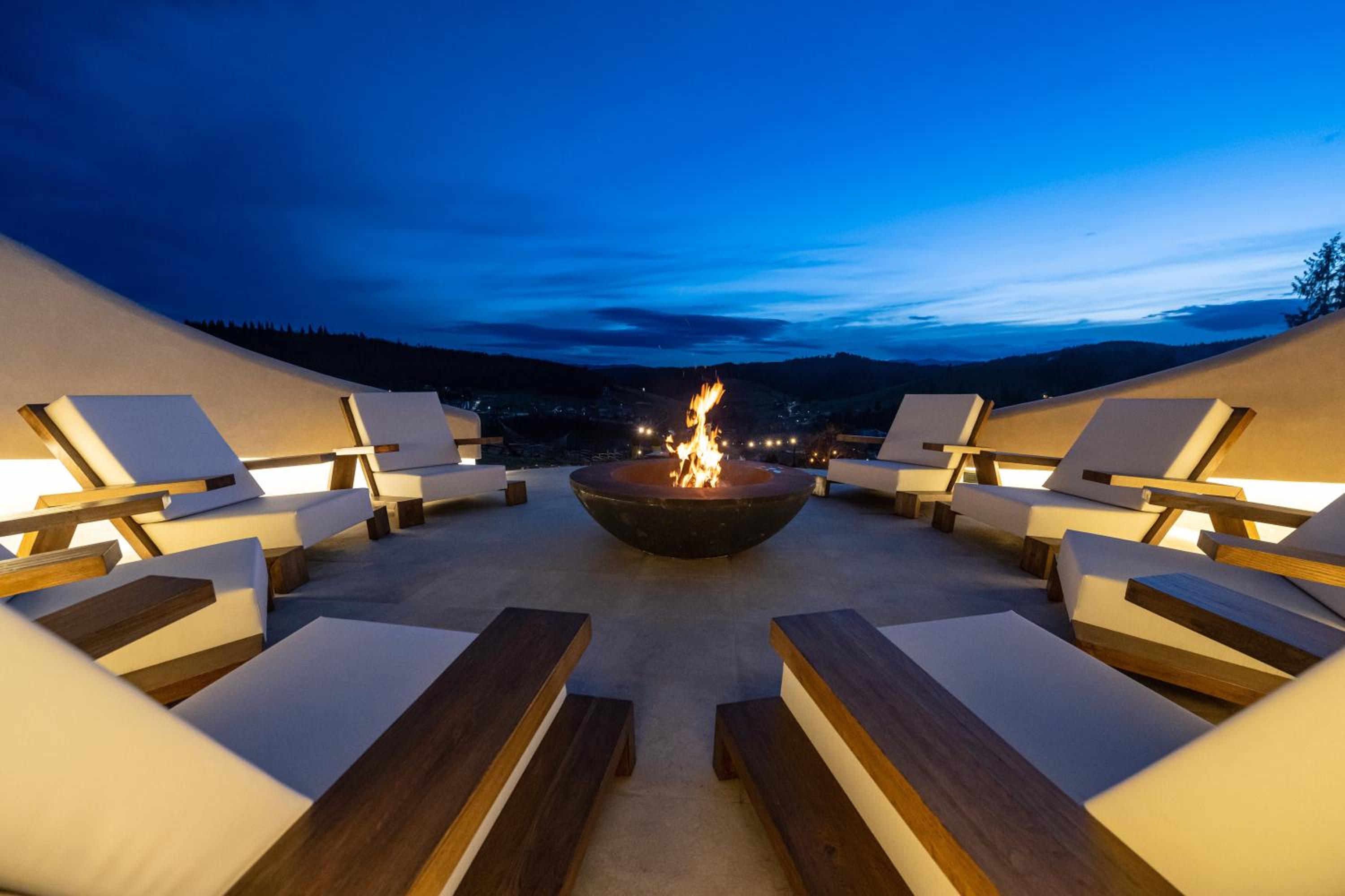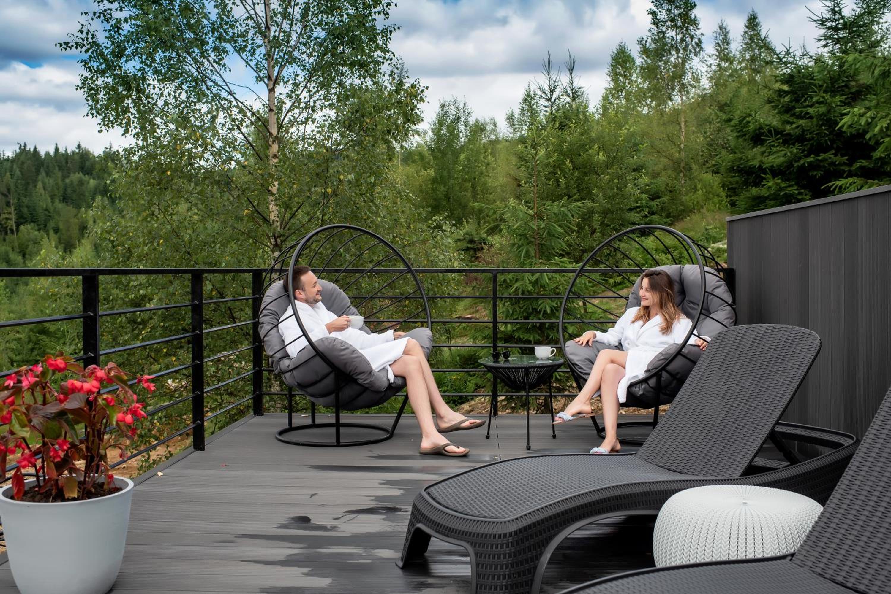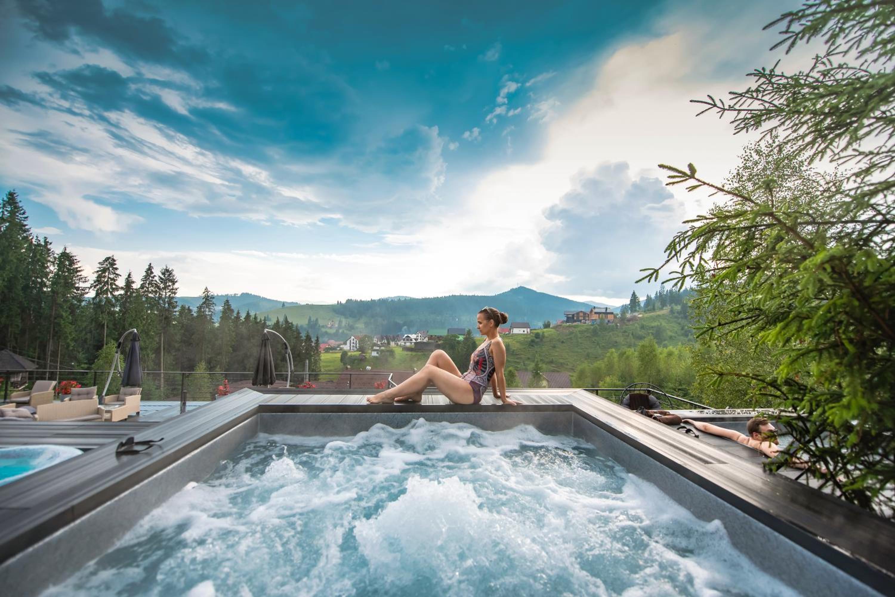 Територія — неймовірна! Все утопає у зелені, казкові фотозони, альтанки, вогнище під зорями, відкритий басейн і джакузі з видом на гори. Це місце ніби створене для перезавантаження й натхнення.