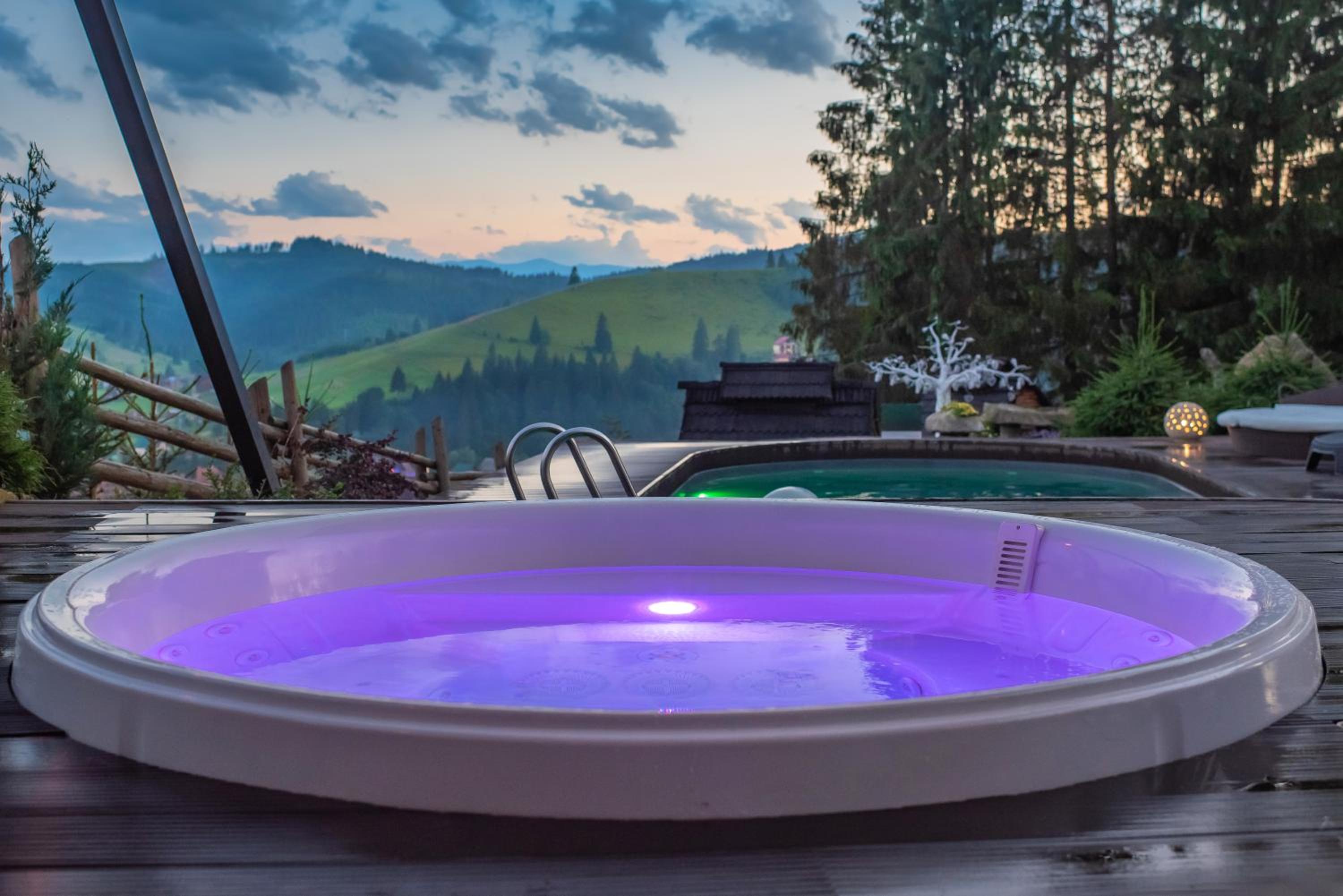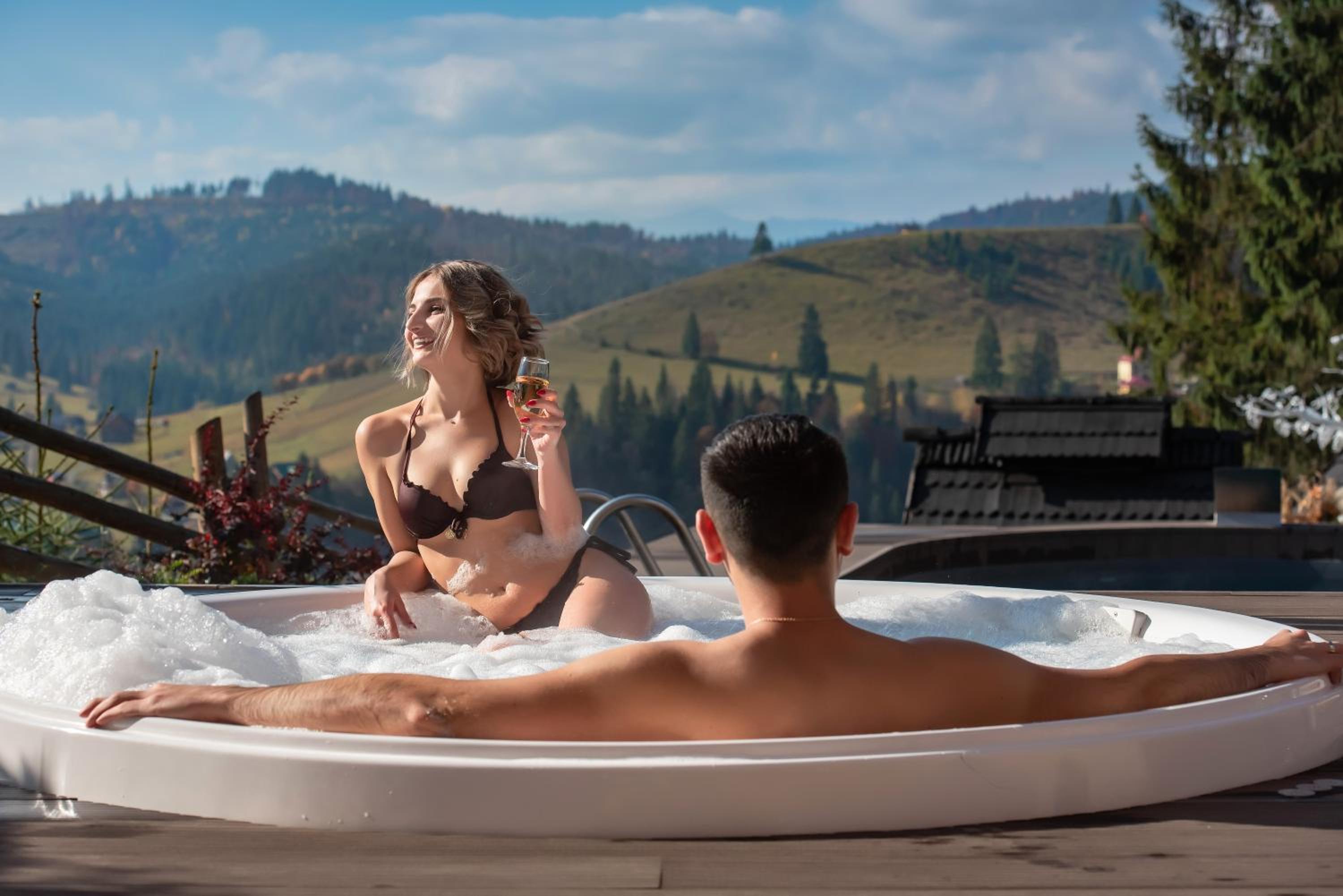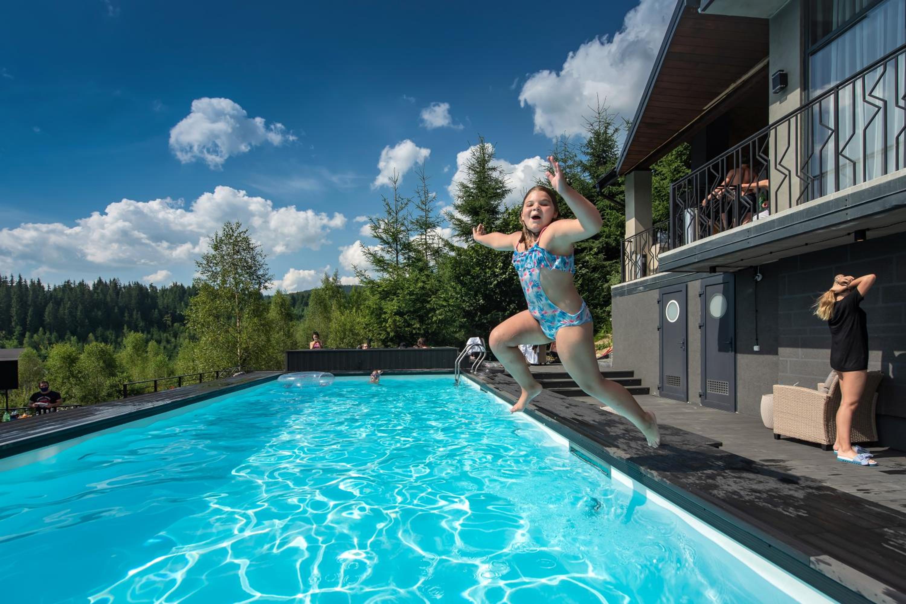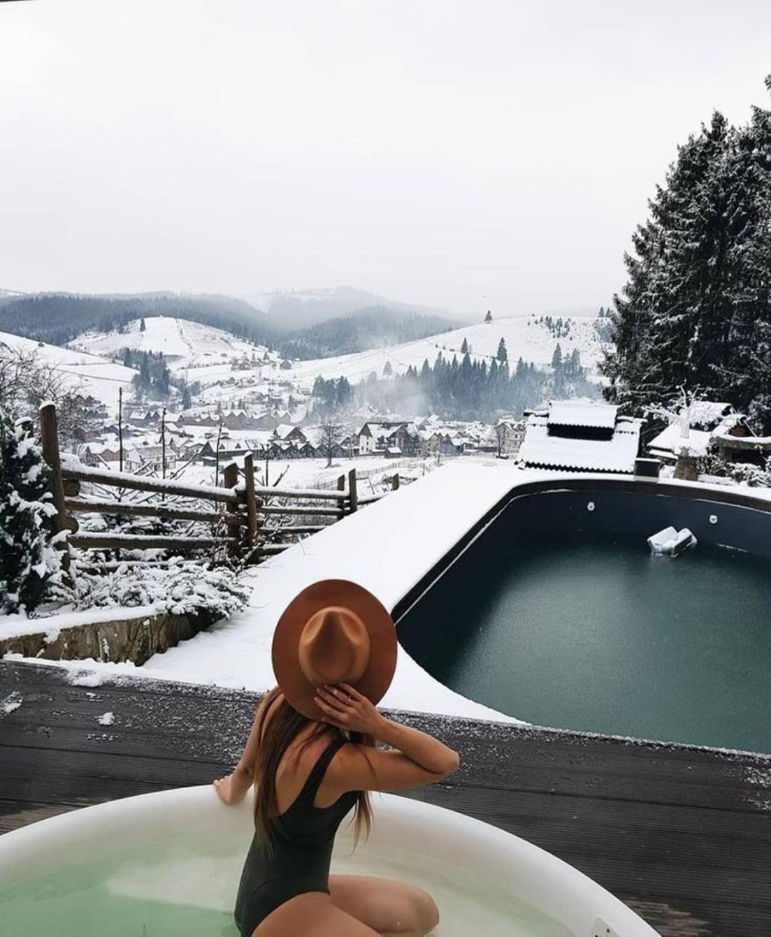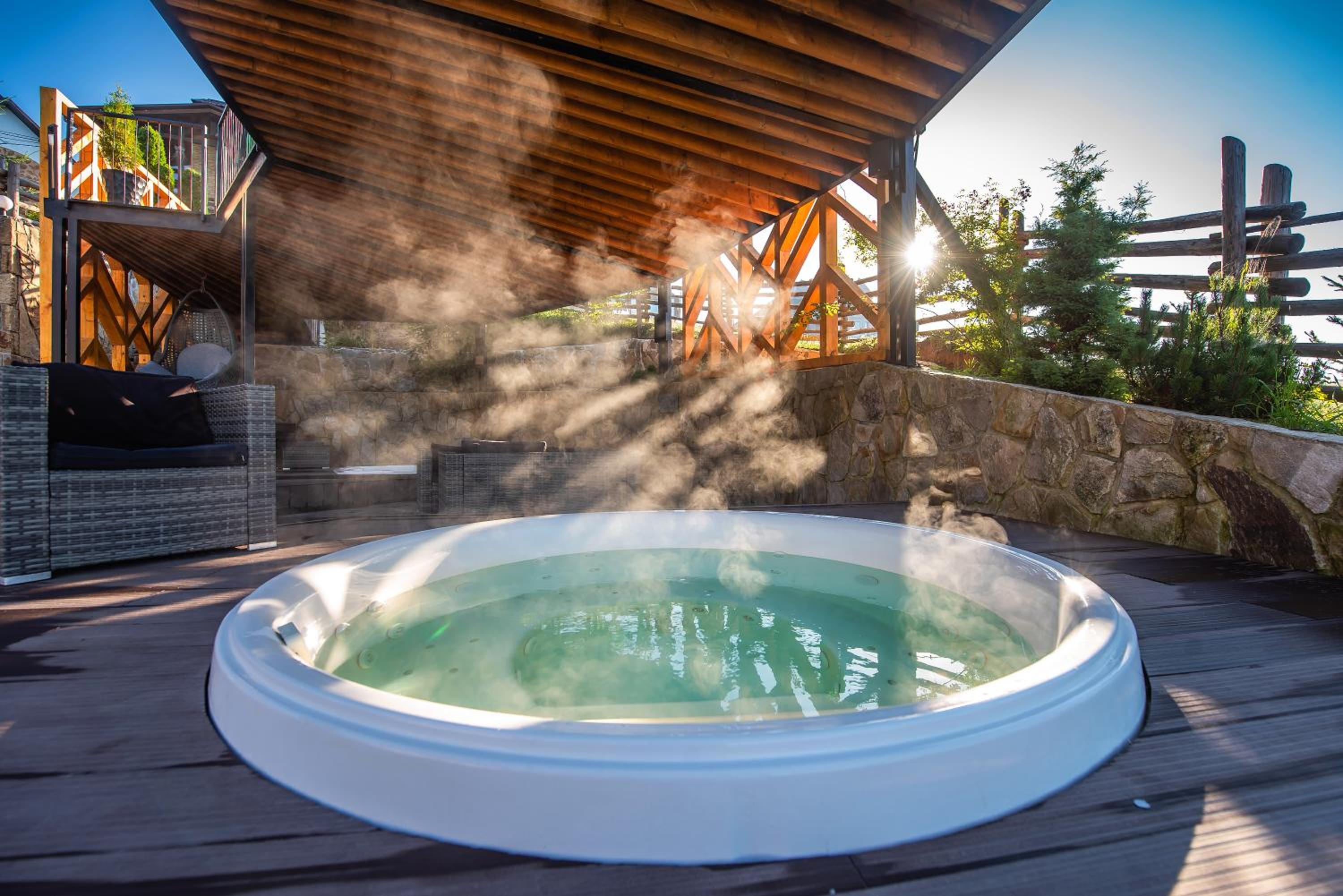 Територія — неймовірна! Все утопає у зелені, казкові фотозони, альтанки, вогнище під зорями, відкритий басейн і джакузі з видом на гори. Це місце ніби створене для перезавантаження й натхнення.