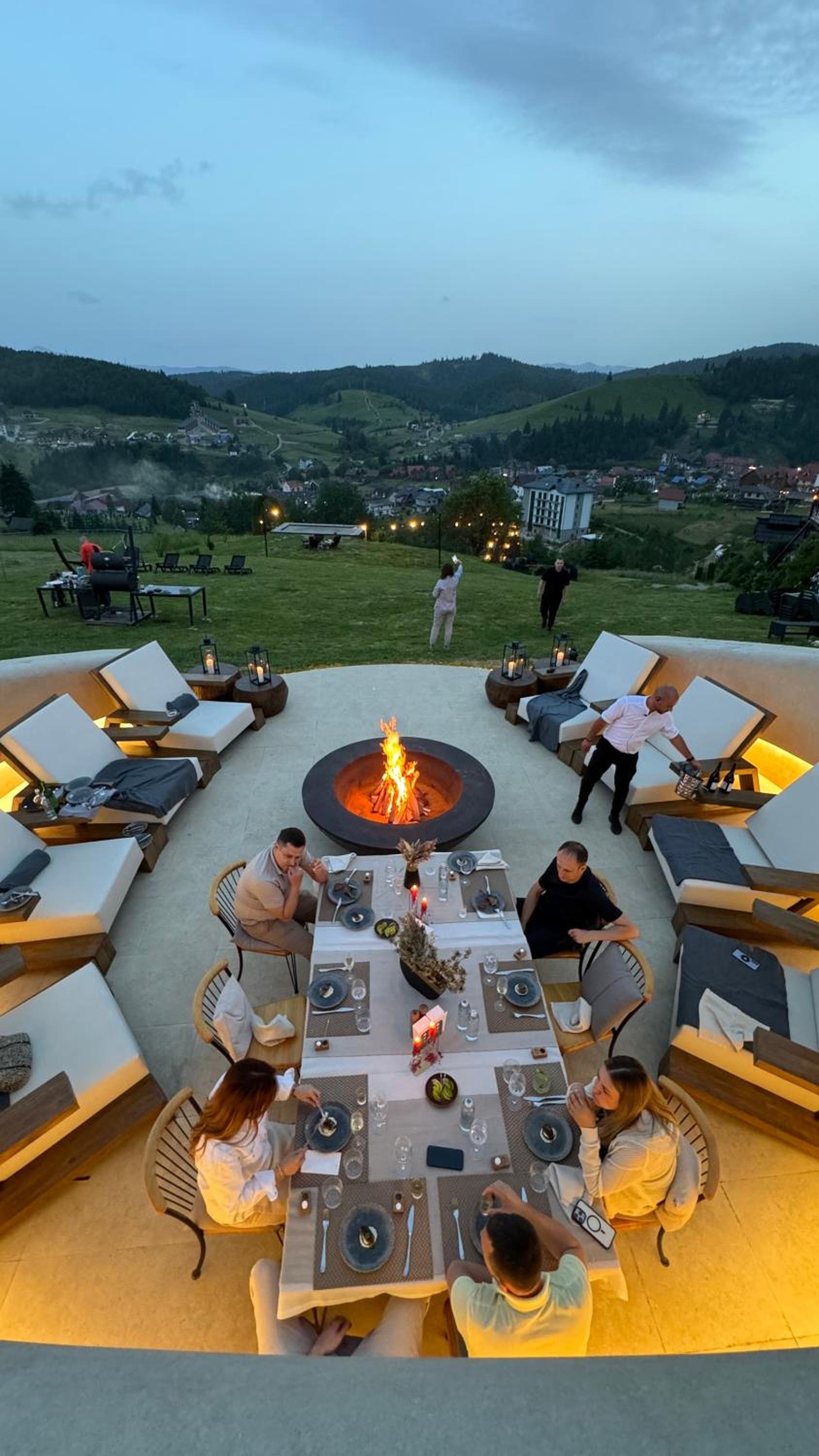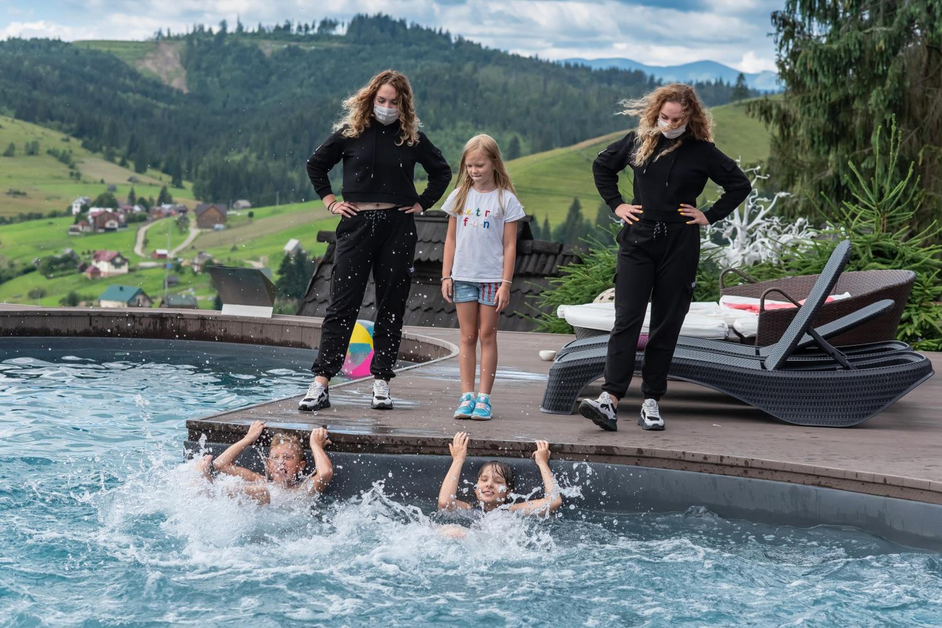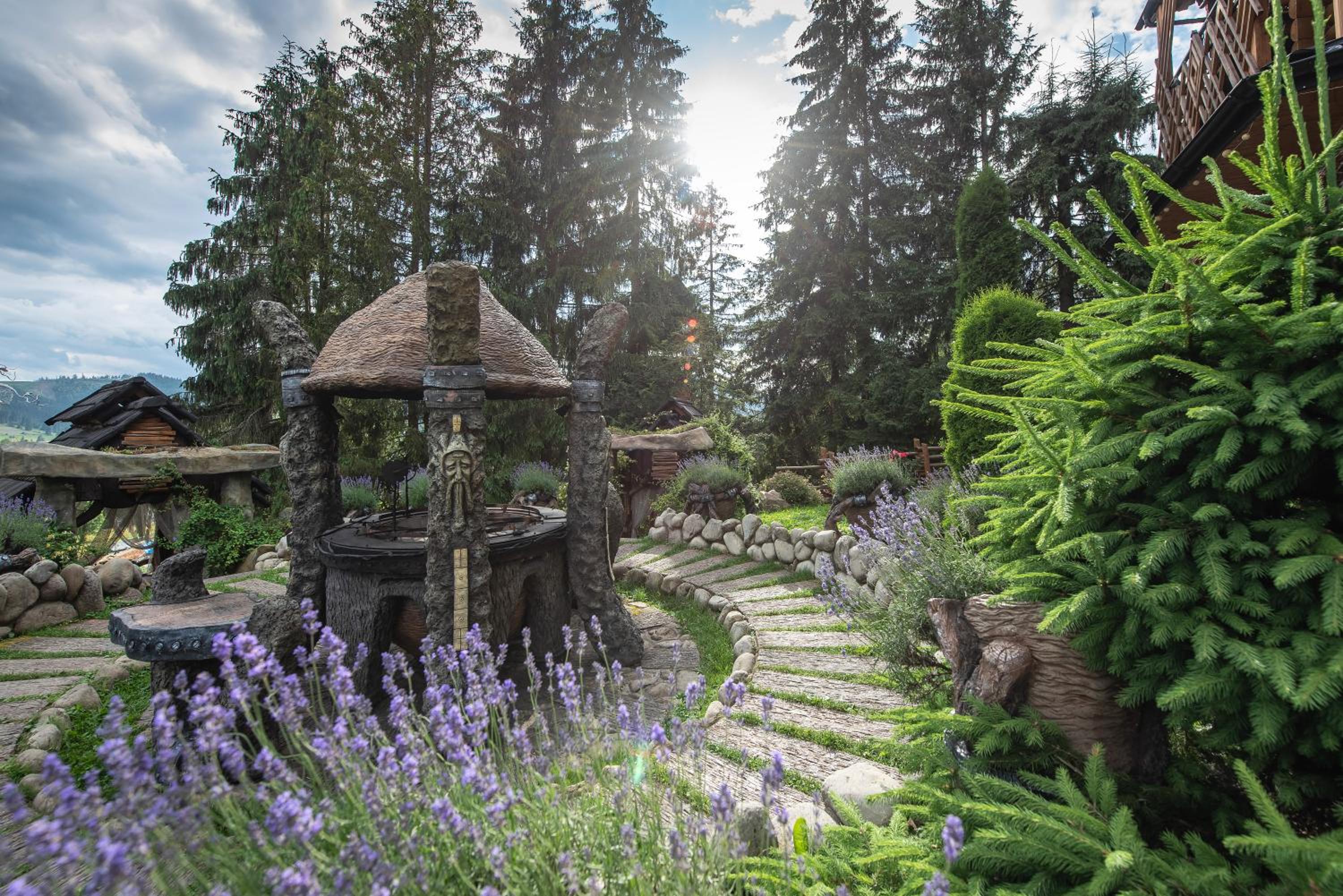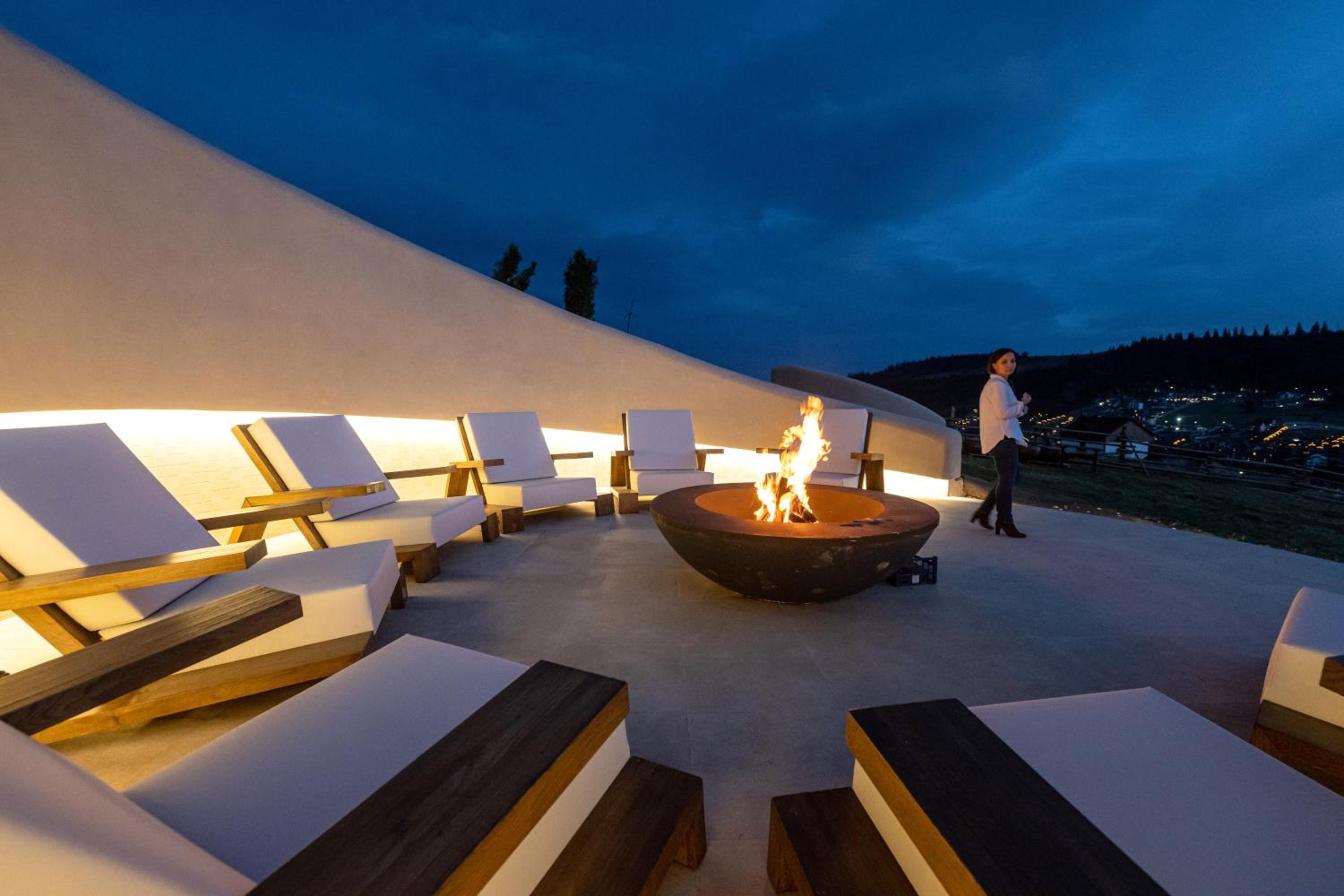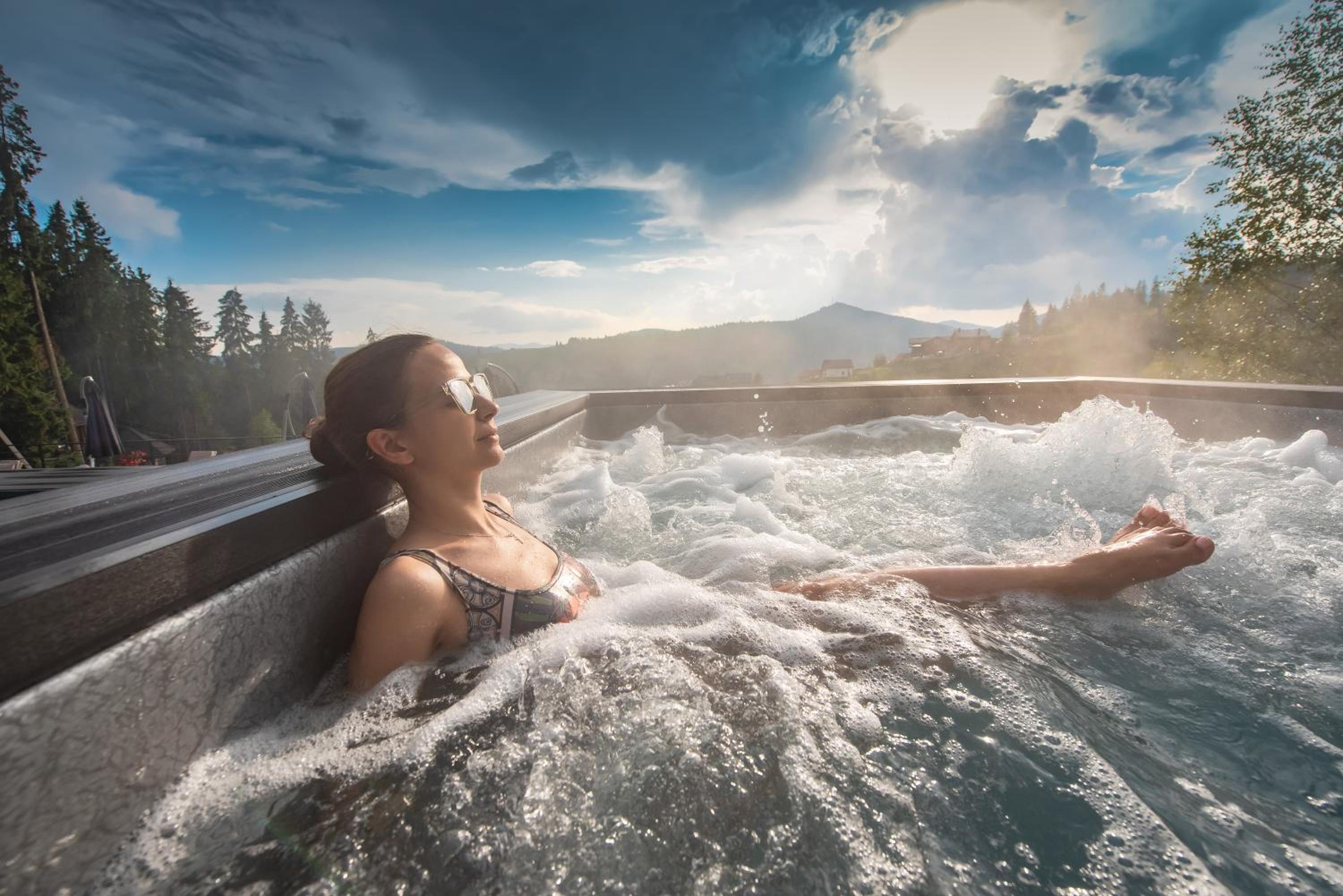 Територія — неймовірна! Все утопає у зелені, казкові фотозони, альтанки, вогнище під зорями, відкритий басейн і джакузі з видом на гори. Це місце ніби створене для перезавантаження й натхнення.