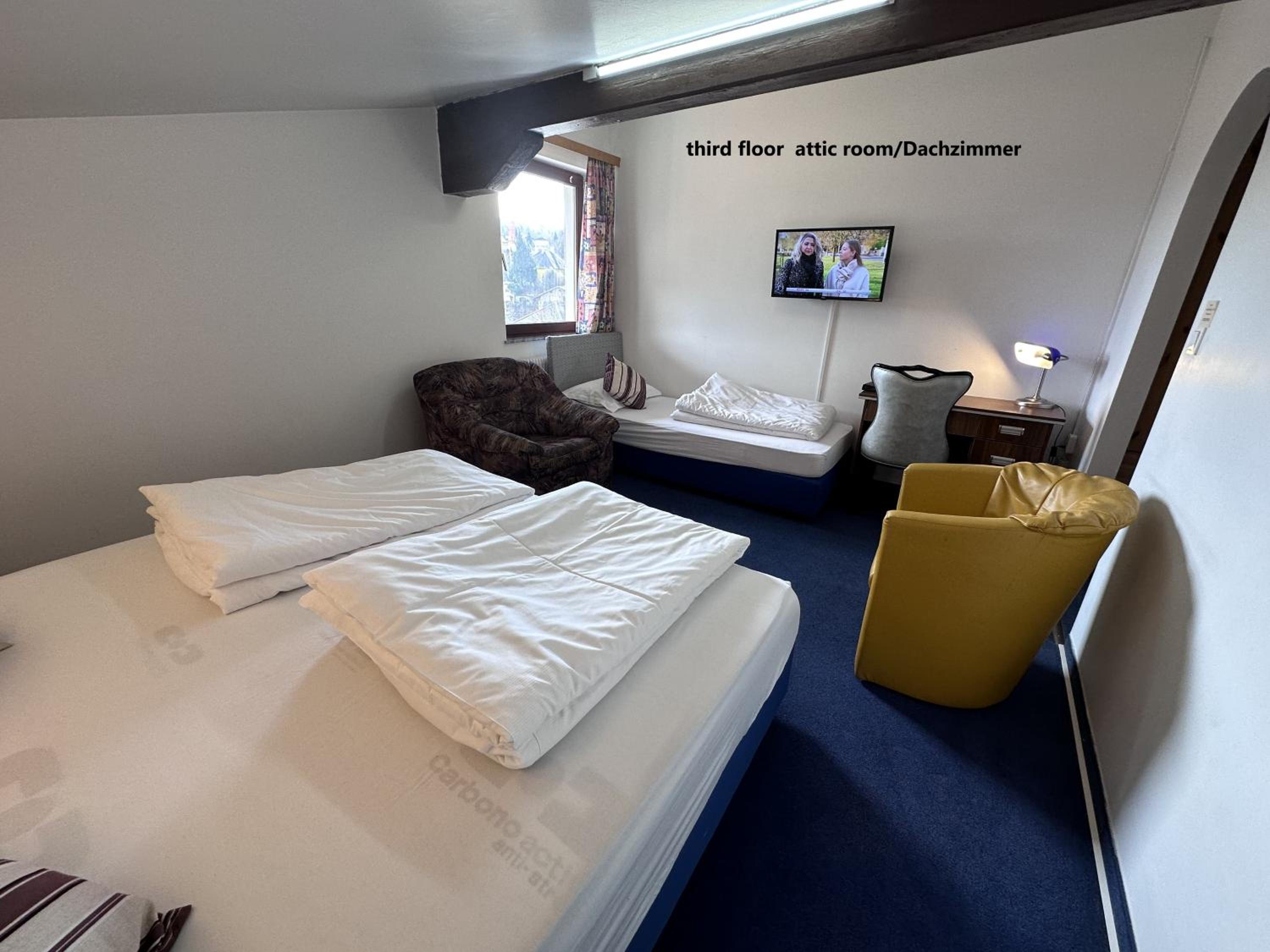Alte Fliesen mit Fugen verschimmelt im Bad und an der Decke Schimmelflecken, Toilette ist Gästetoilette einzeln, so eng, dass man mit dem Kopf an die Tür stößt und es stinkt oenetrant nach Urin, evtl.nur oberflächlich gereinigt. Waschbecken hat mehrere Sprünge in der Keramik. Tapete am Bett ist fleckig und schmutzig.