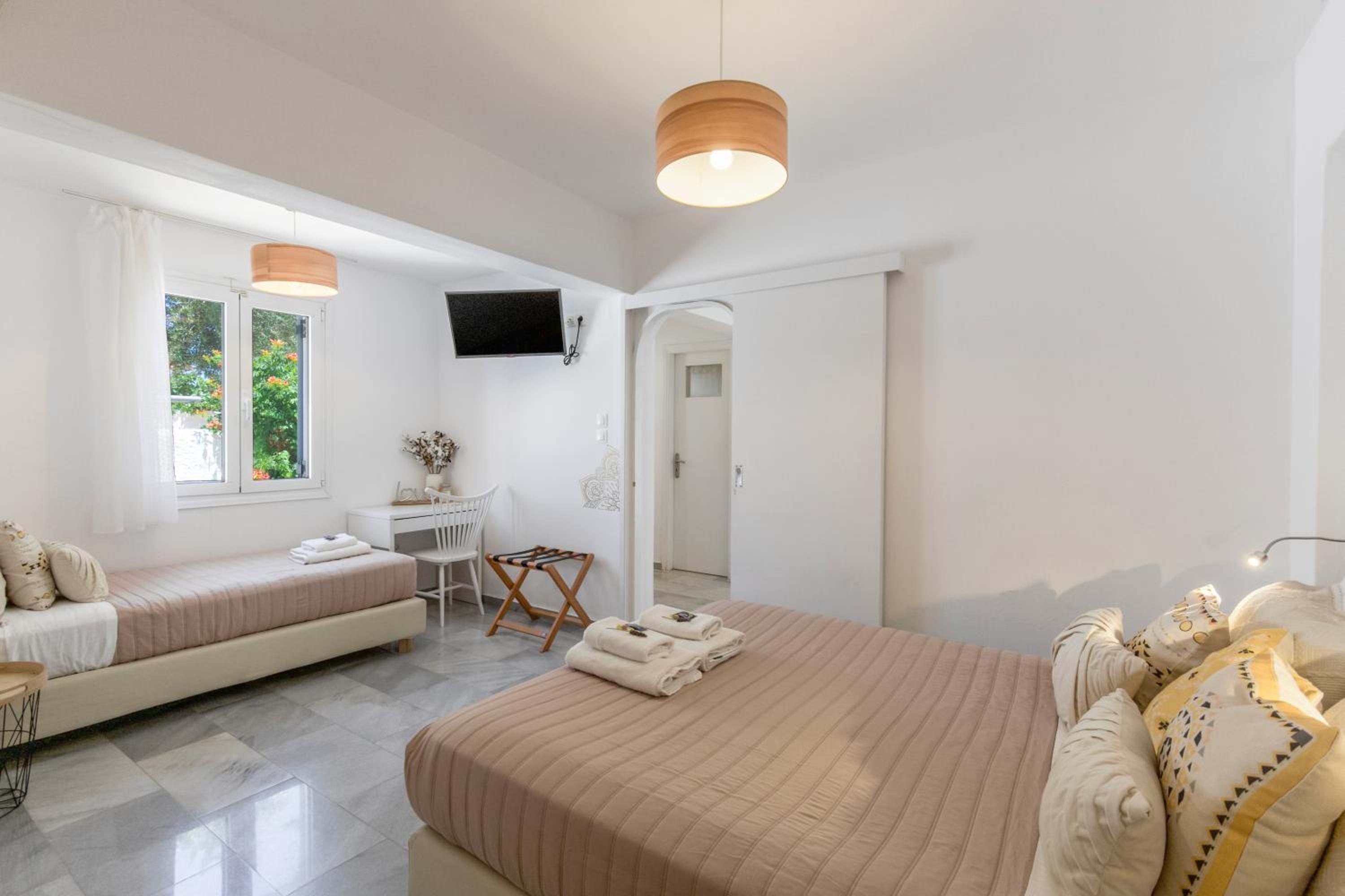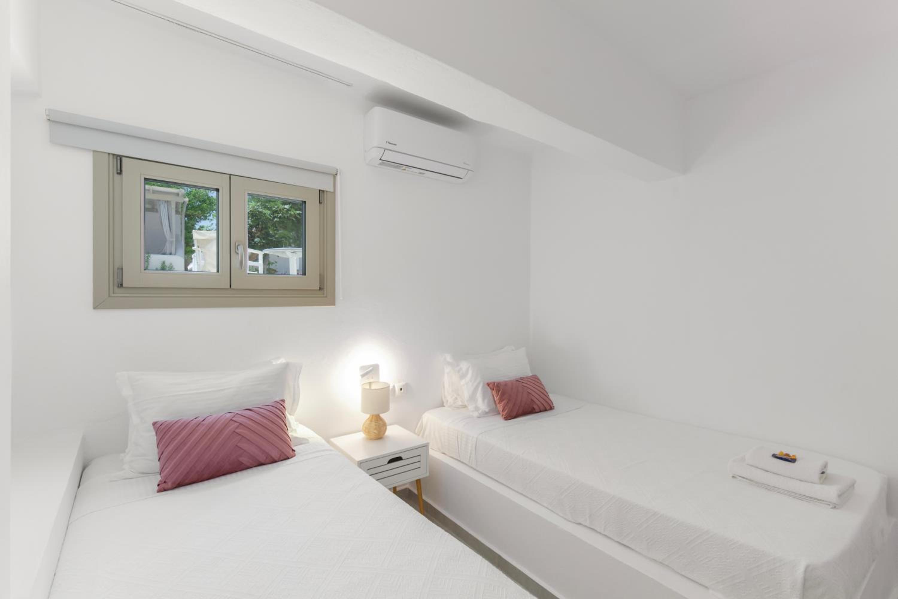 The restaurant at the hotel was fabulous! The beaches were just a short 5-10 minute walk from the room. There were plenty of restaurants nearby as well. Compared to Parikia and Noussa, Ambelas was muchhh quieter and more peaceful.