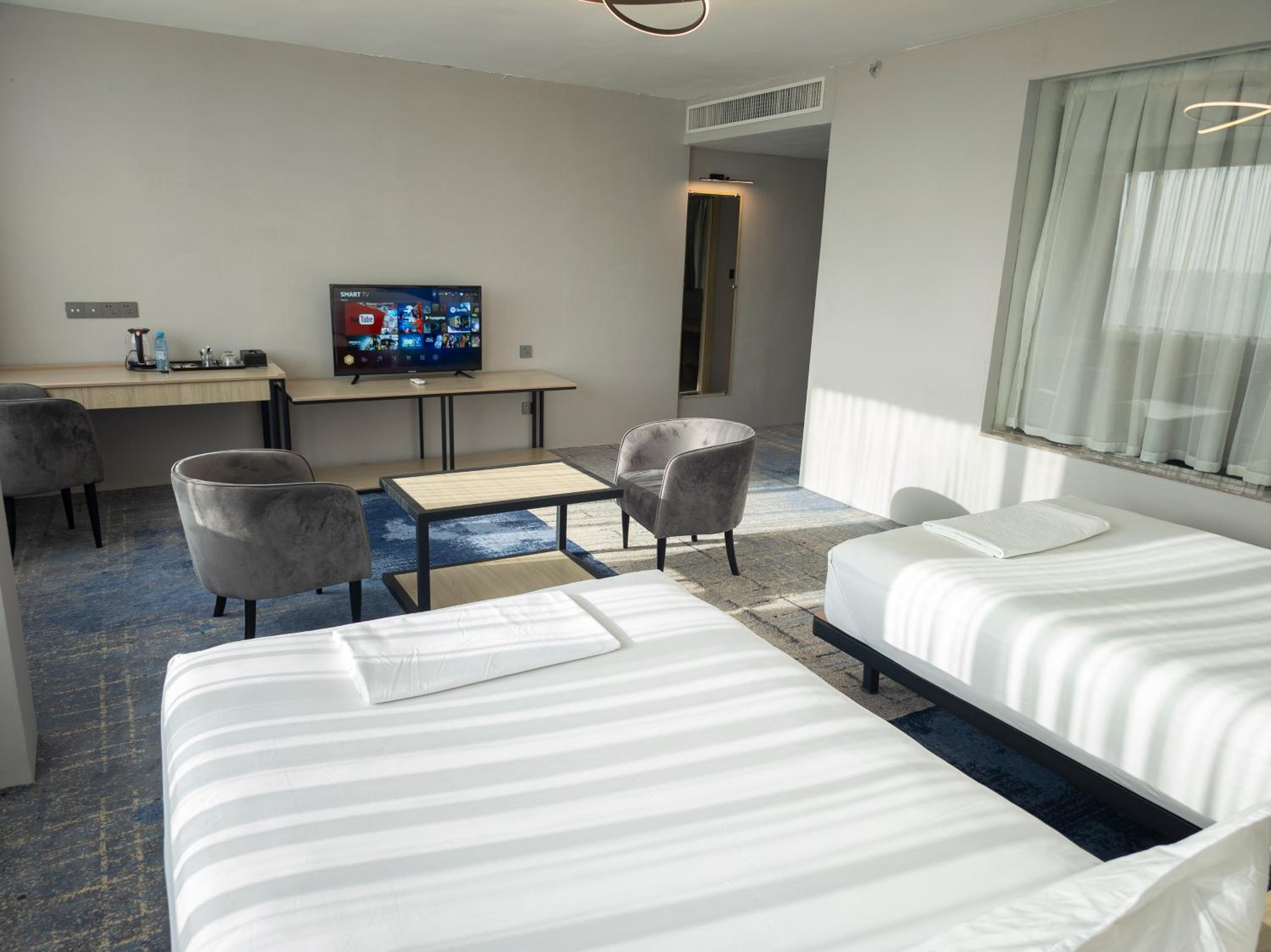 The rooms at the hotel are elegantly furnished and equipped with air conditioning, flat-screen TVs, private bathrooms, and terraces with stunning city views. Guests can also enjoy the convenience of room service and free WiFi.