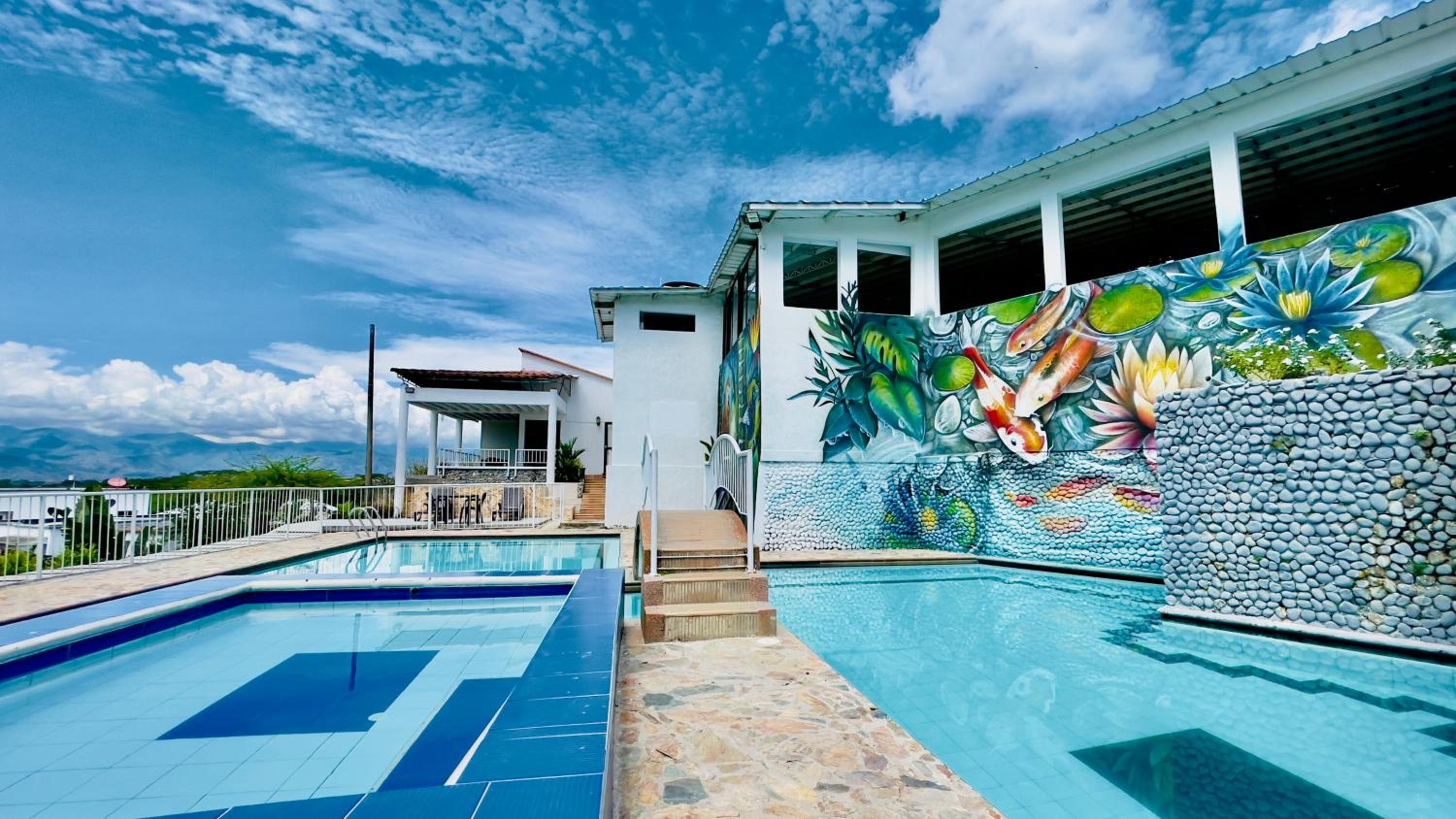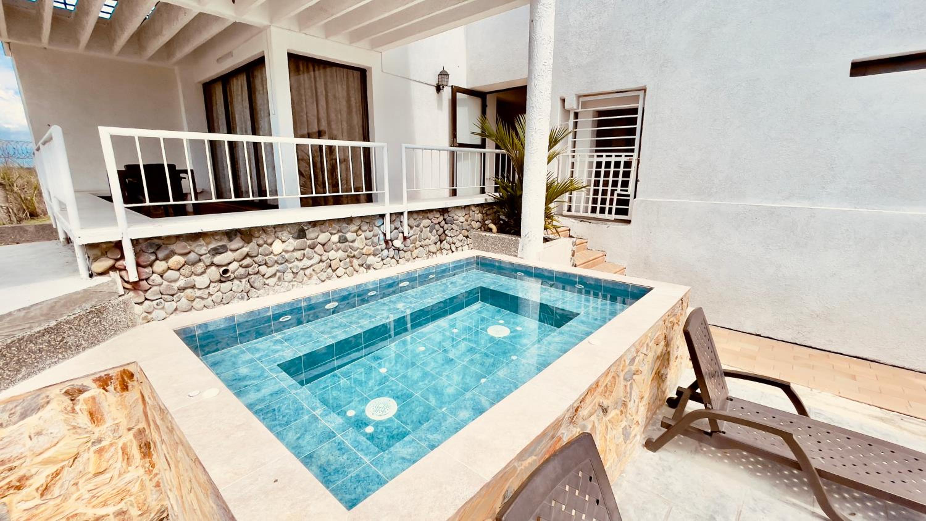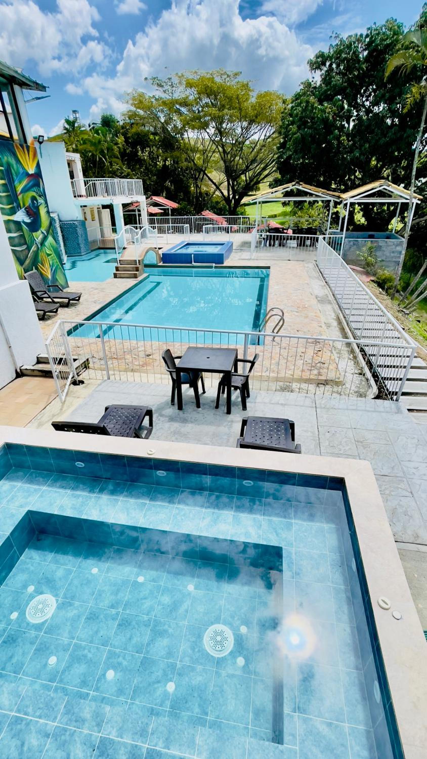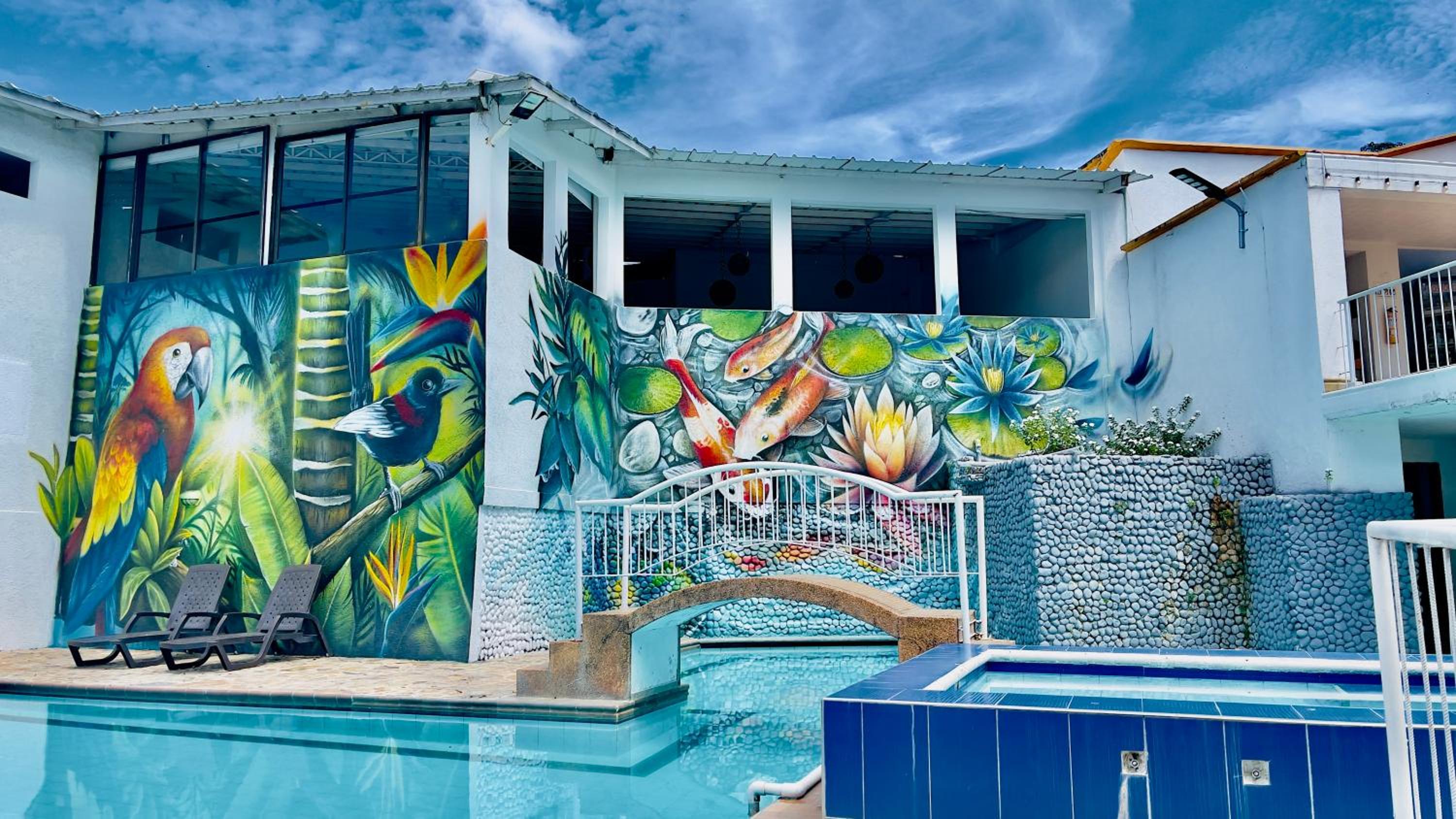 Hotel Loto Del Viento in Cartago boasts an inviting outdoor swimming pool, perfect for a refreshing dip, surrounded by a lush garden where guests can unwind and relax.