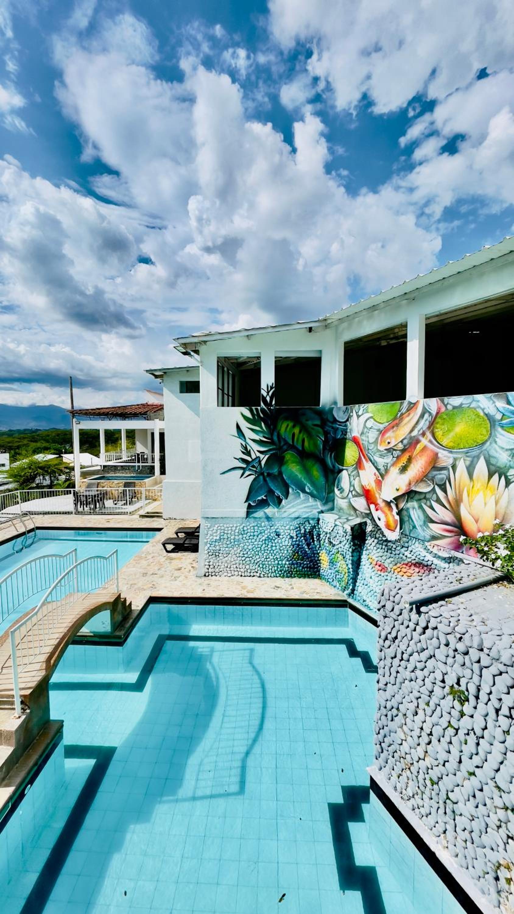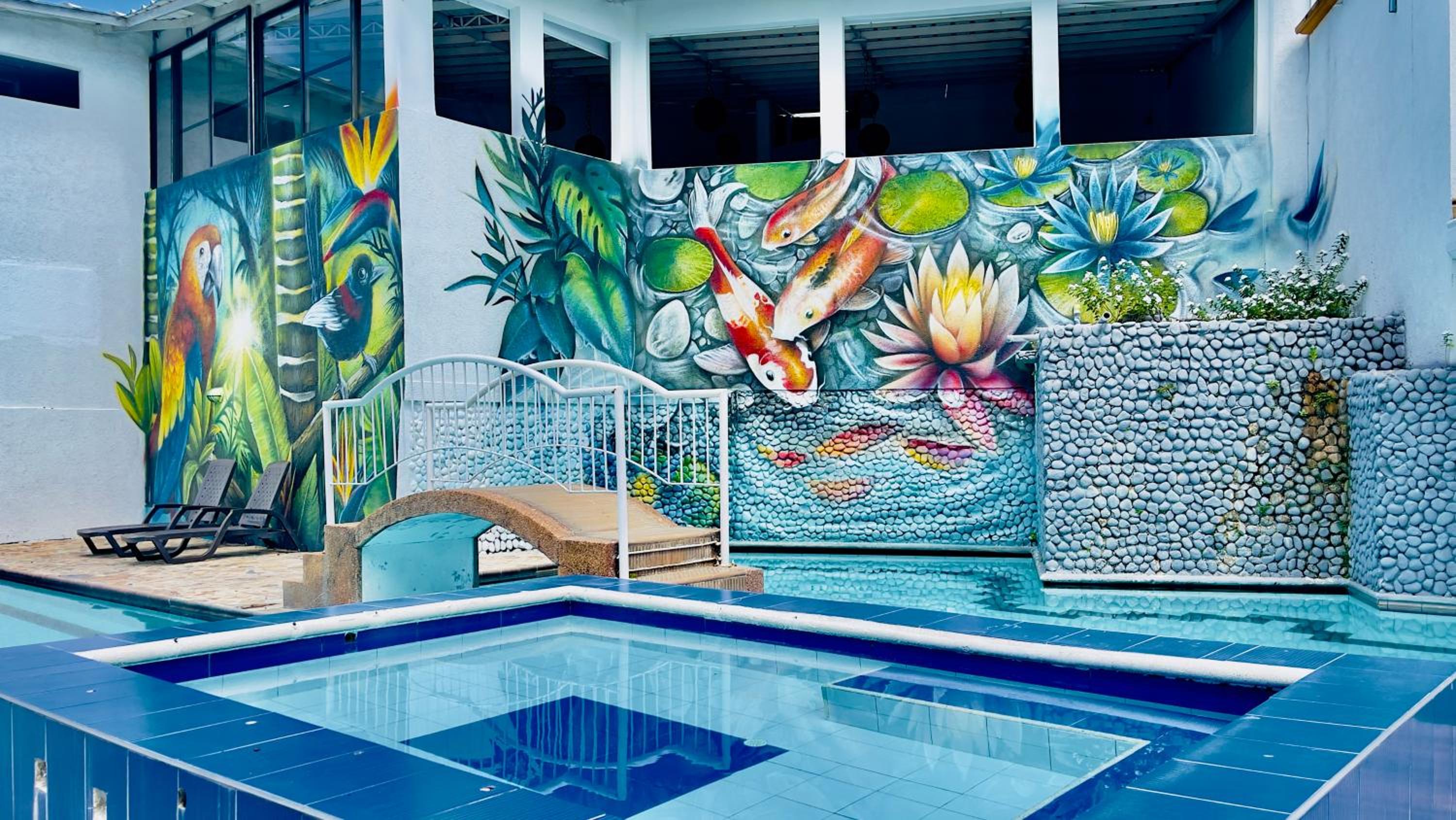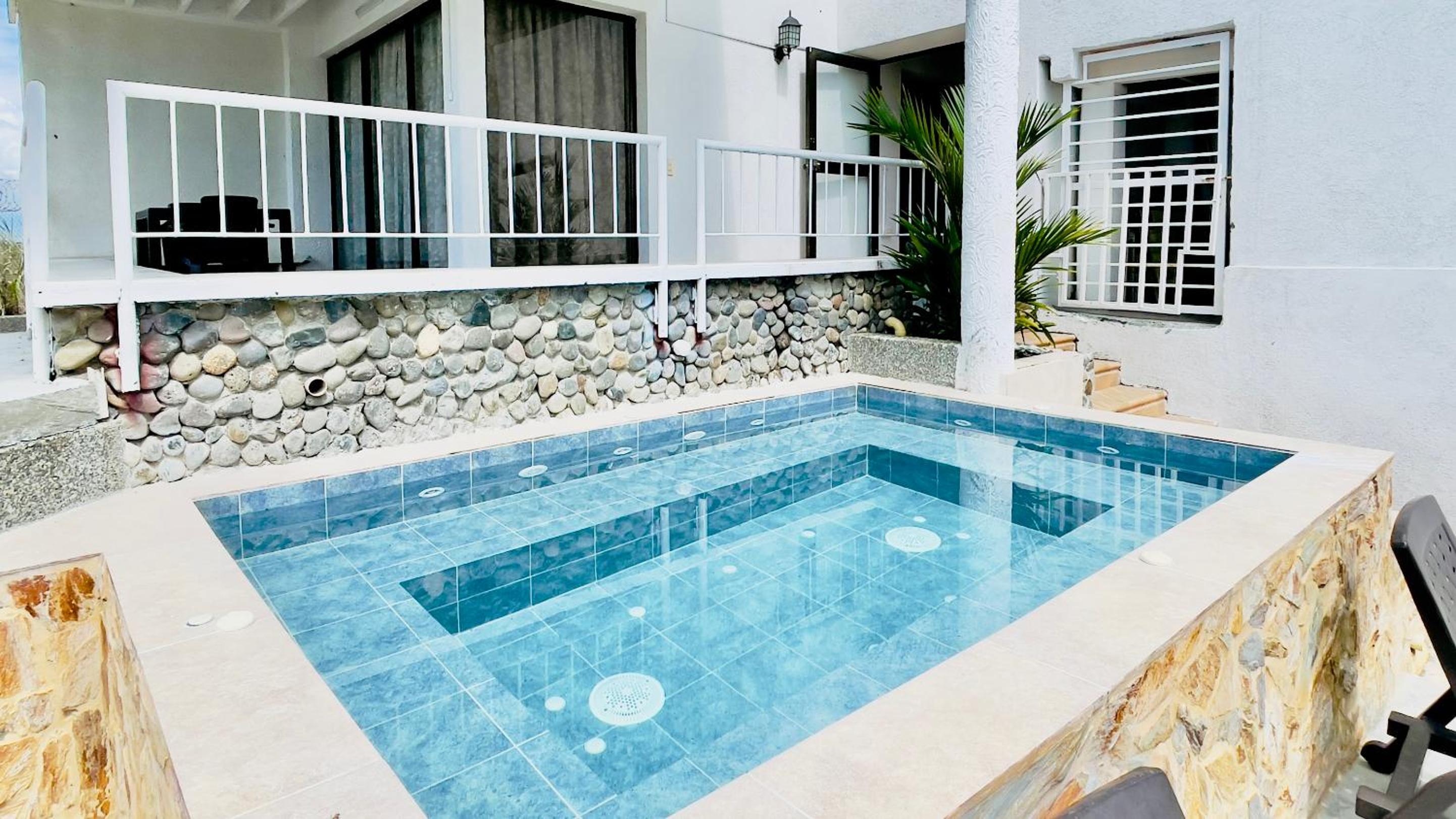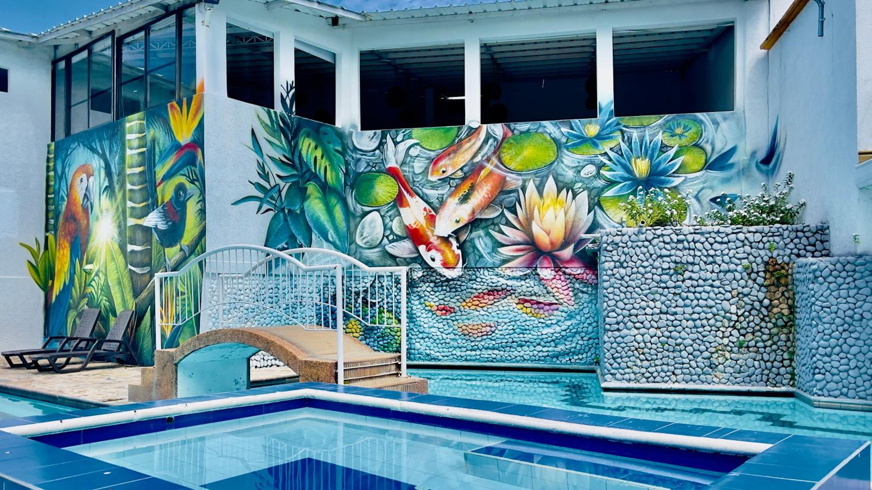 Hotel Loto Del Viento in Cartago boasts an inviting outdoor swimming pool, perfect for a refreshing dip, surrounded by a lush garden where guests can unwind and relax.