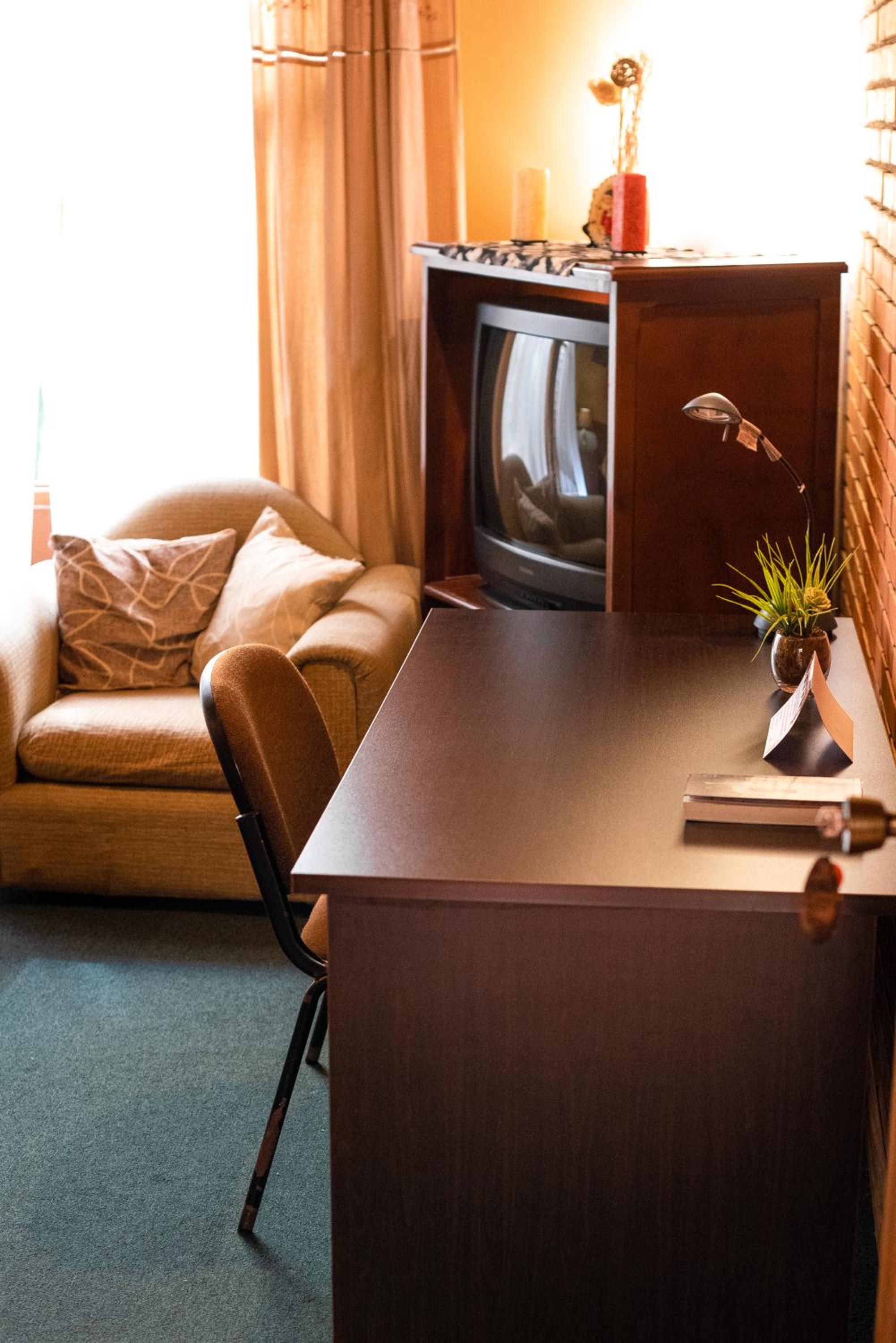 The shower had very little pressure, not possible to wash hair. The room had low voltage light bulbs, not suitable for reading a book, and was very small for 2 persons, just one armchair and a table squeezed in there. The photos show pretty living room with displays of nice objects but we were not invited to sit in there, that maybe private quarters of host?