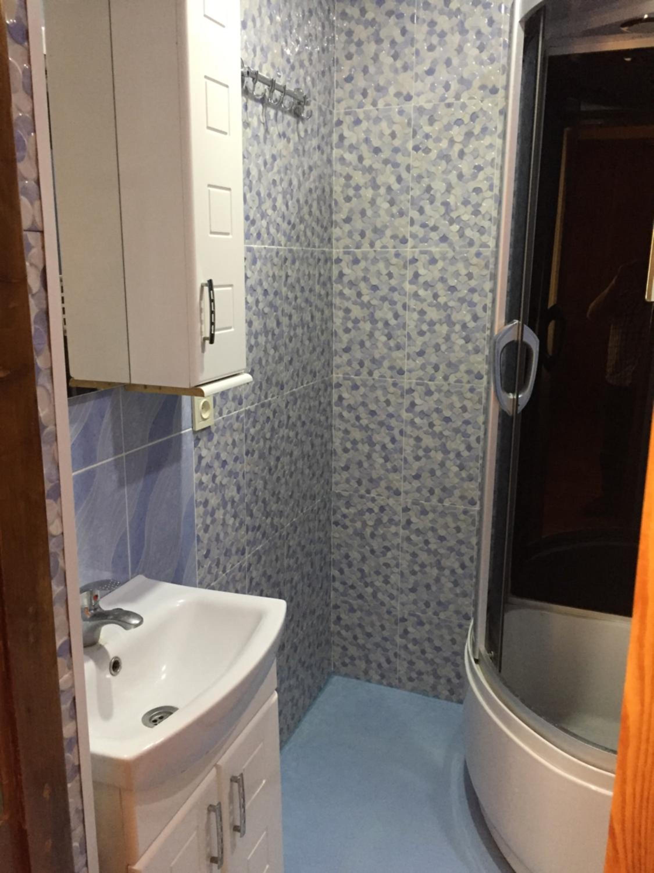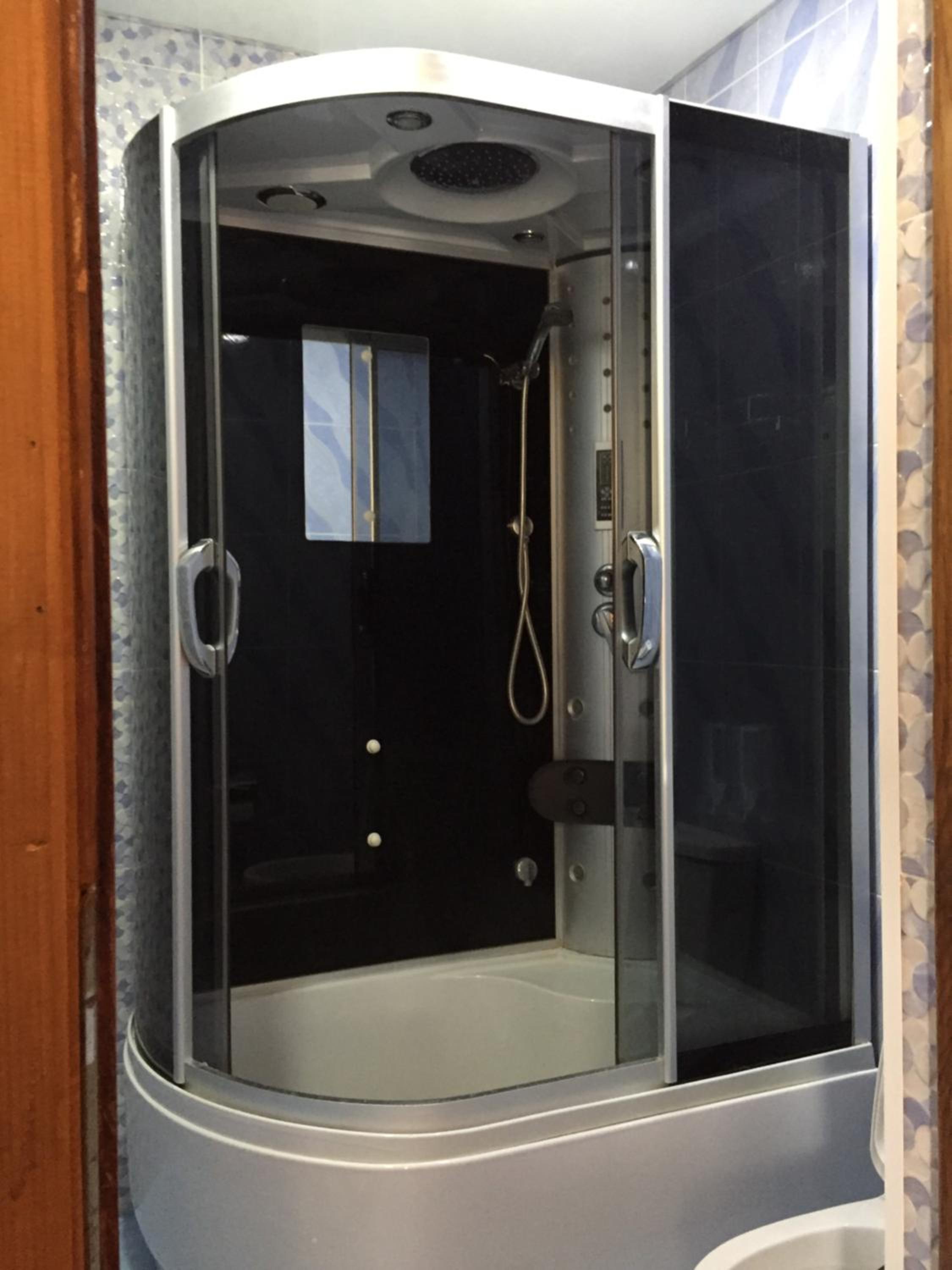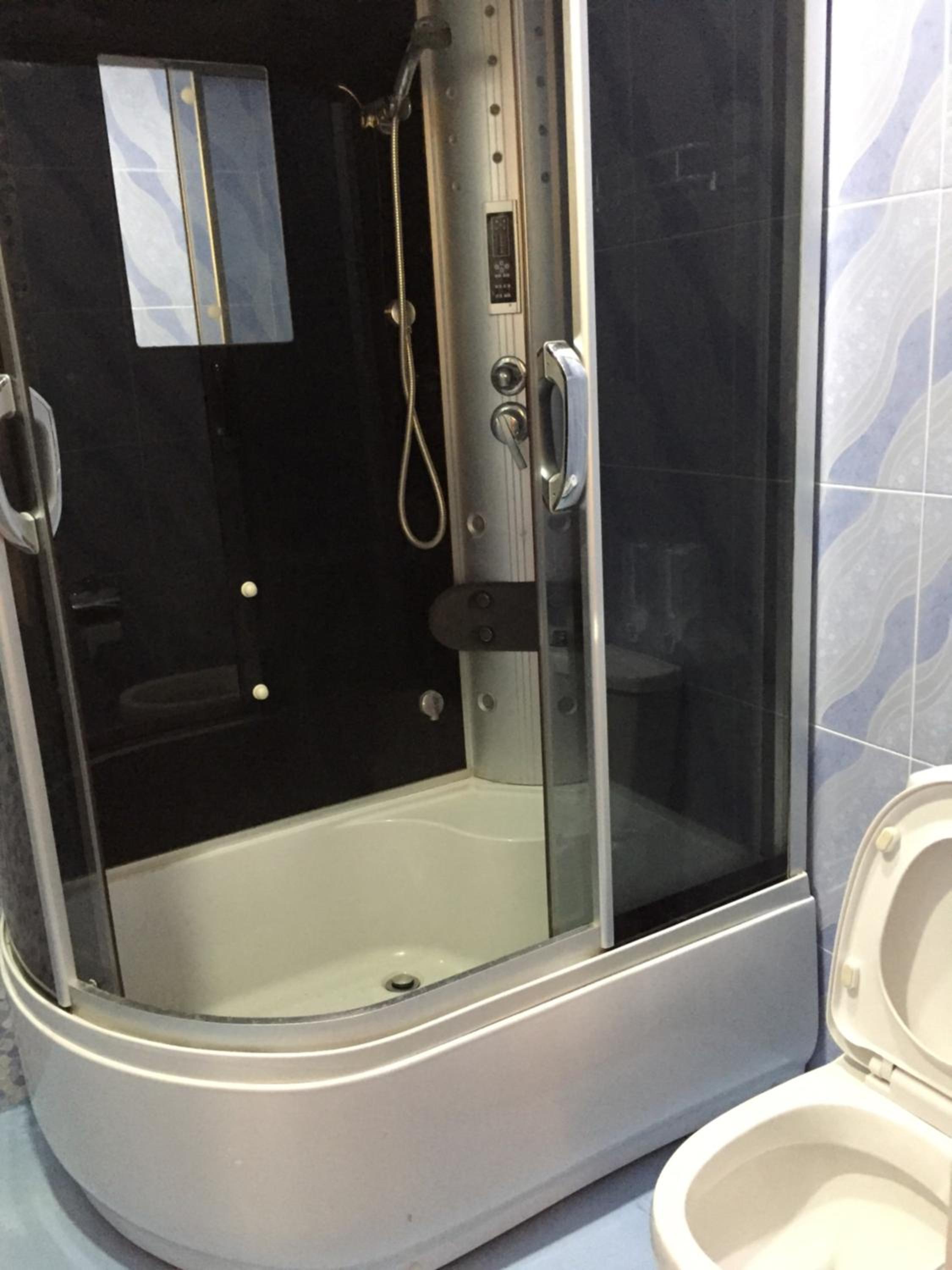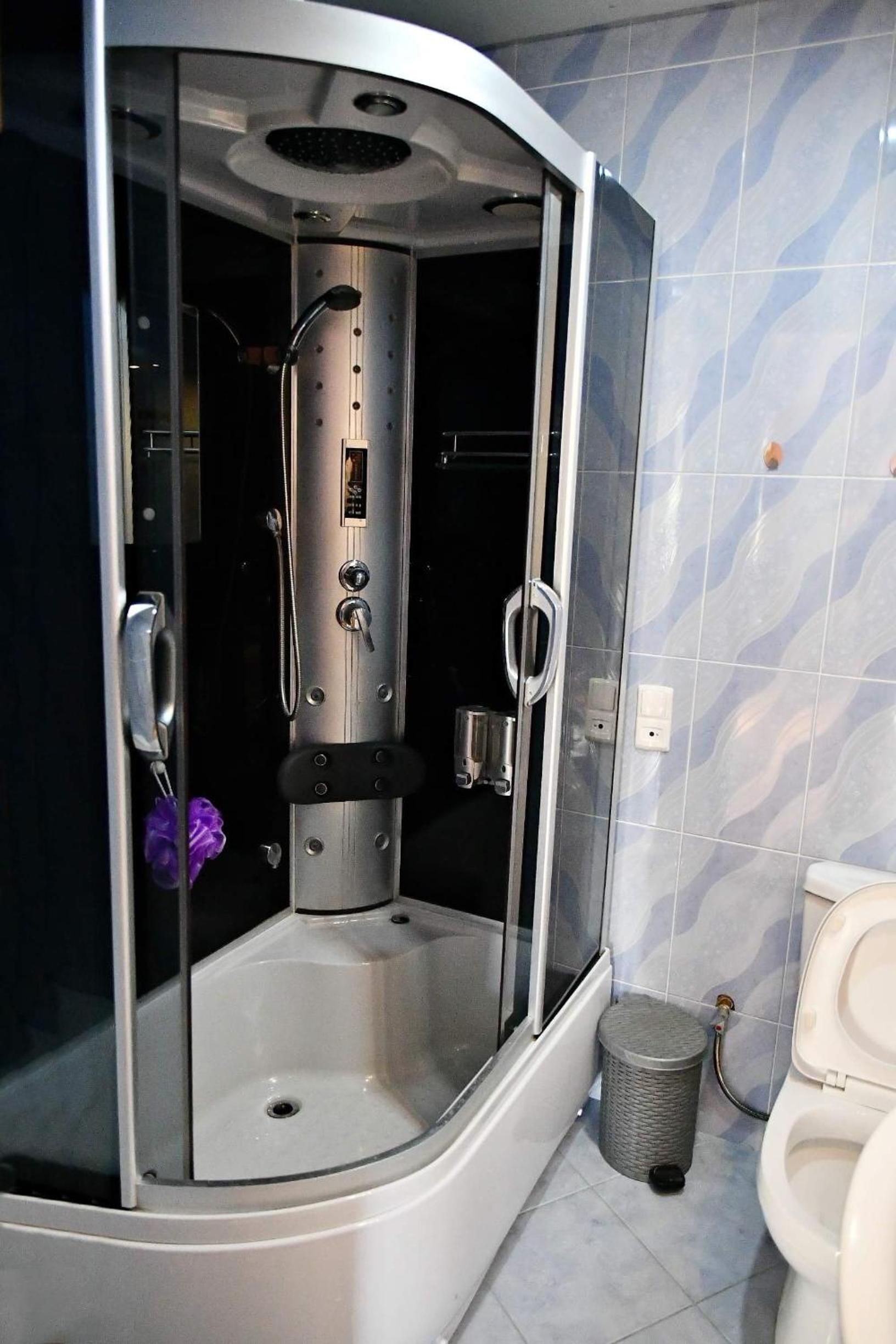 מקלחת מרווחת ומקרר גדול. עיצוב מעניין למקום