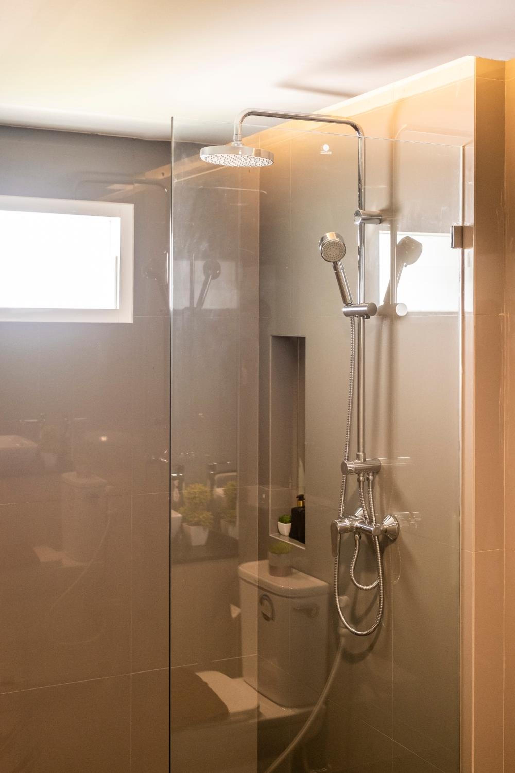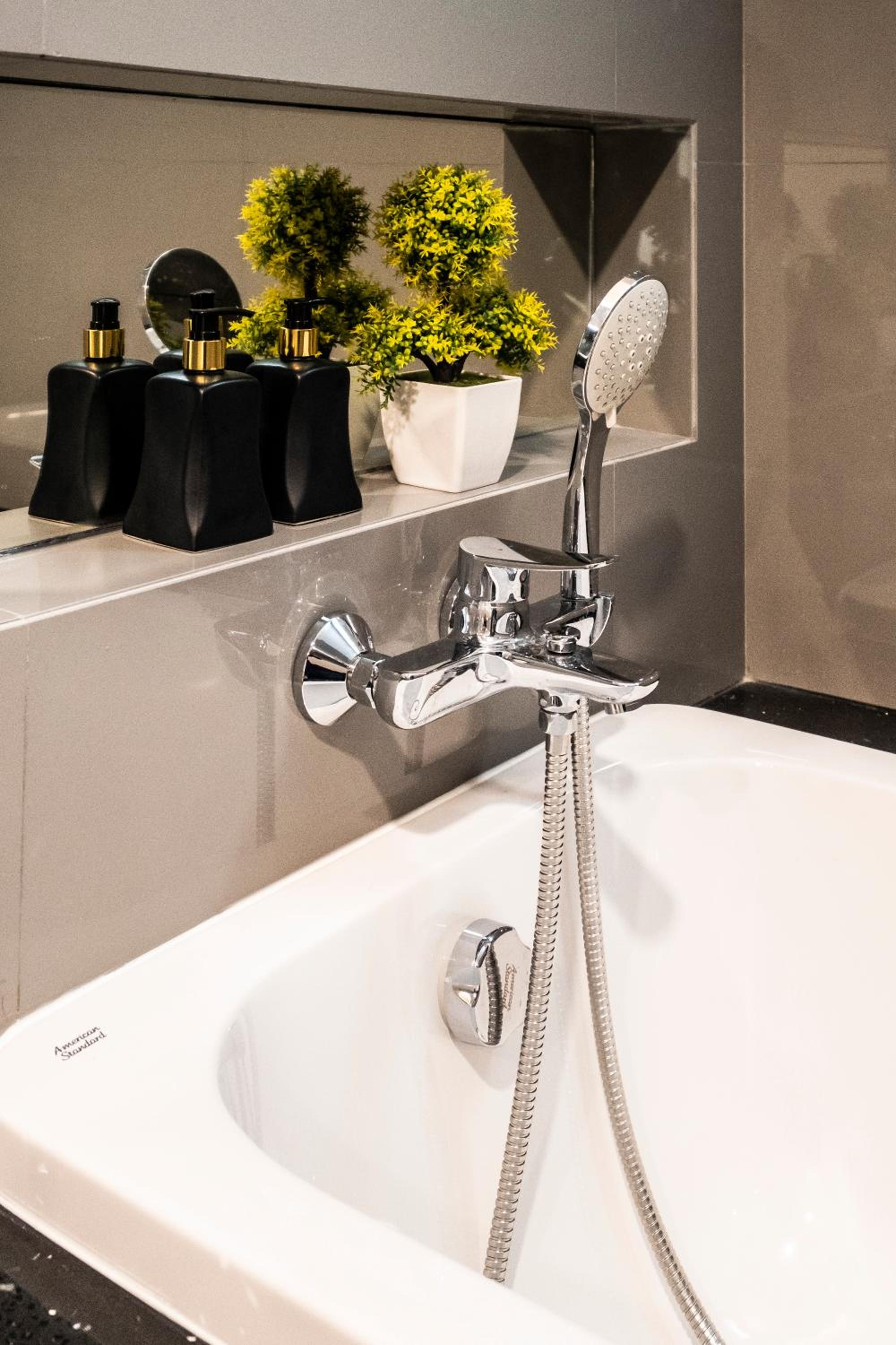 The bath is difficult to get in and out of because it is set in a wide plinth. The shower is an old hand held mixer attached to the bath tap which floods the bathroom when you take a shower. The you have to be very careful getting out of the bath because there is nothing to hold on to when you straddle over the plinth and step onto the now soaking wet slippery tiles.