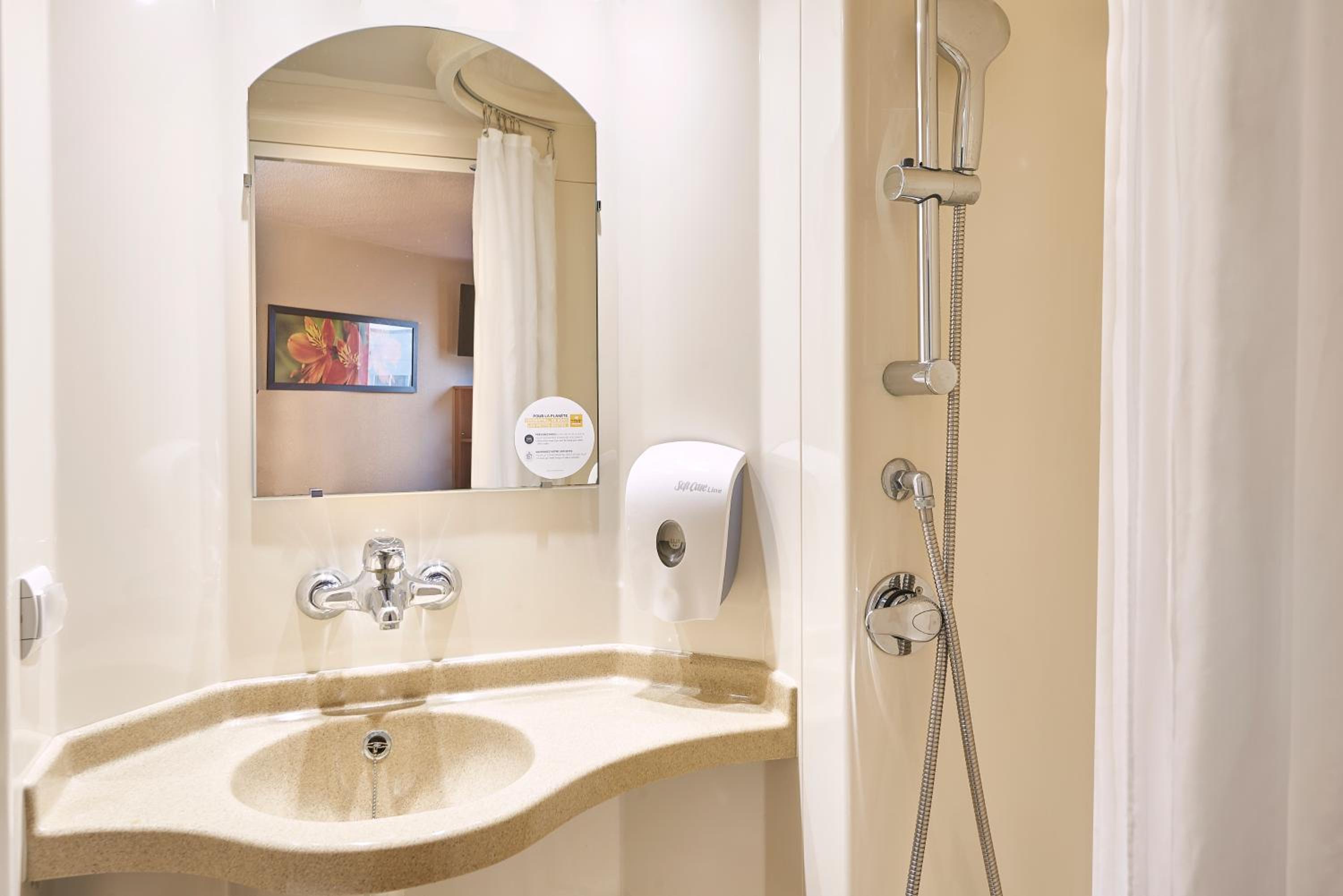 Il manque juste un rideau de douche pour éviter de mettre de l'eau partout dans la salle de bain et du savon dans le distributeur, mais sinon, tout était propre dans la chambre et confortable.