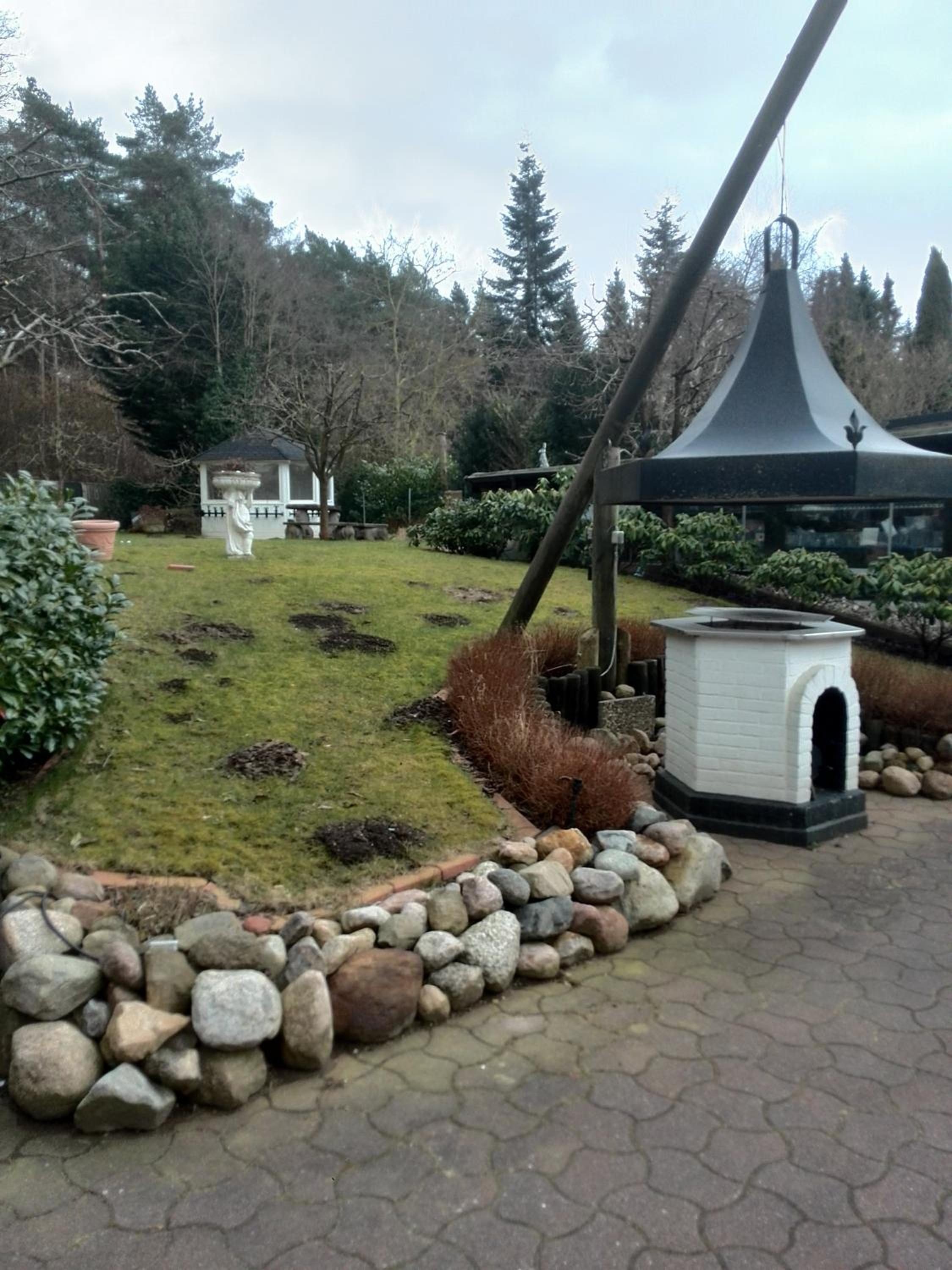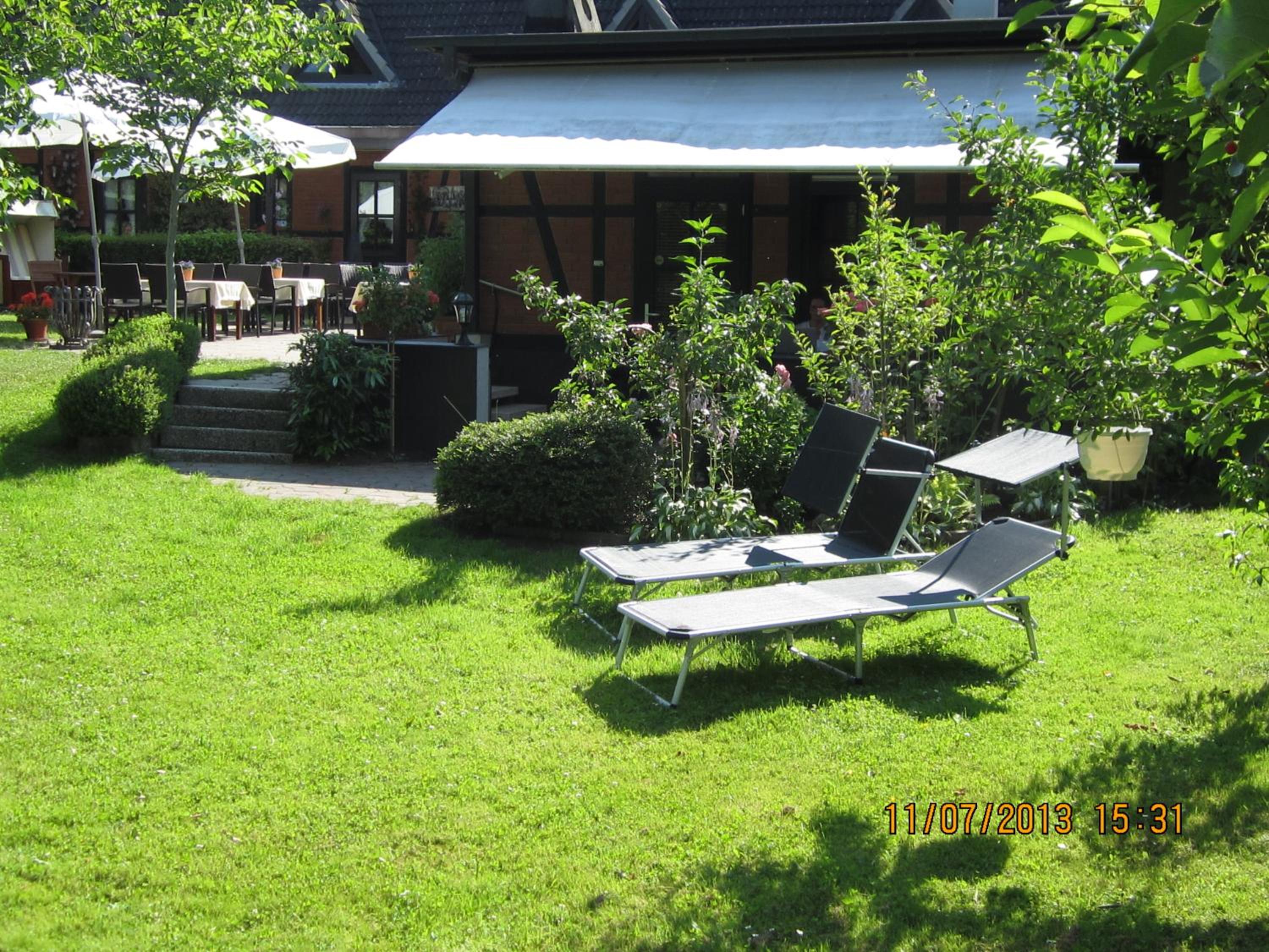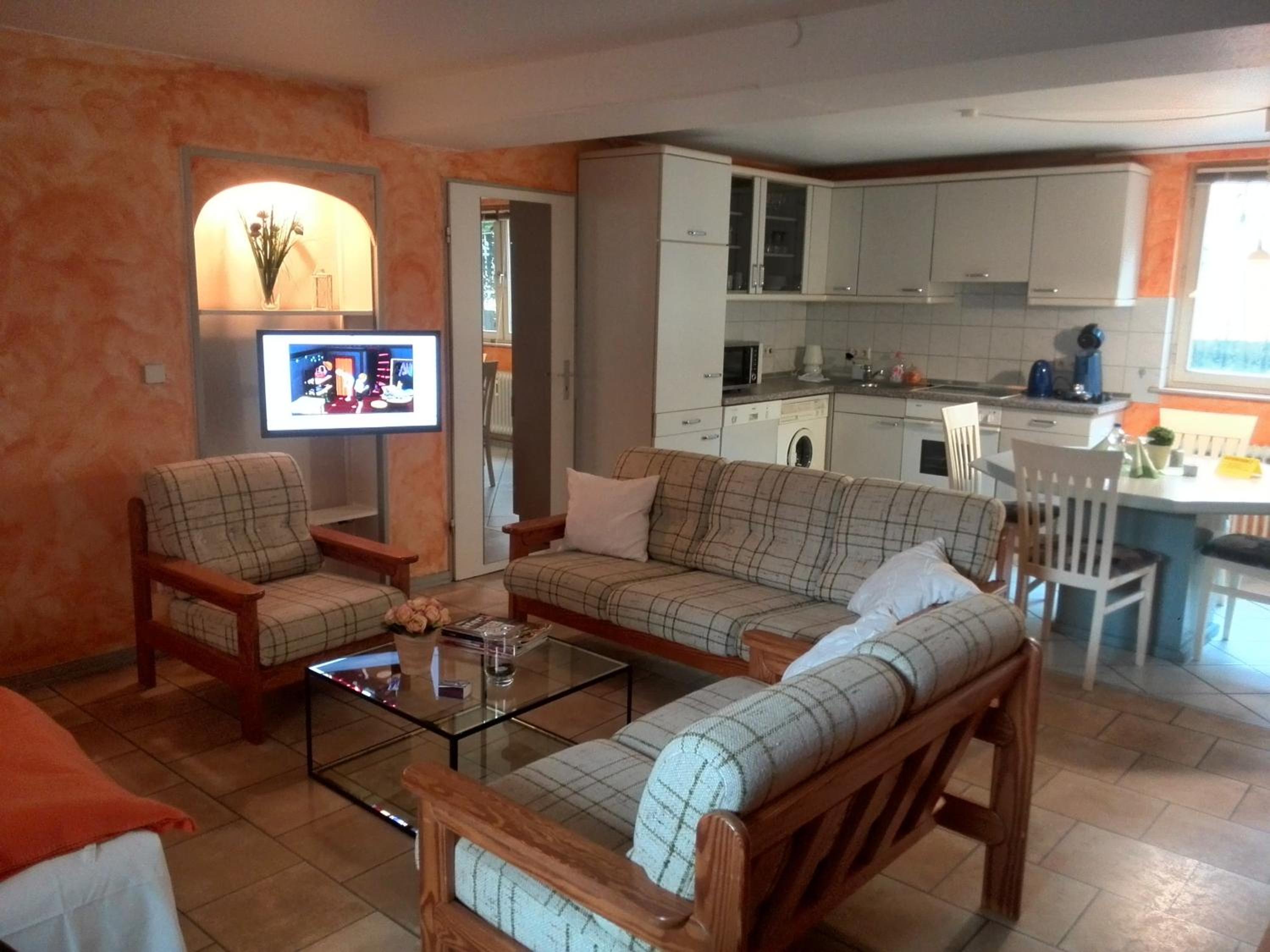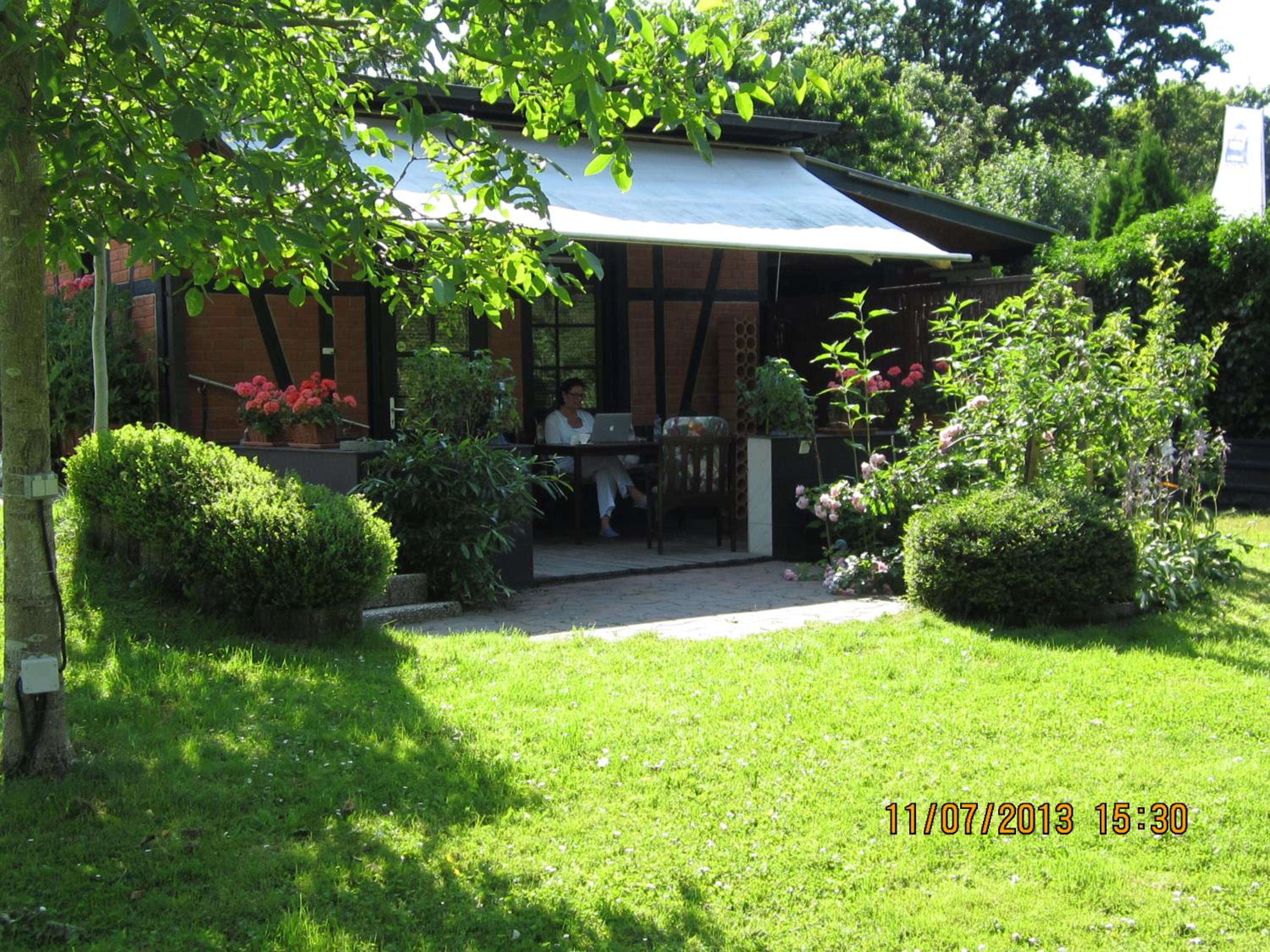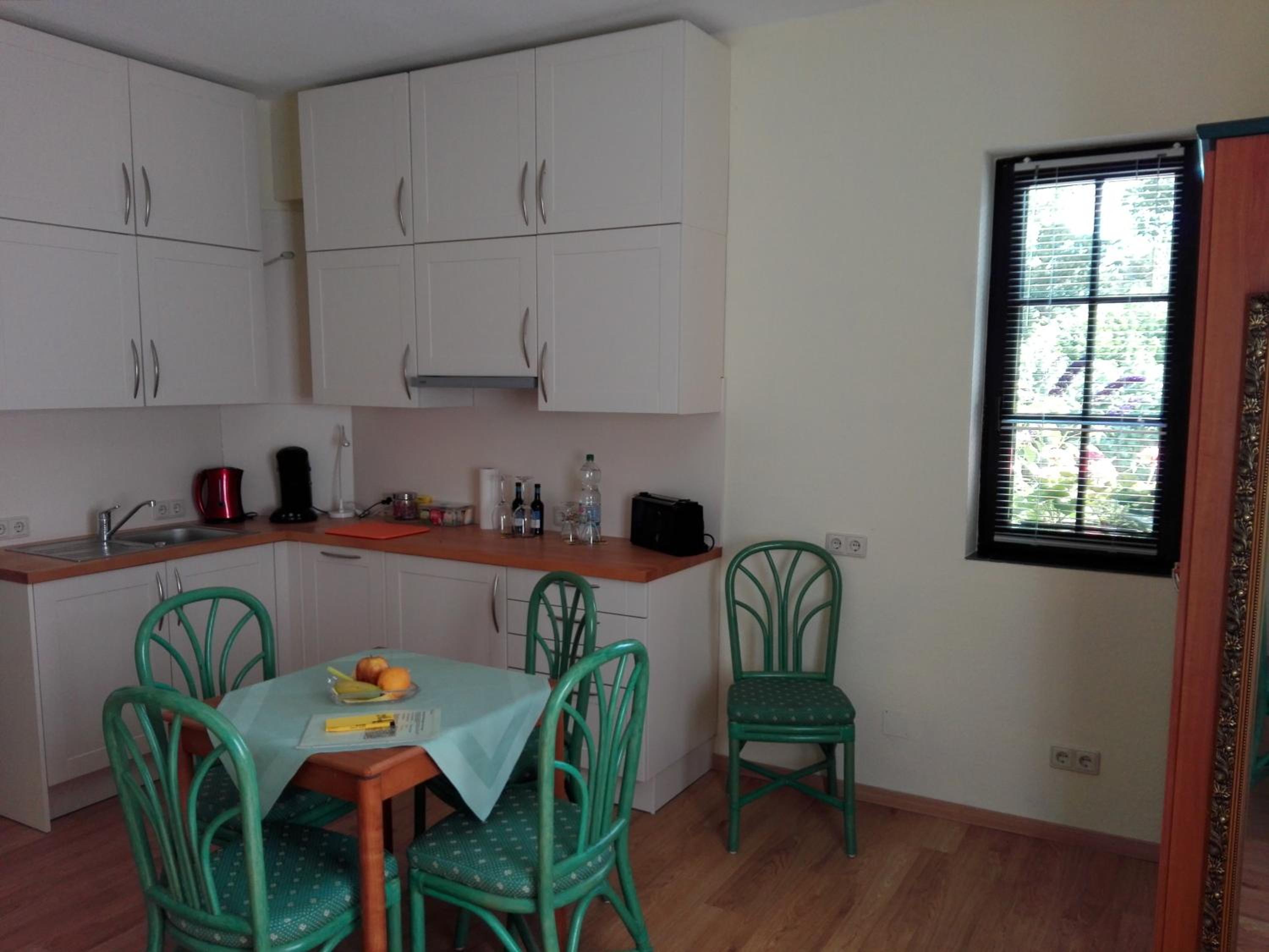Die Terrasse mit Garten. Die kleine Küchenzeile.