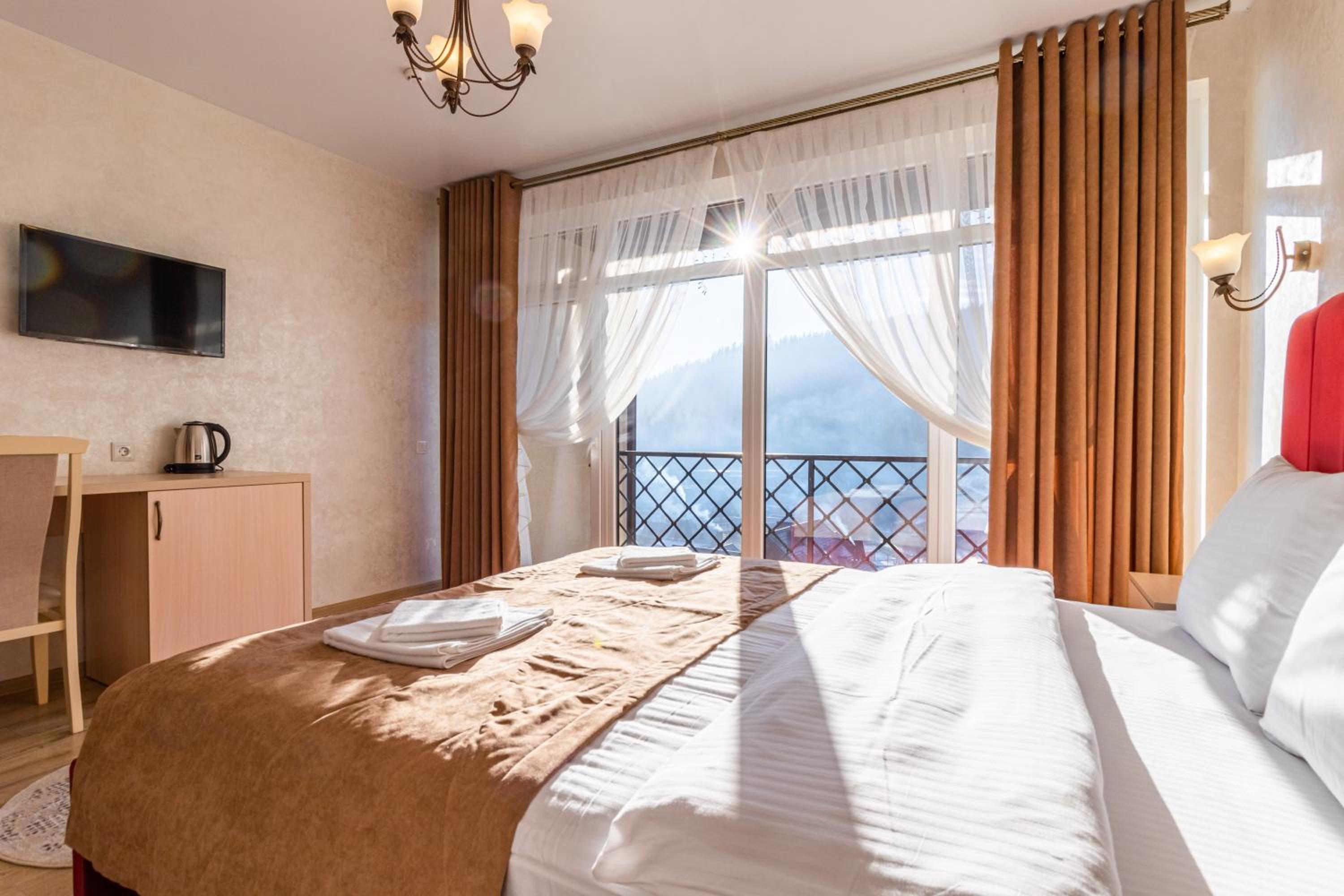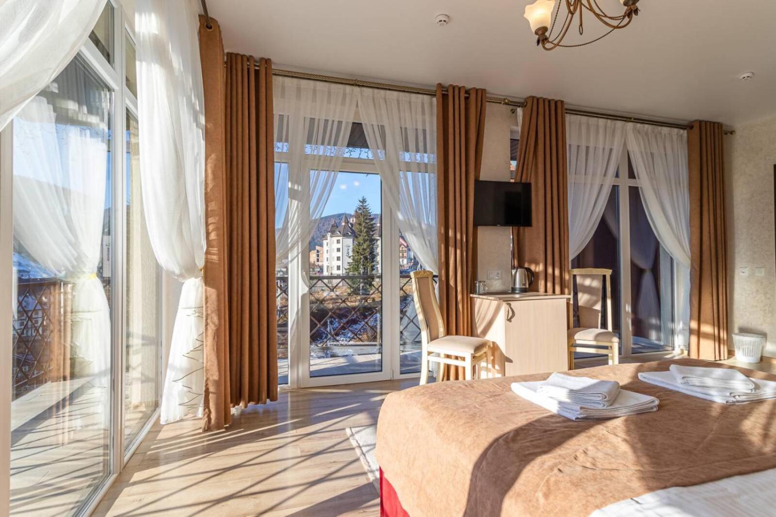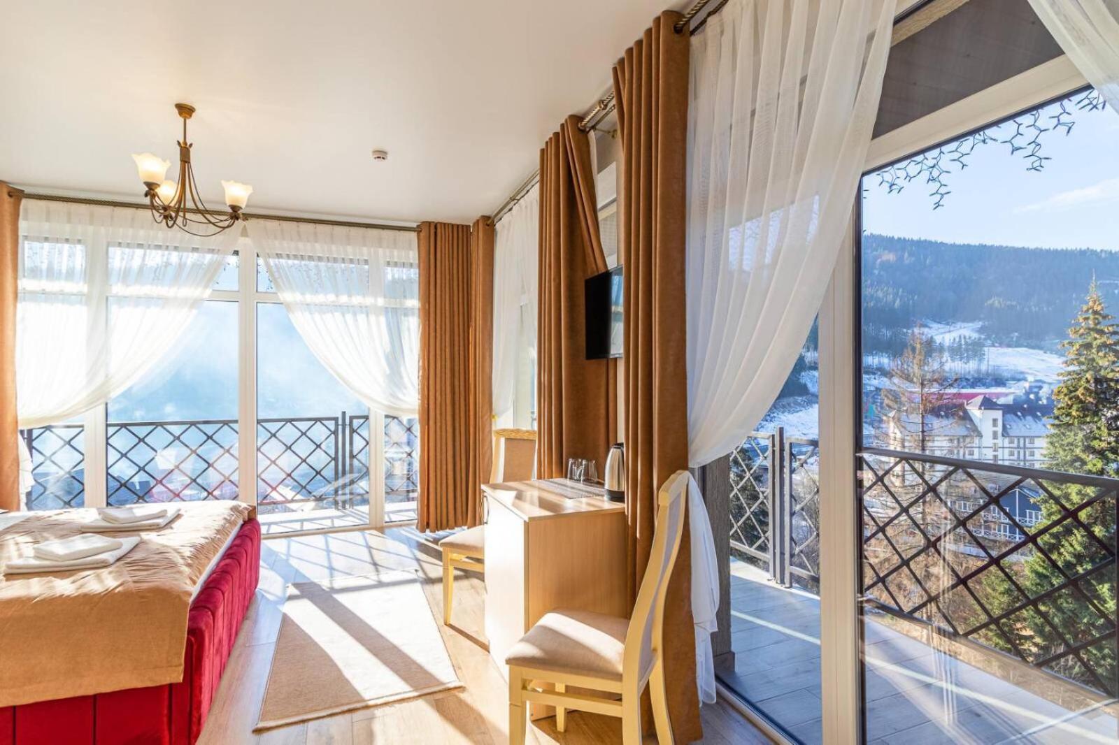 Gold Palace in Bukovel offers a luxurious stay with modern amenities and stunning mountain views. Each room is equipped with a flat-screen TV, fridge, and free WiFi, ensuring a comfortable and convenient experience for all guests.