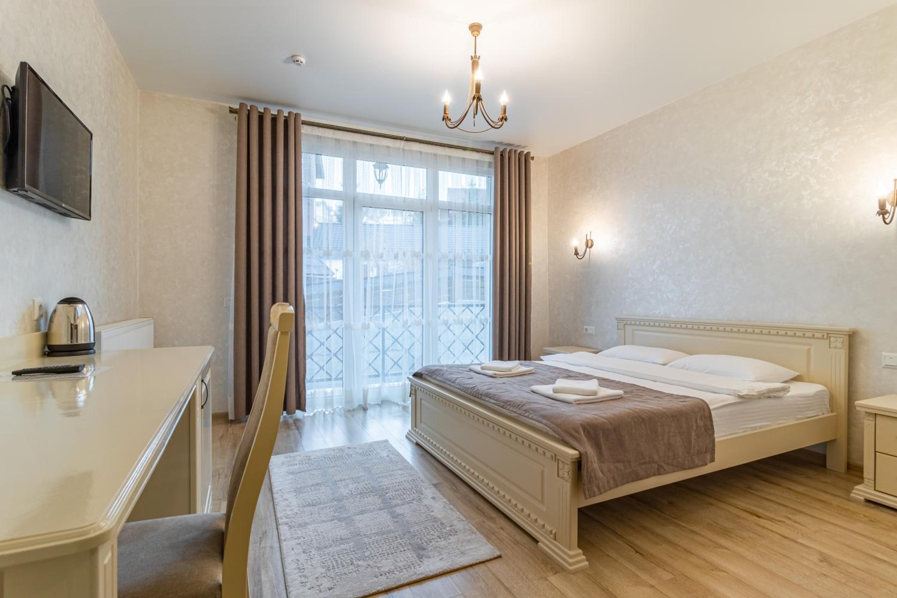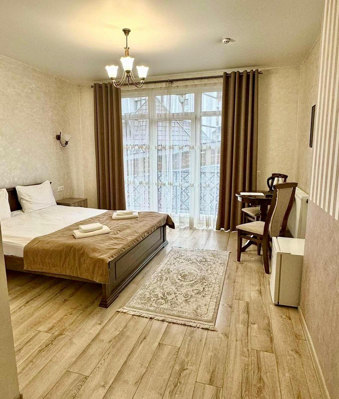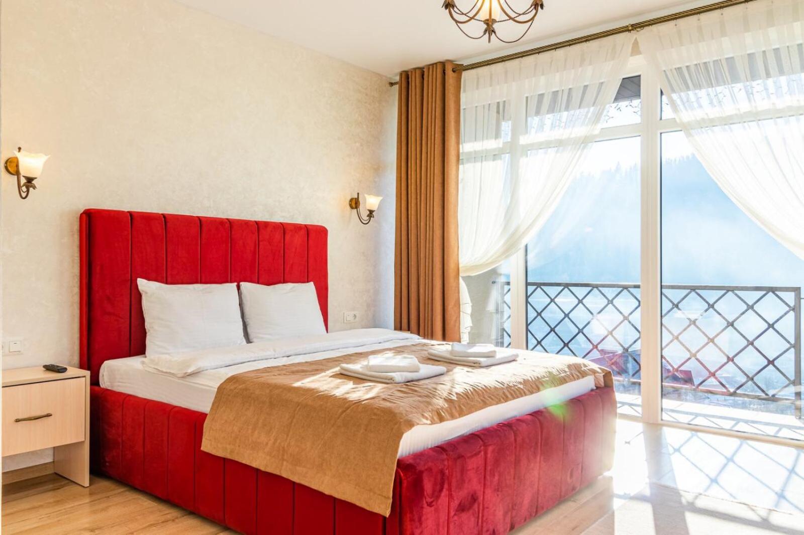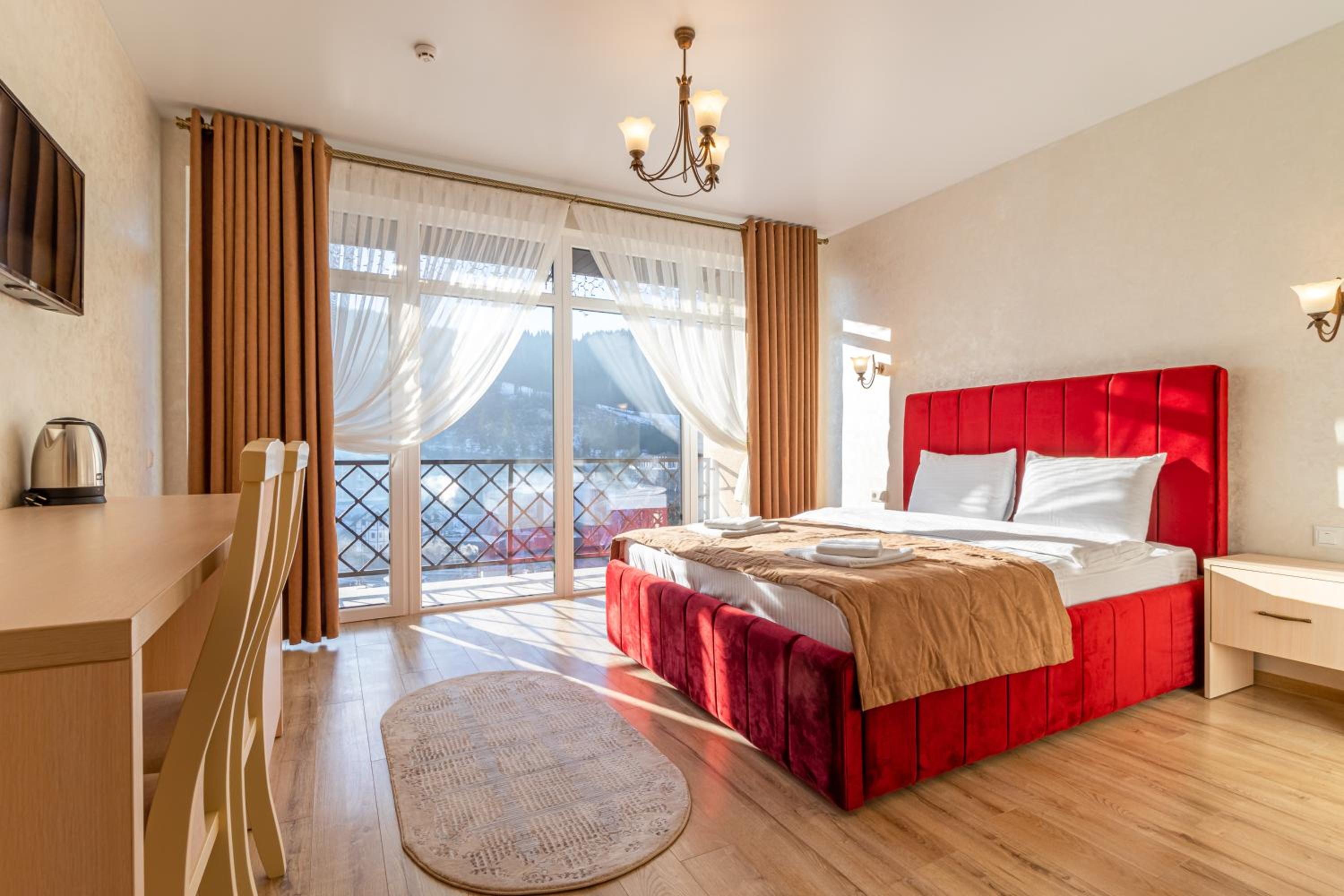 Gold Palace in Bukovel offers a luxurious stay with modern amenities and stunning mountain views. Each room is equipped with a flat-screen TV, fridge, and free WiFi, ensuring a comfortable and convenient experience for all guests.