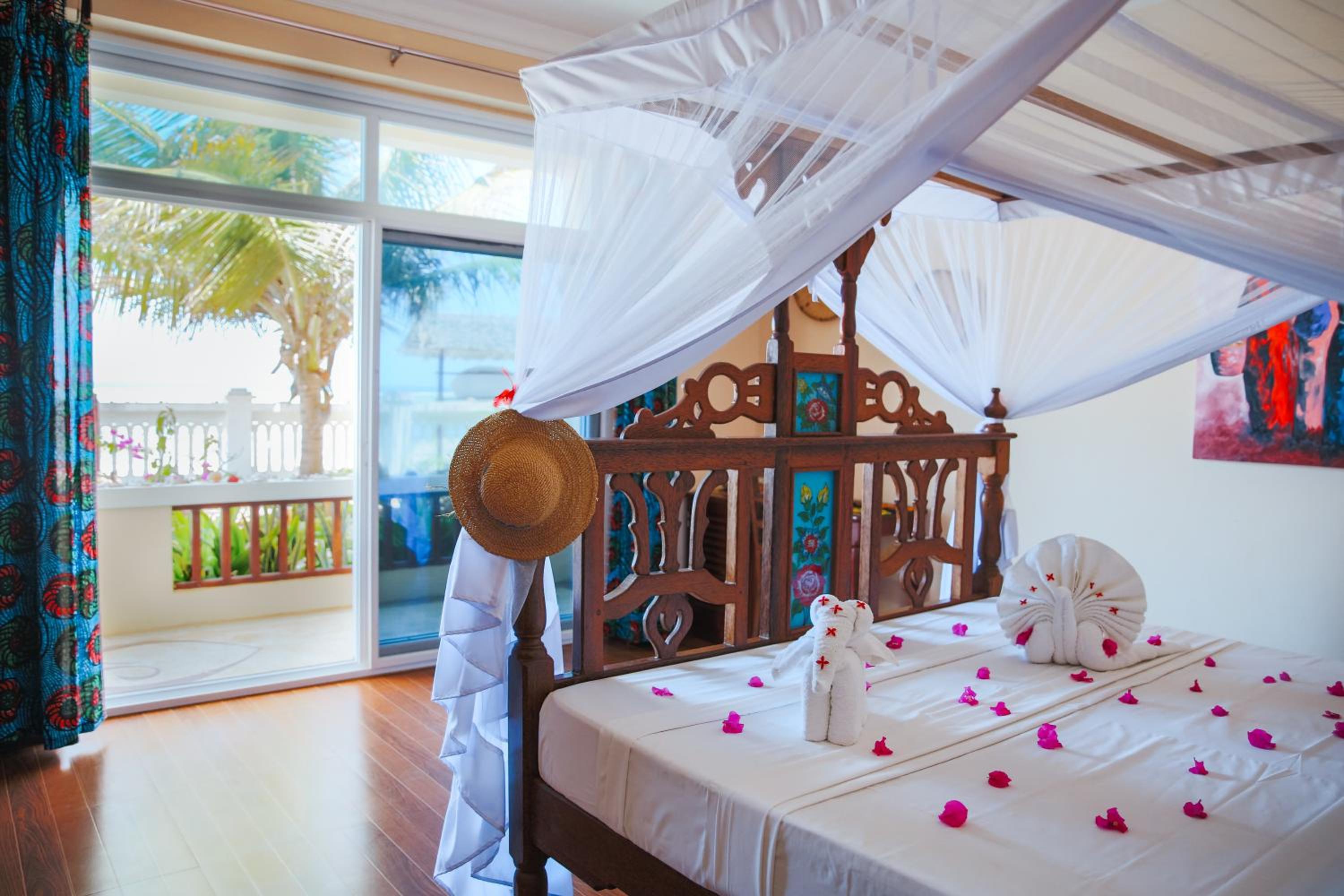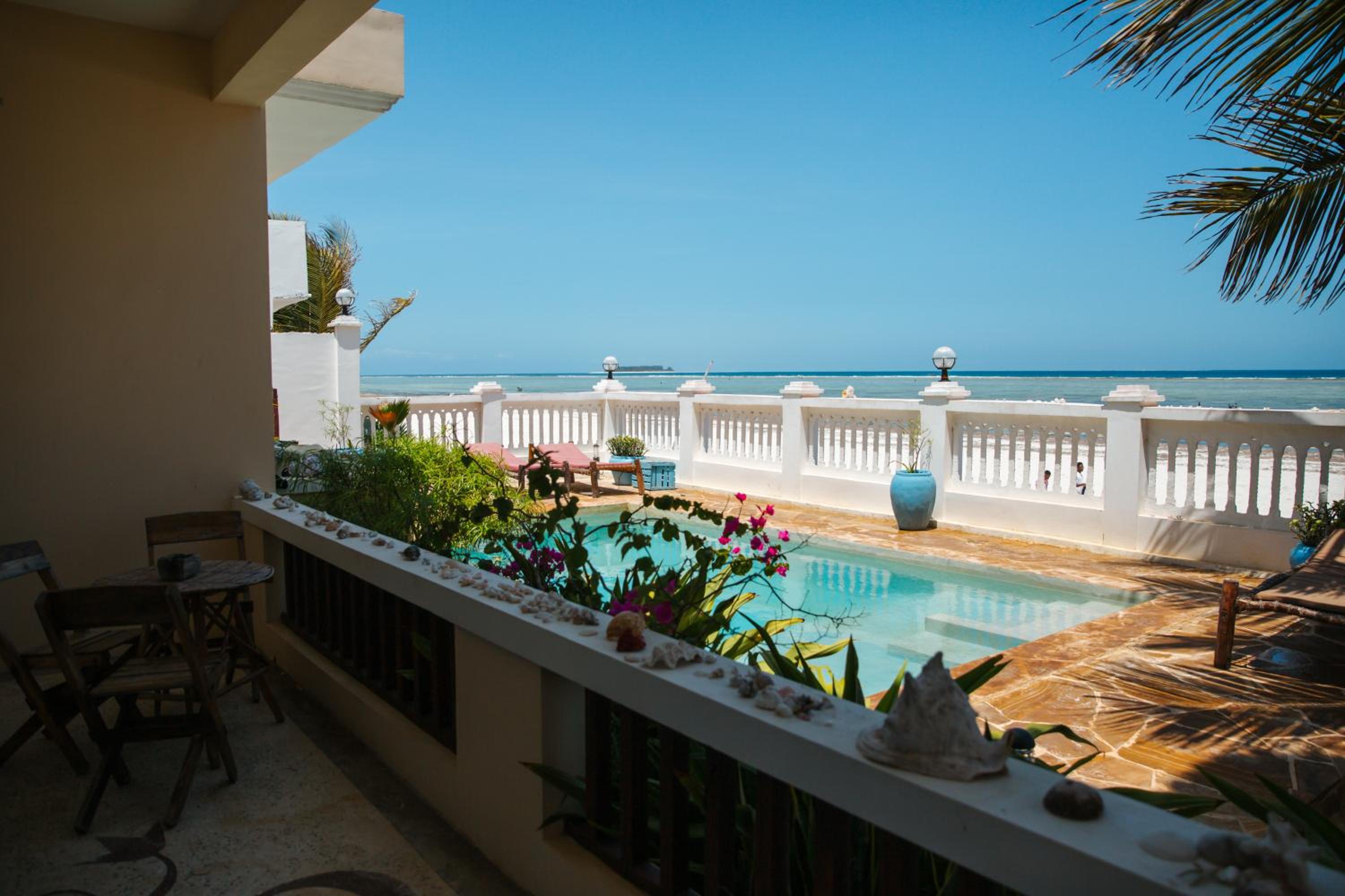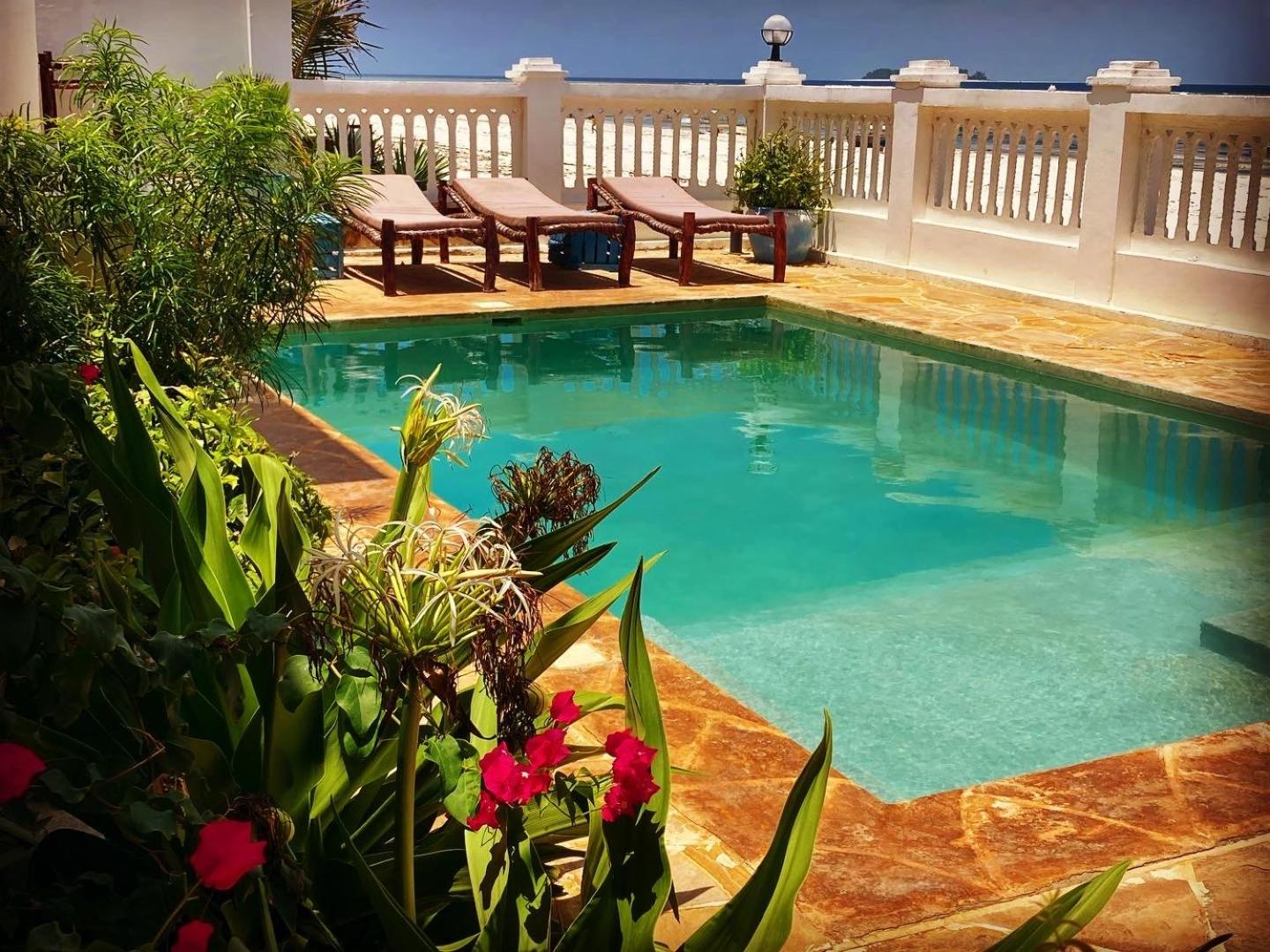 Mambo Paradise in Matemwe offers a 4-star beachfront retreat with free bikes, a refreshing outdoor pool, and lush gardens. Enjoy the convenience of room service and relax on the terrace overlooking the stunning ocean.