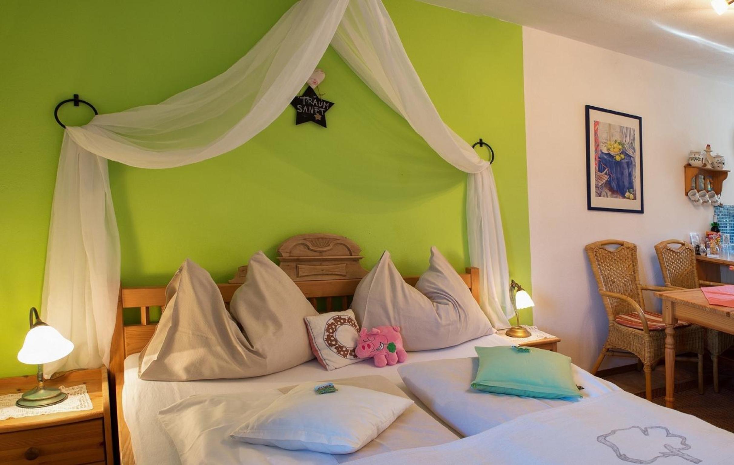 Serene Accommodations: Each guest room at Landhaus FühlDichWohl offers a cozy escape with modern amenities and picturesque orchard views from private balconies.