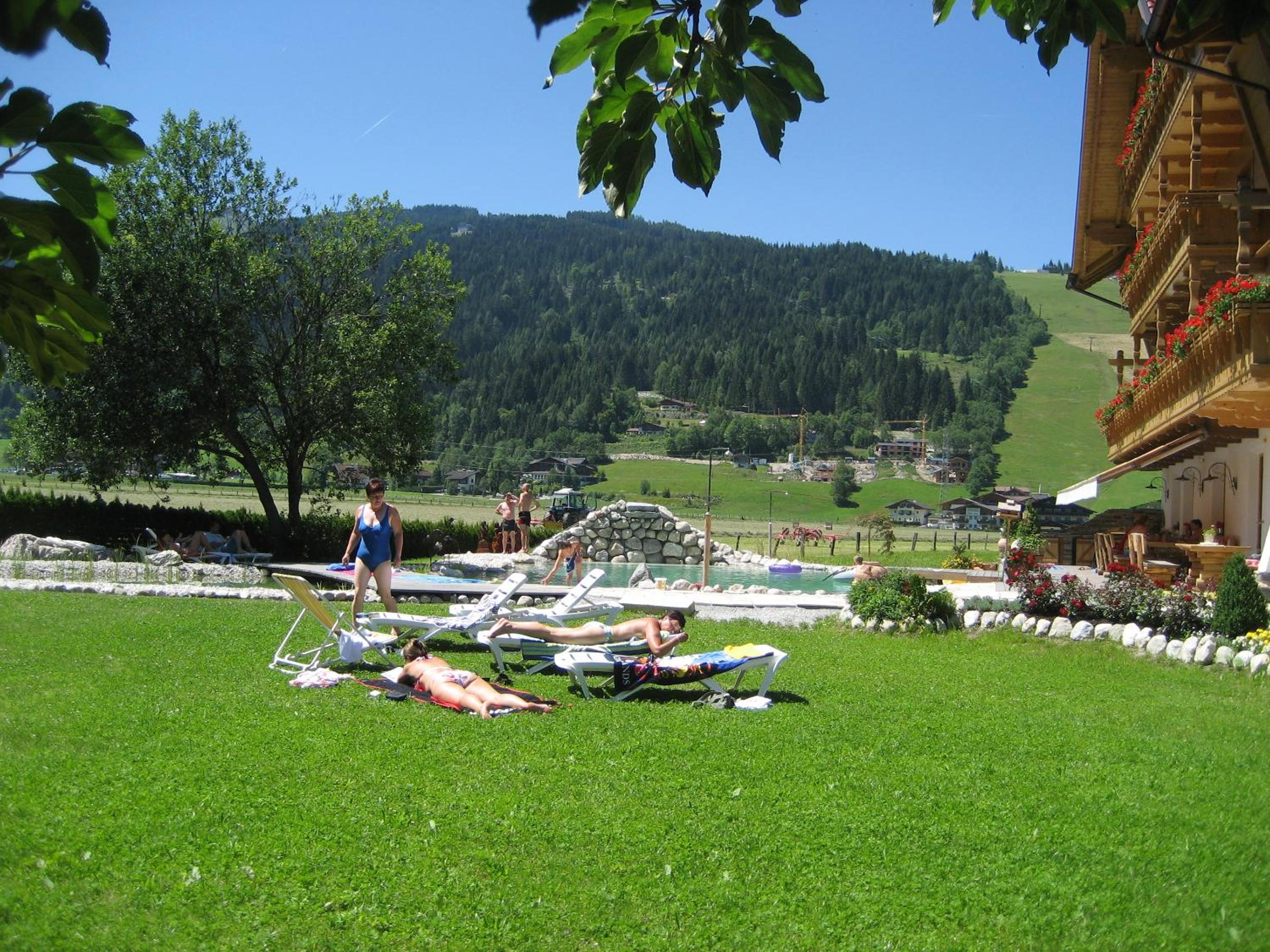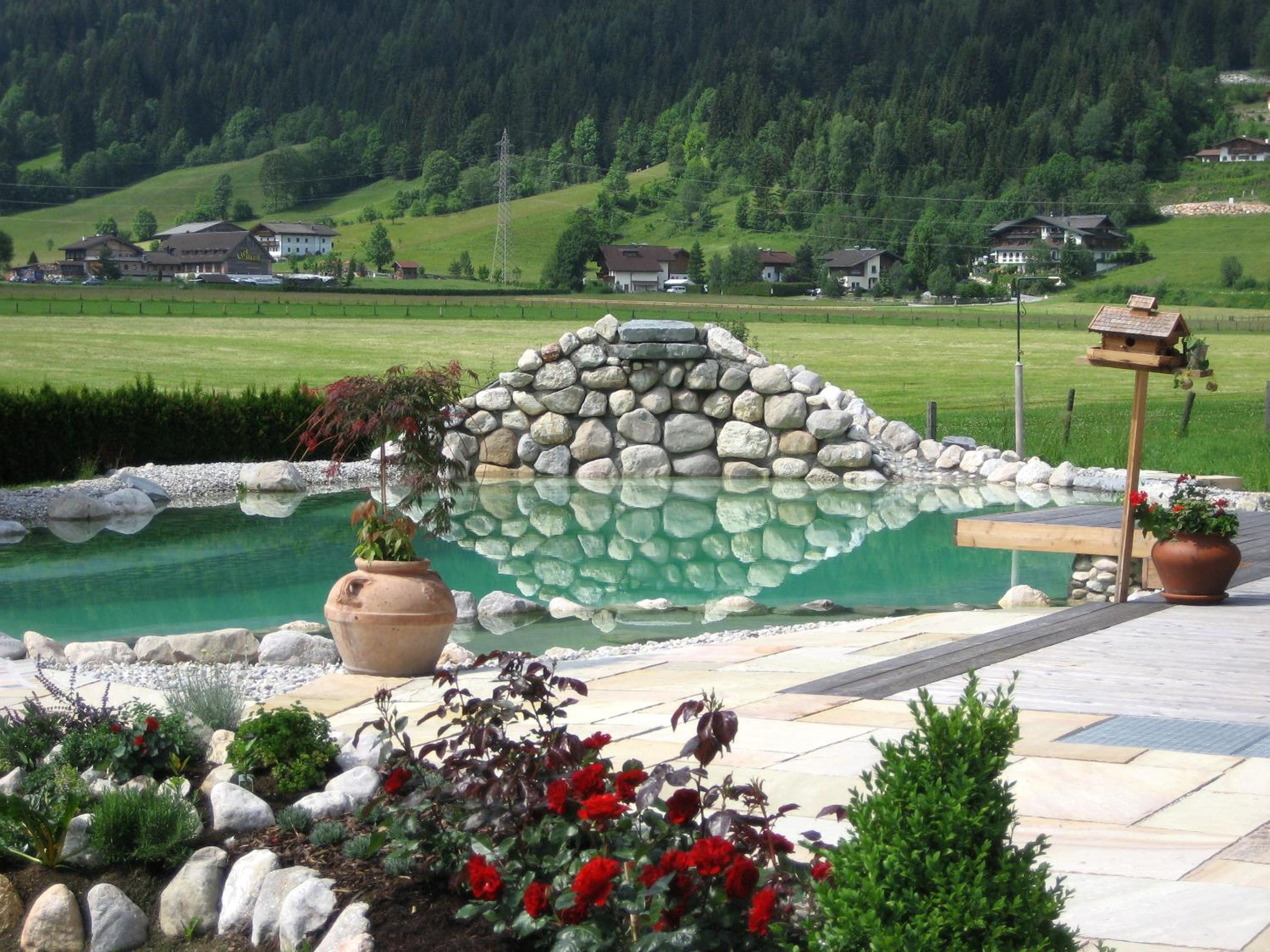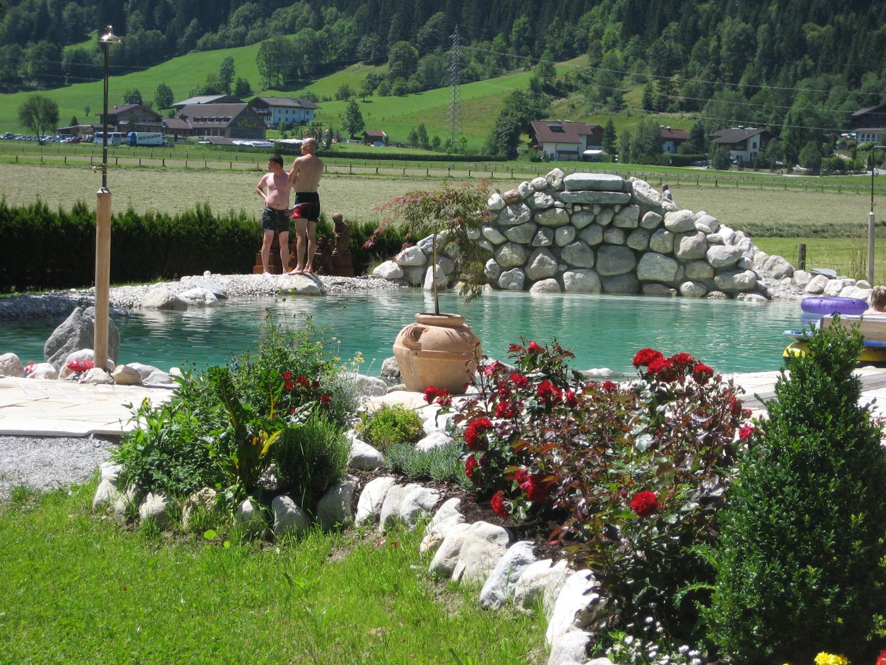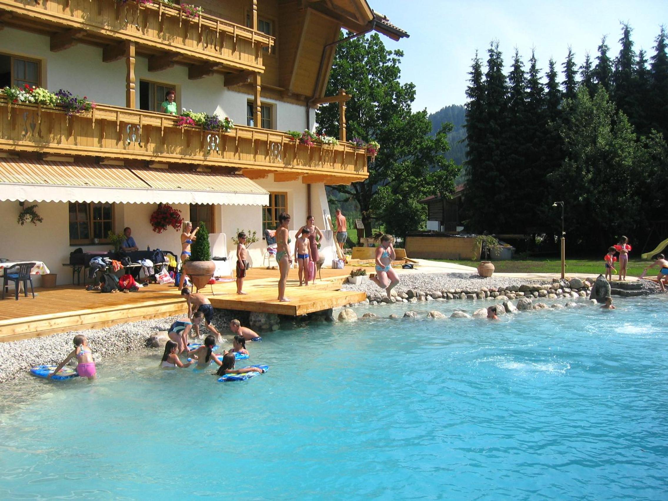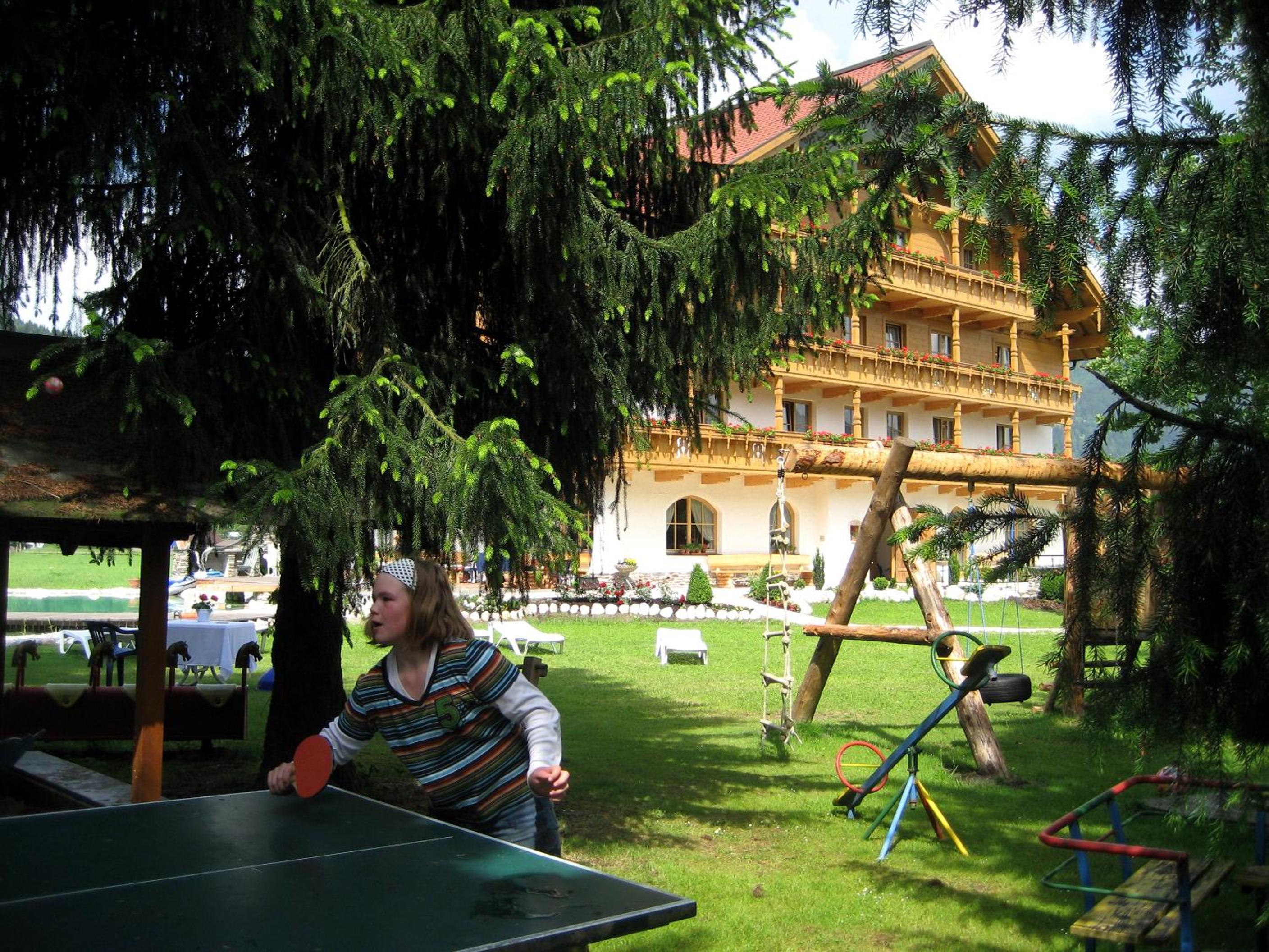 Wunderschöner Garten mit Schwimmteich und Kinderspielplatz. Spielzimmer im Hotel