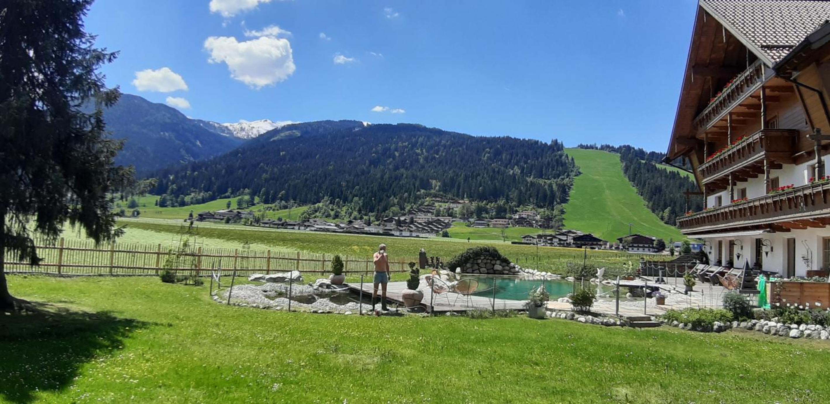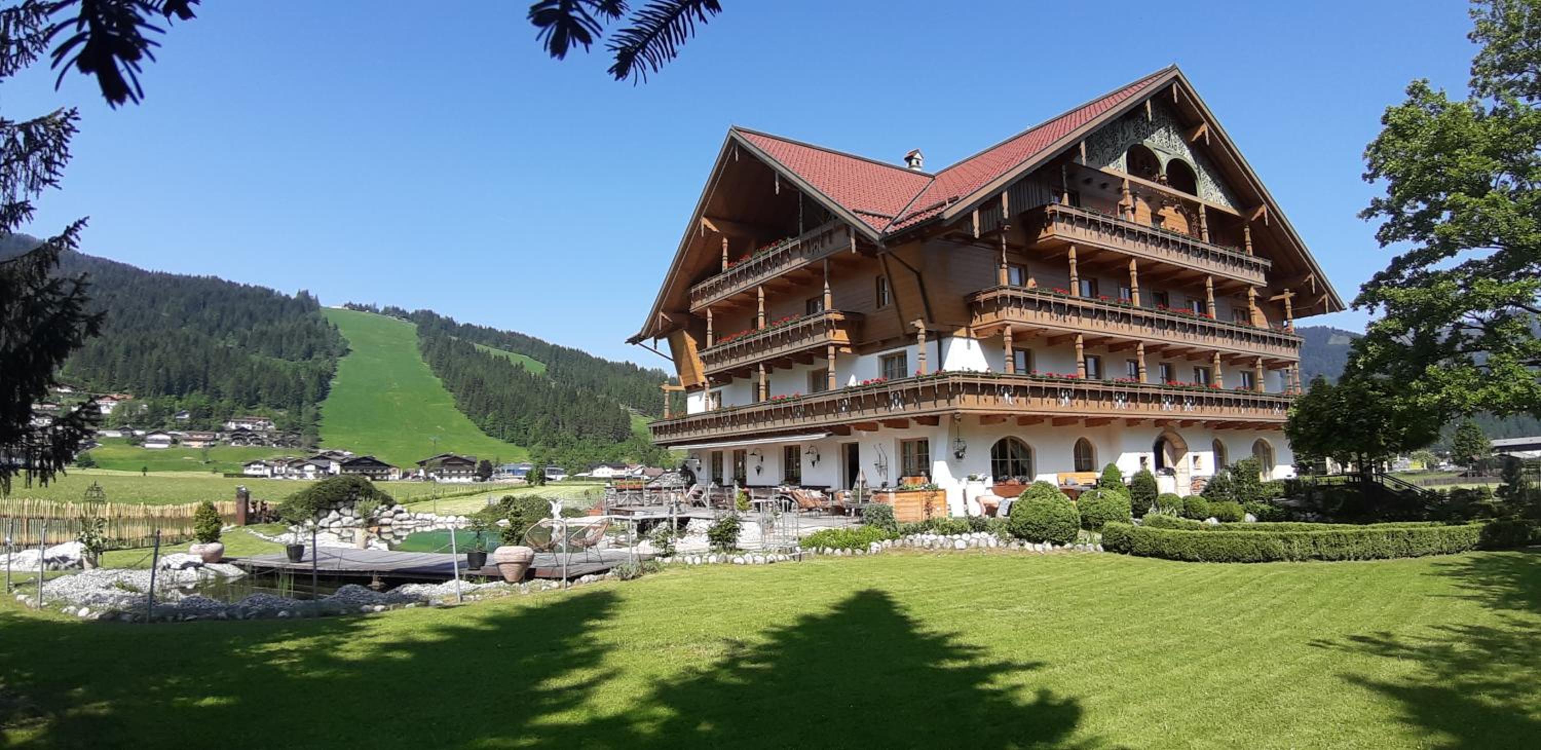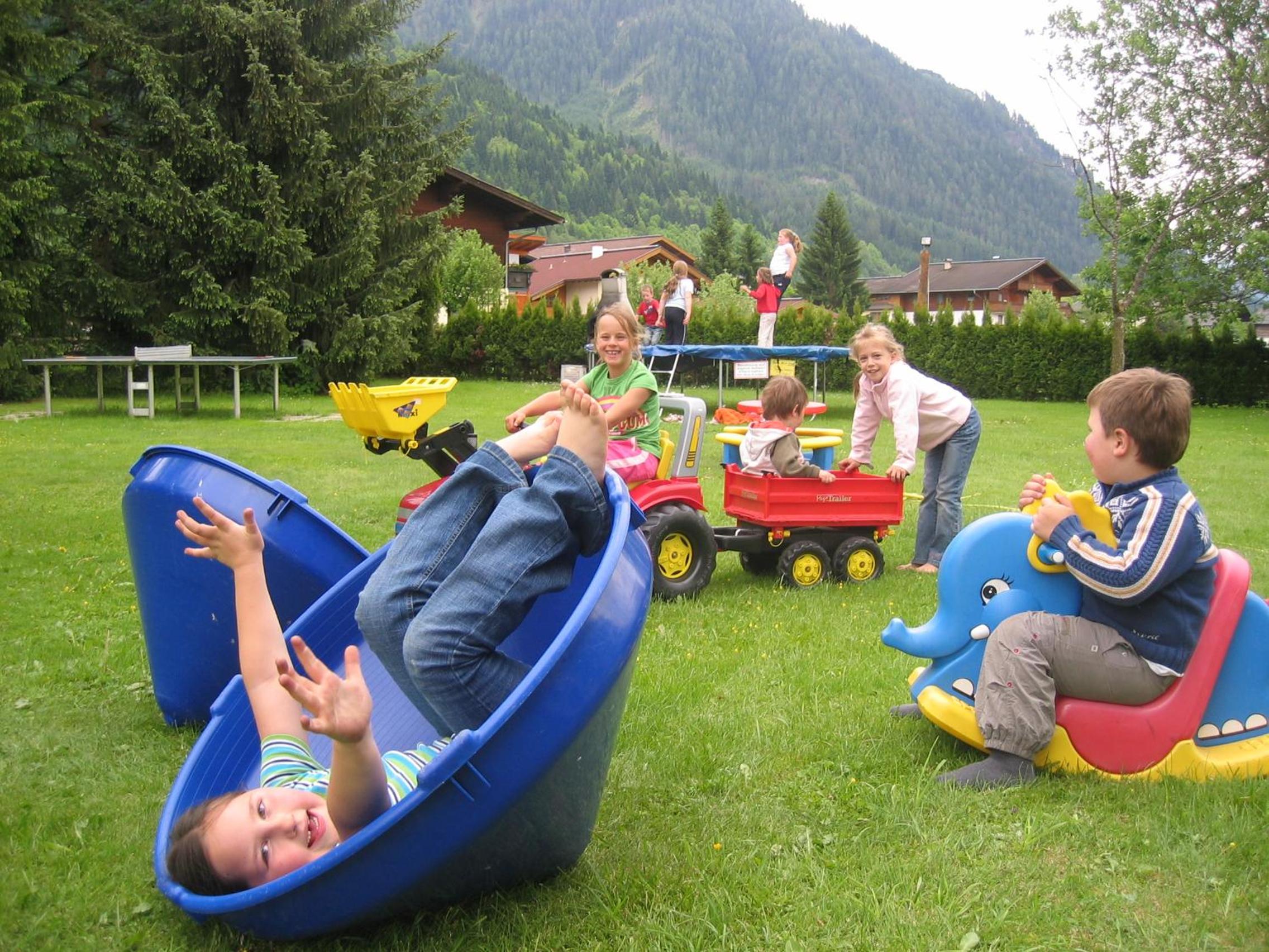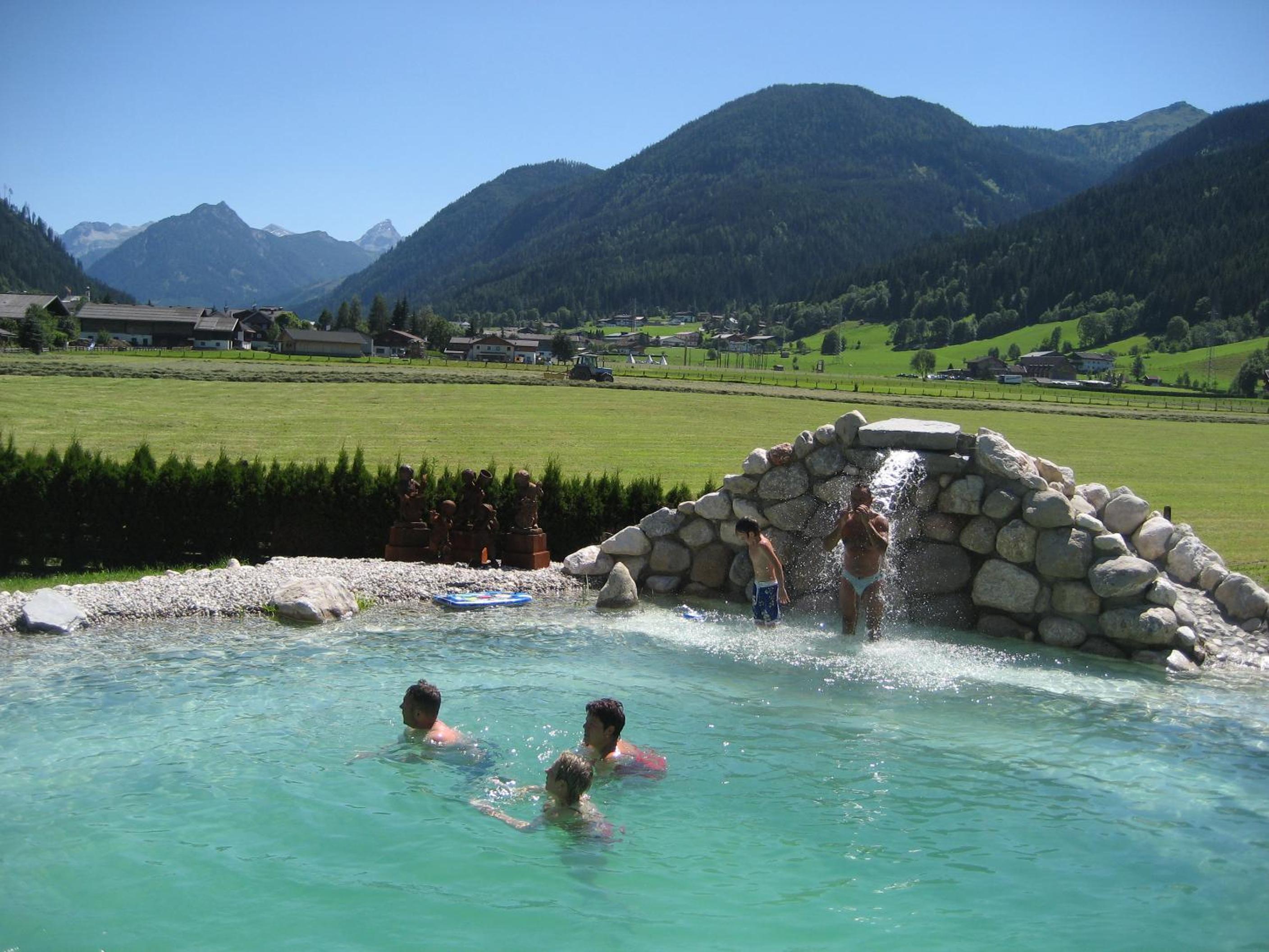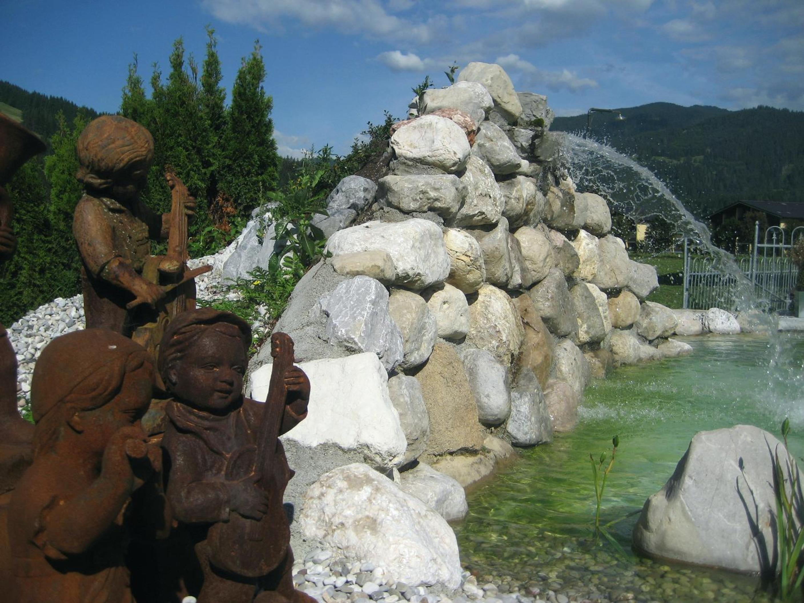 Wunderschöner Garten mit Schwimmteich und Kinderspielplatz. Spielzimmer im Hotel