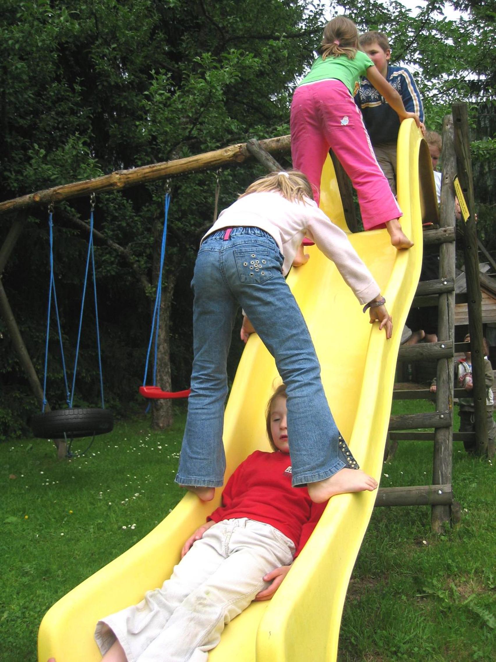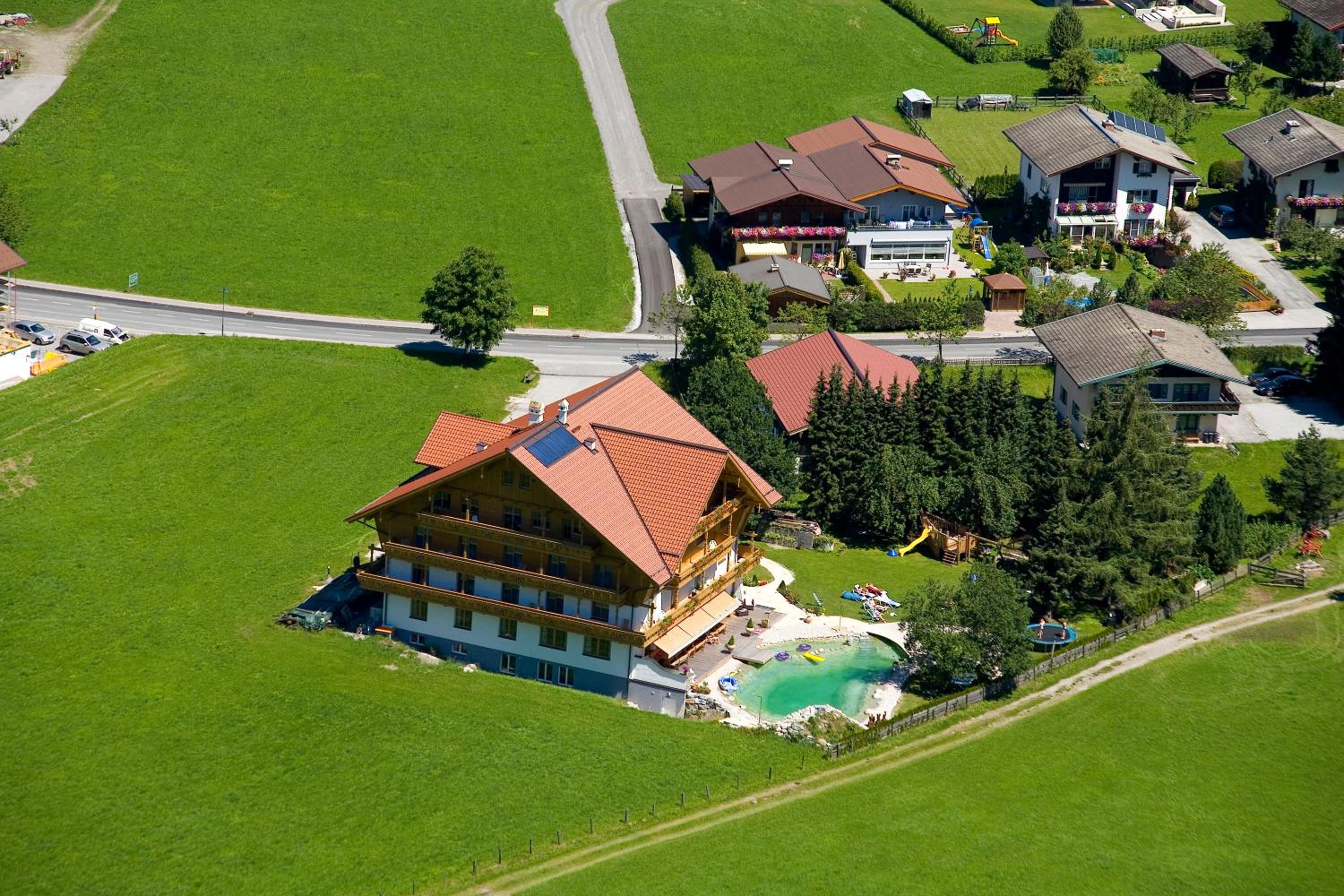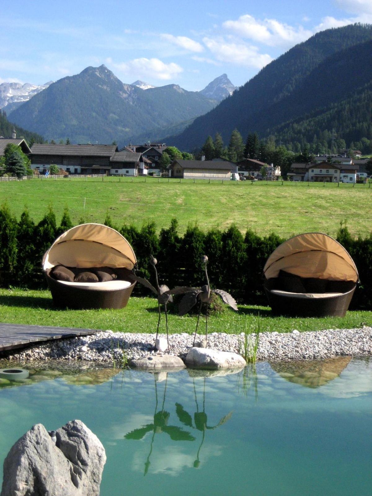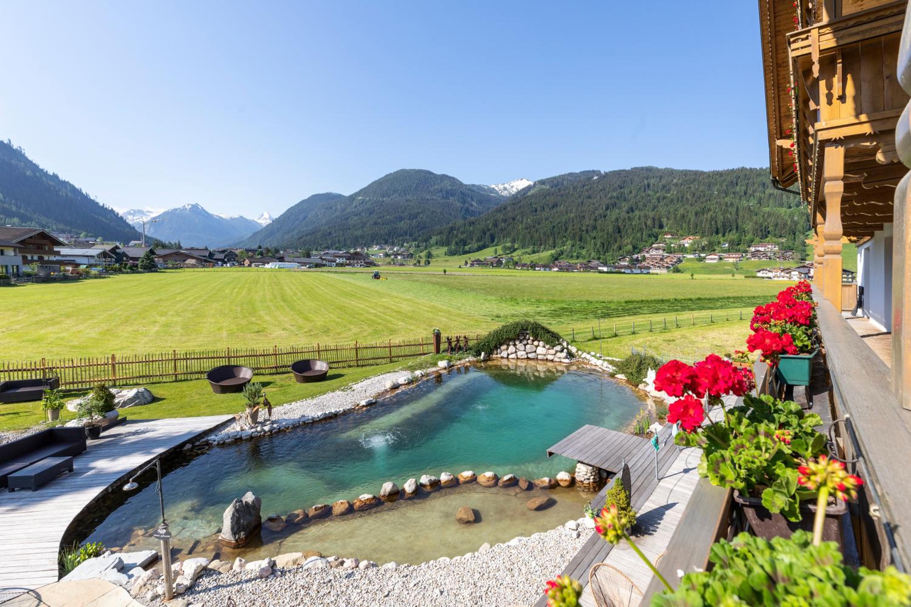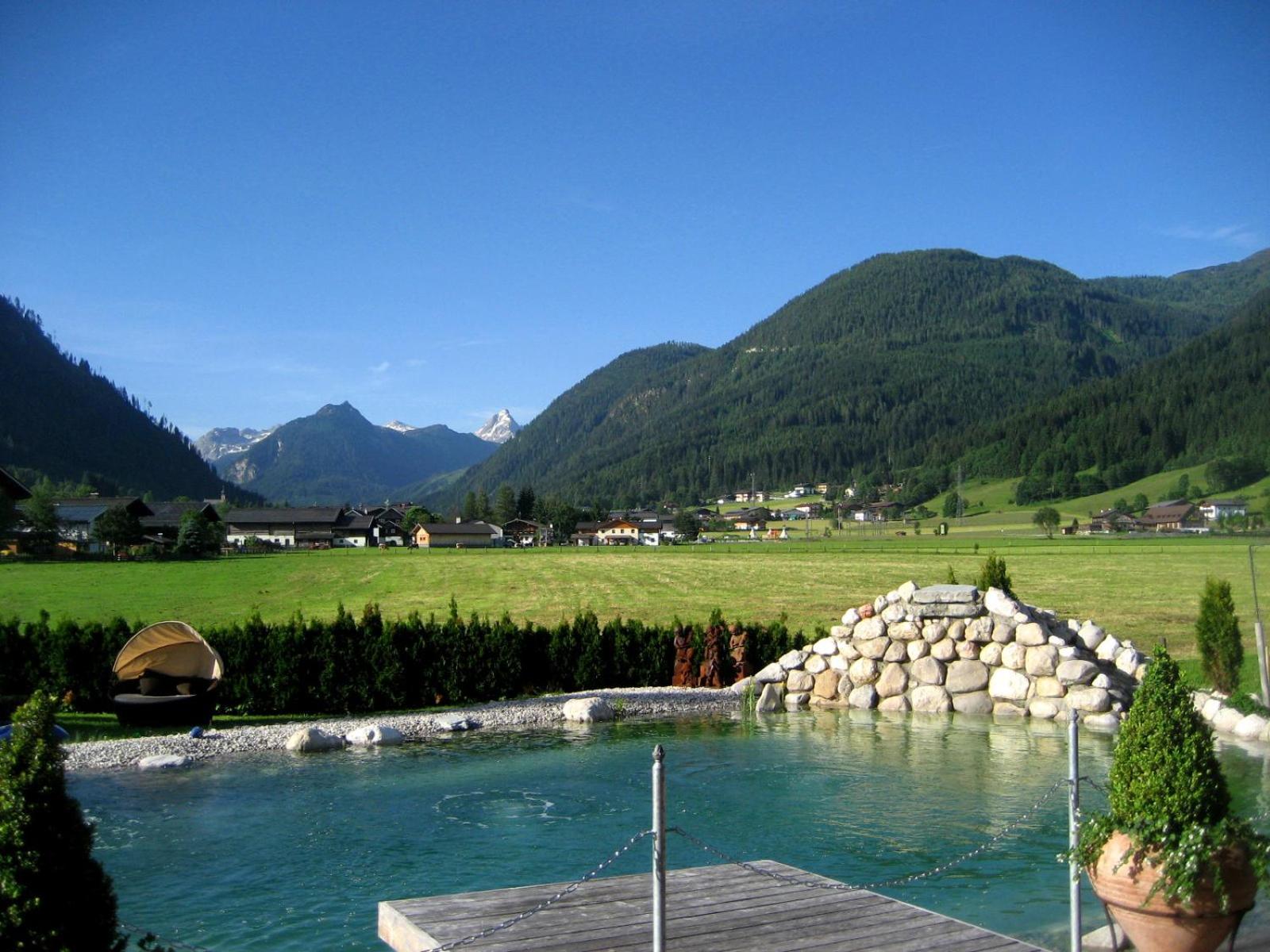 Wunderschöner Garten mit Schwimmteich und Kinderspielplatz. Spielzimmer im Hotel