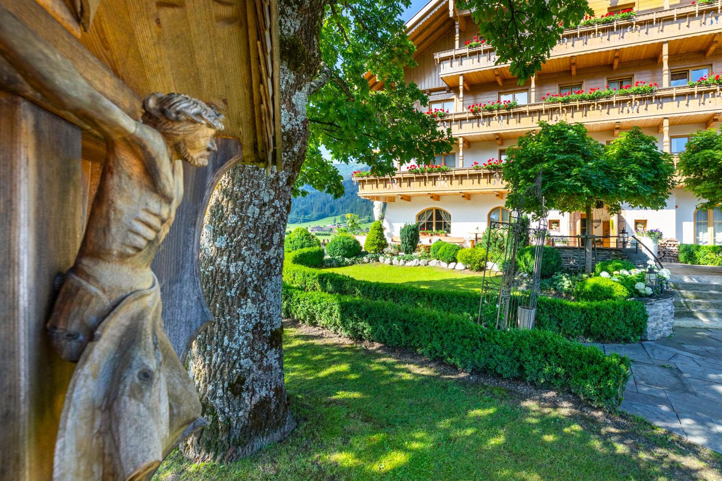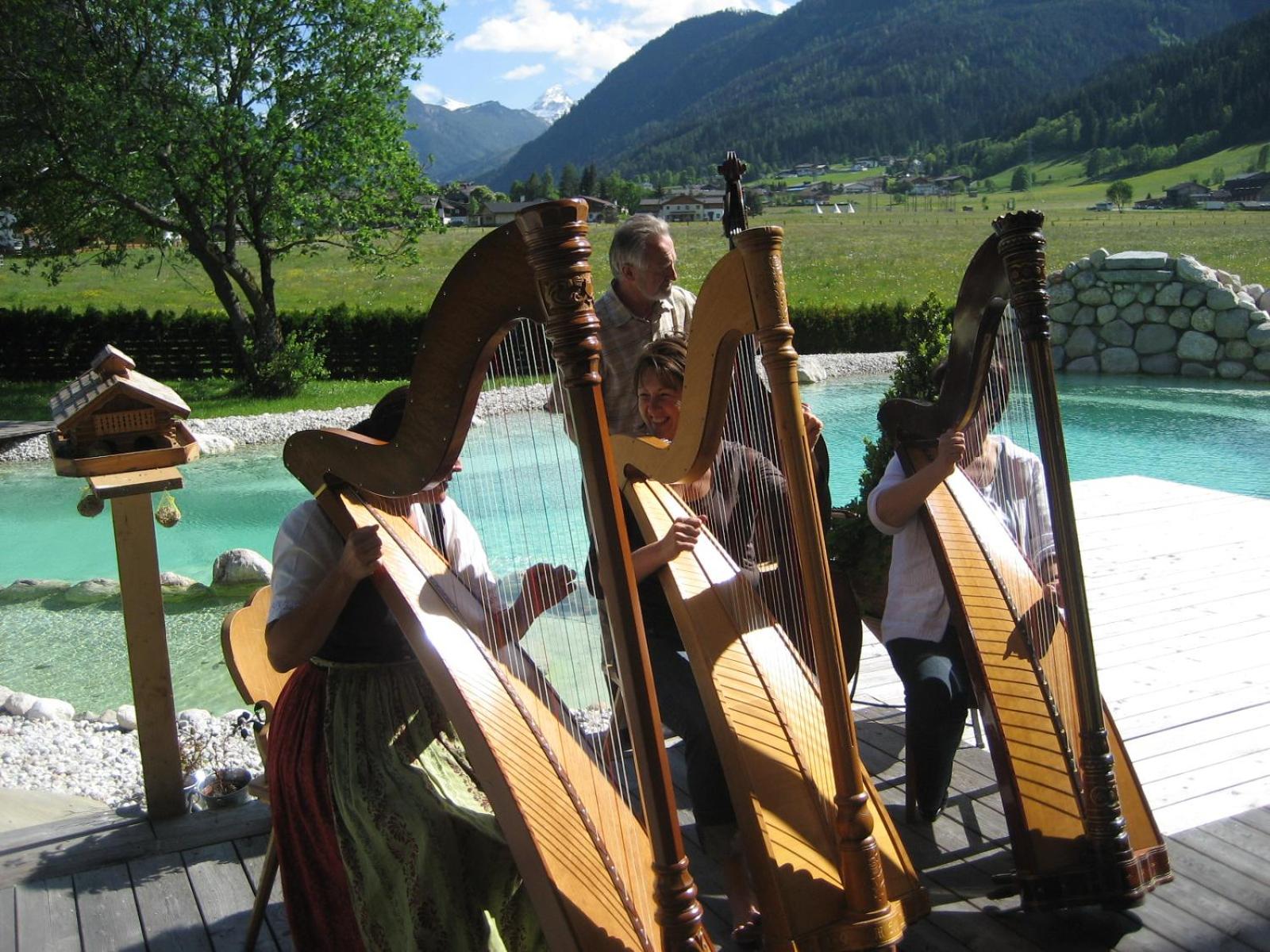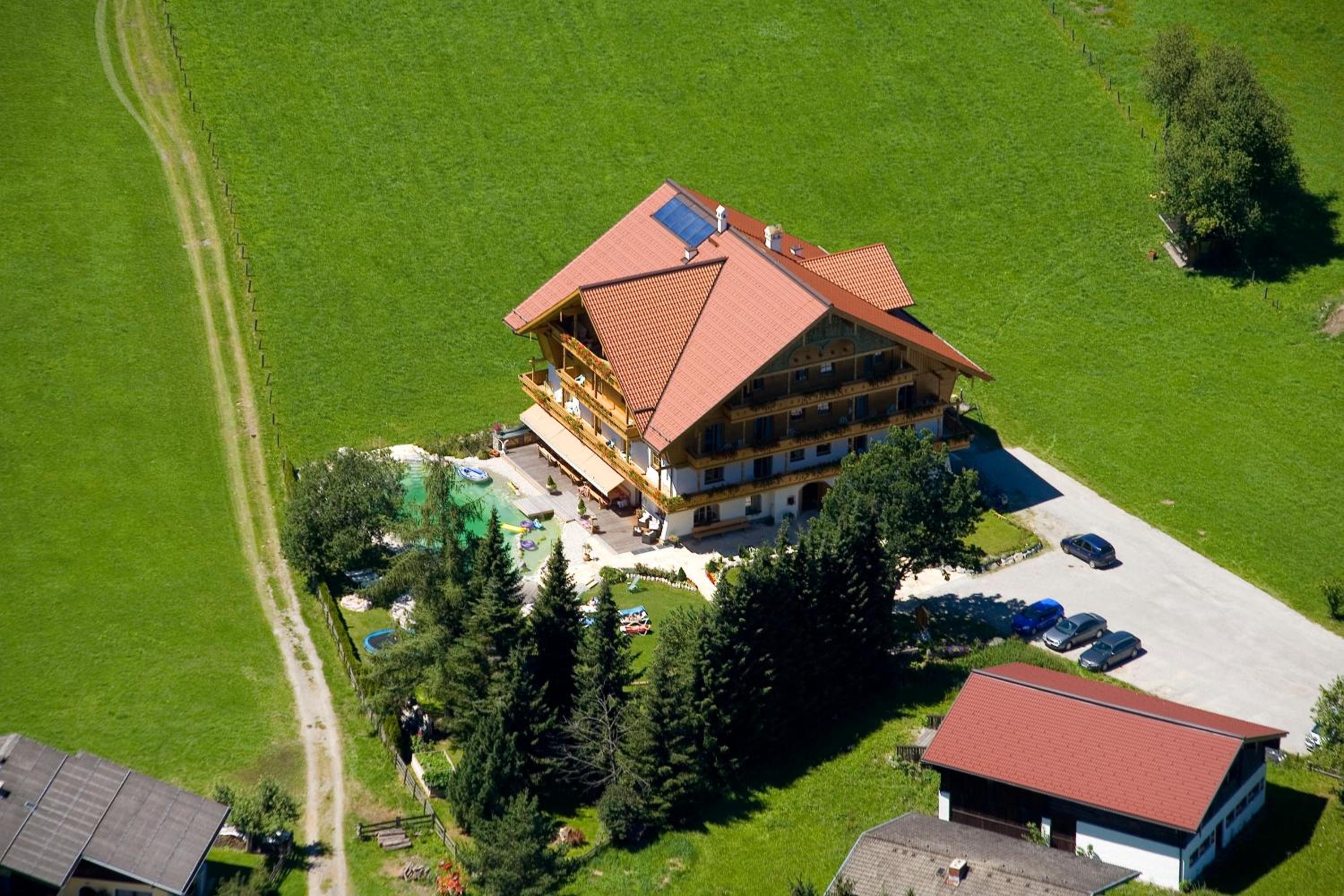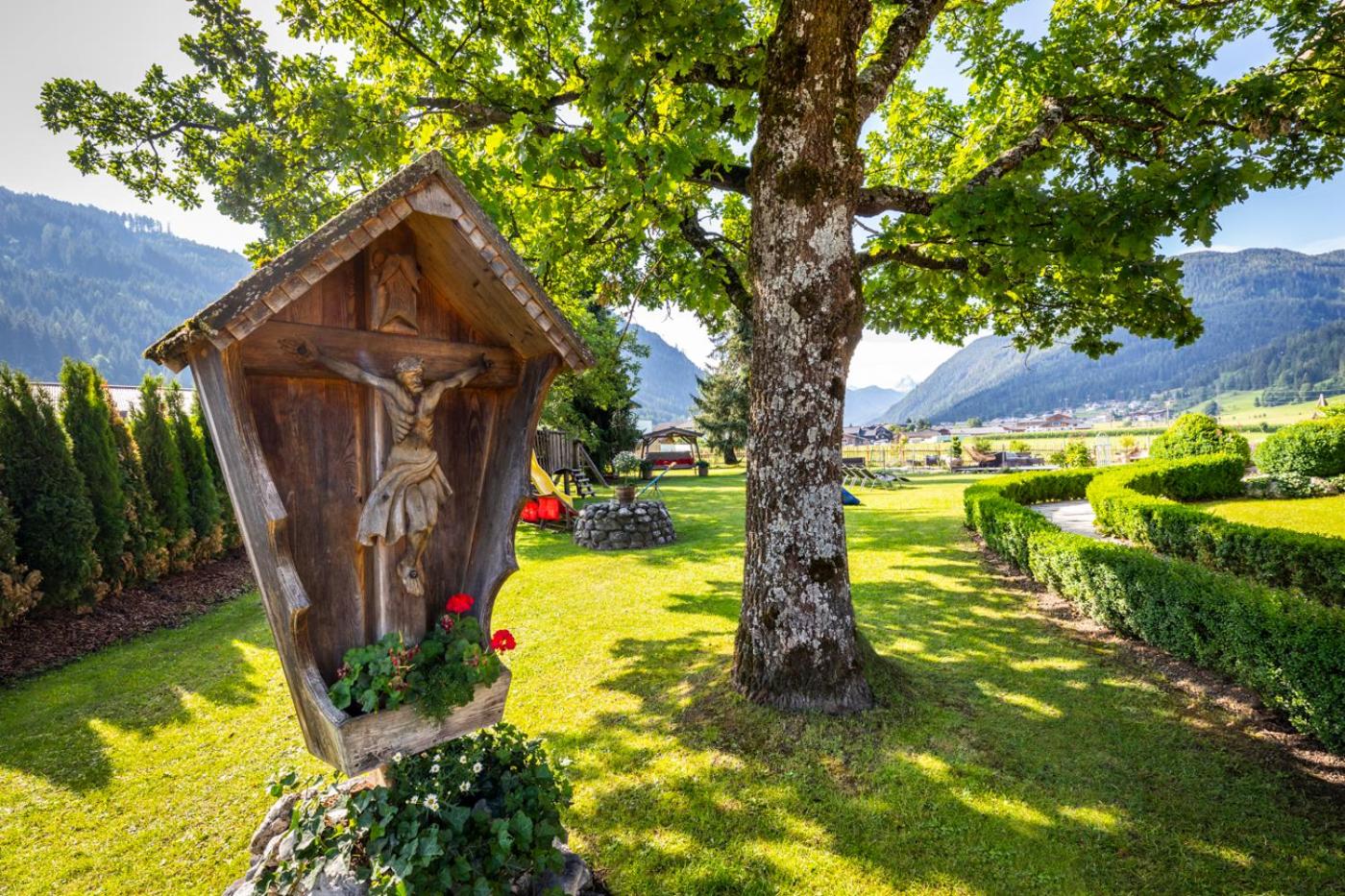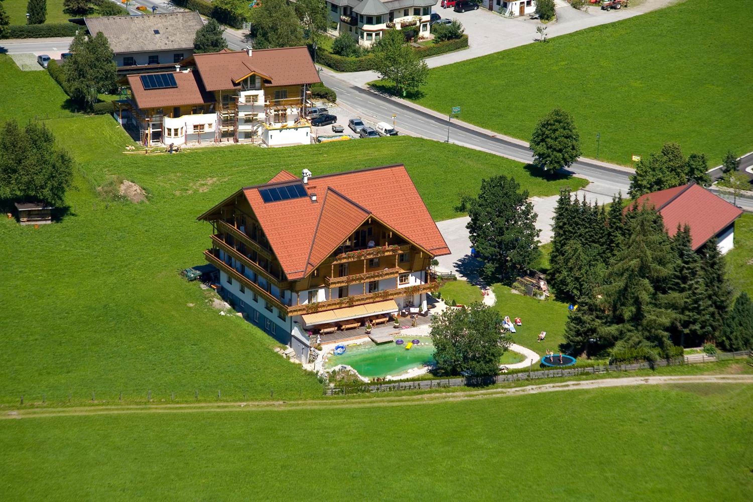 Wunderschöner Garten mit Schwimmteich und Kinderspielplatz. Spielzimmer im Hotel