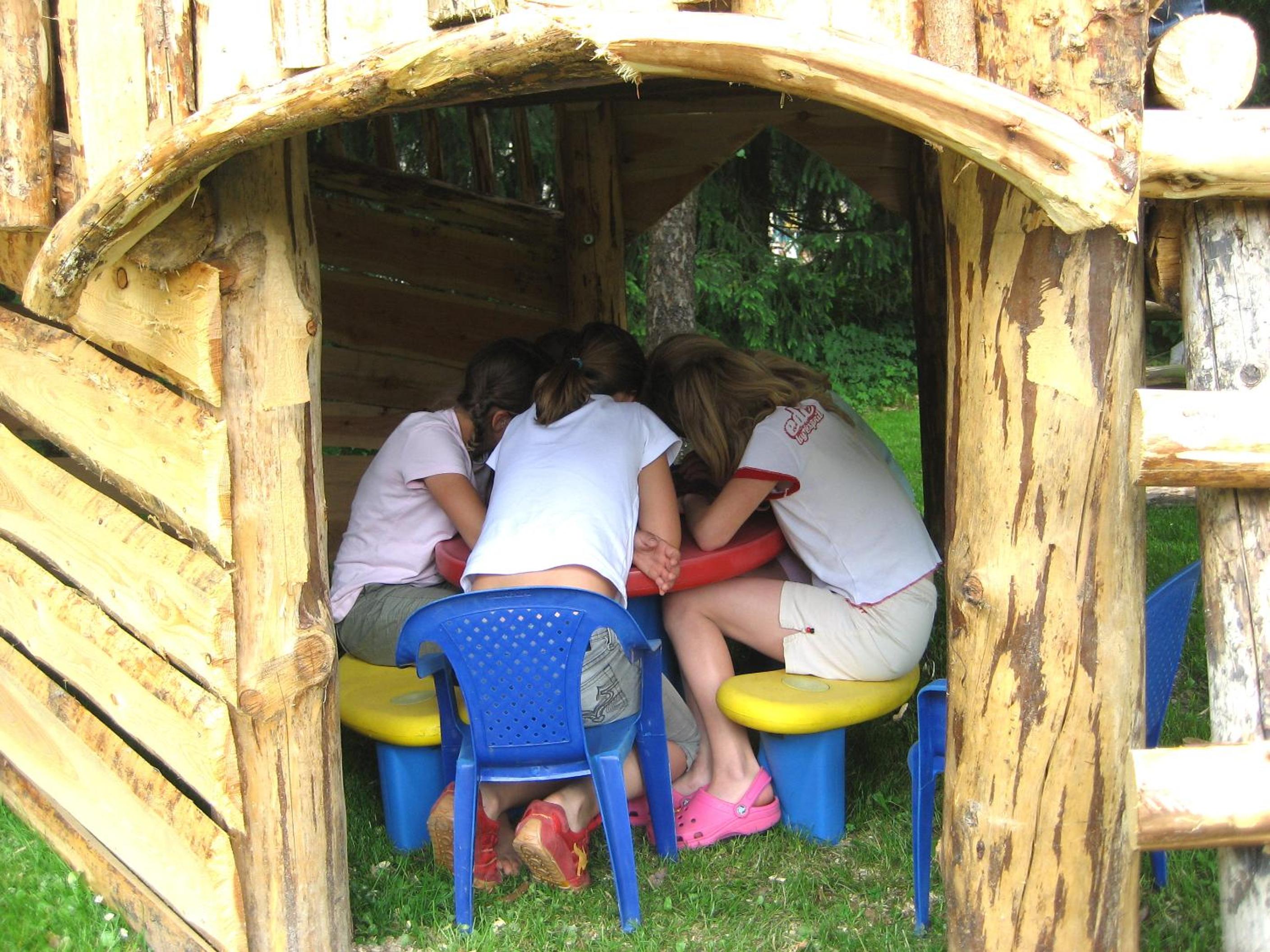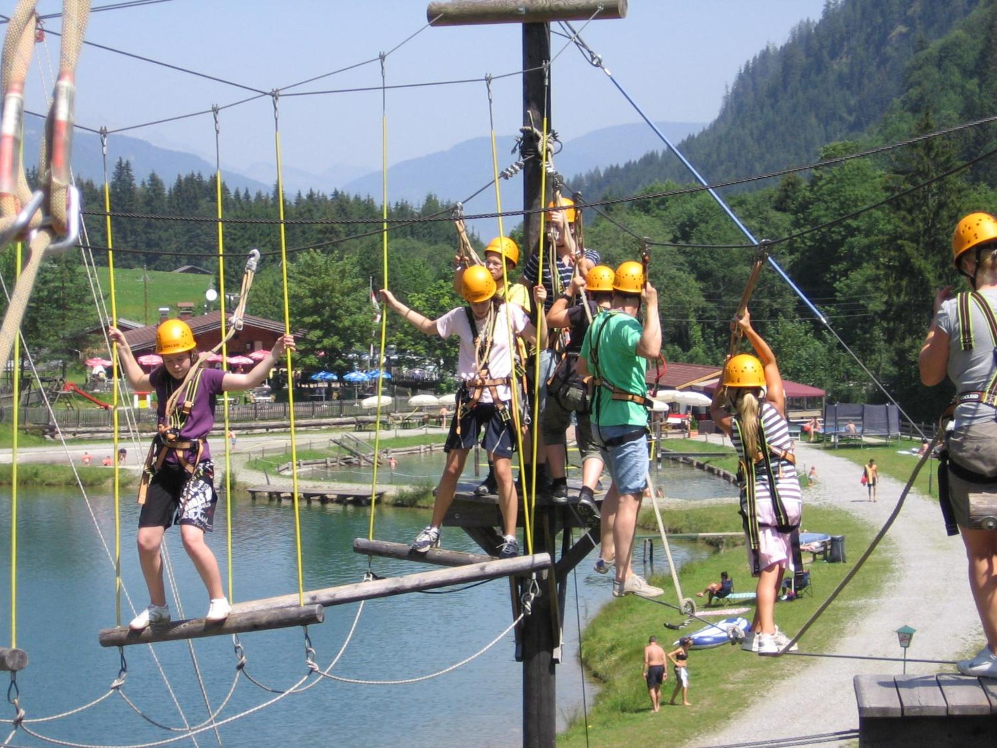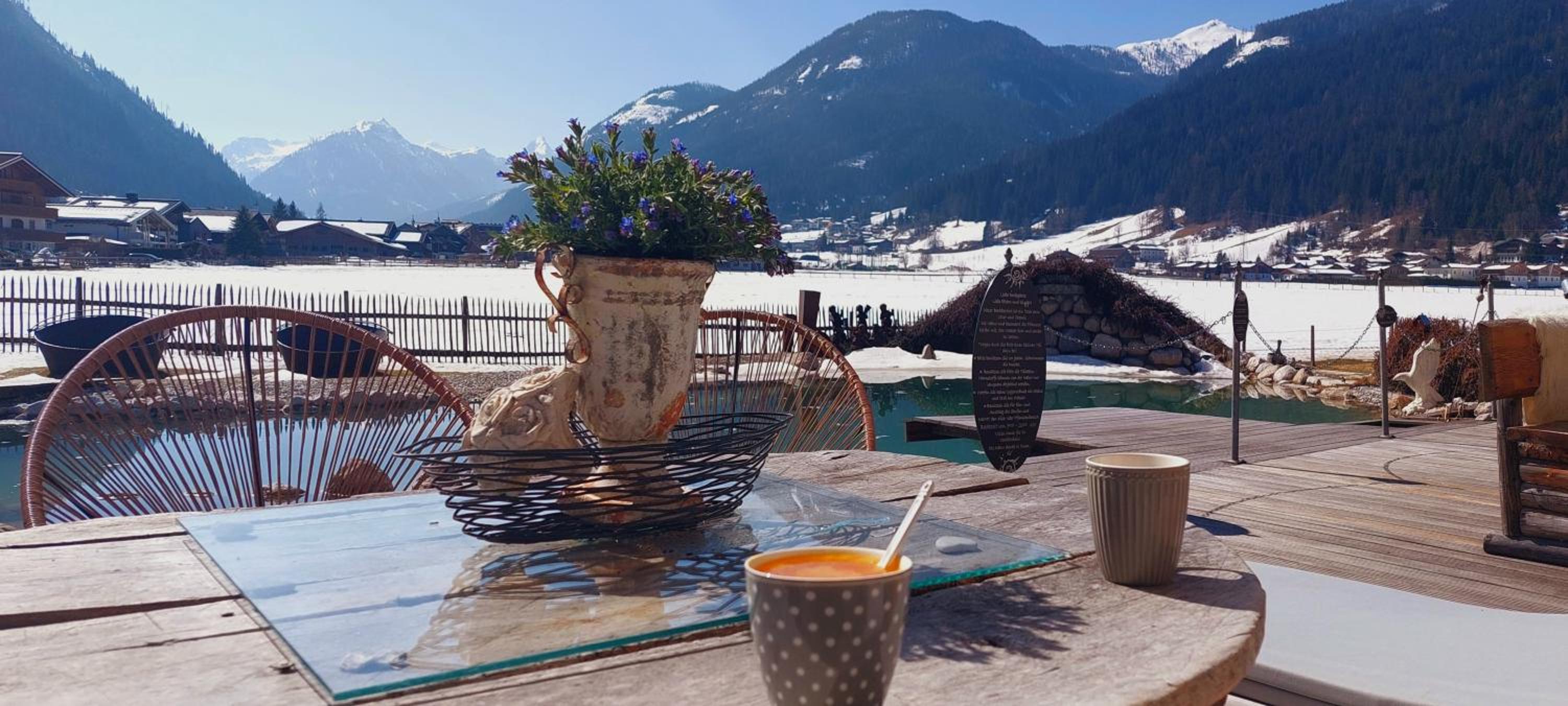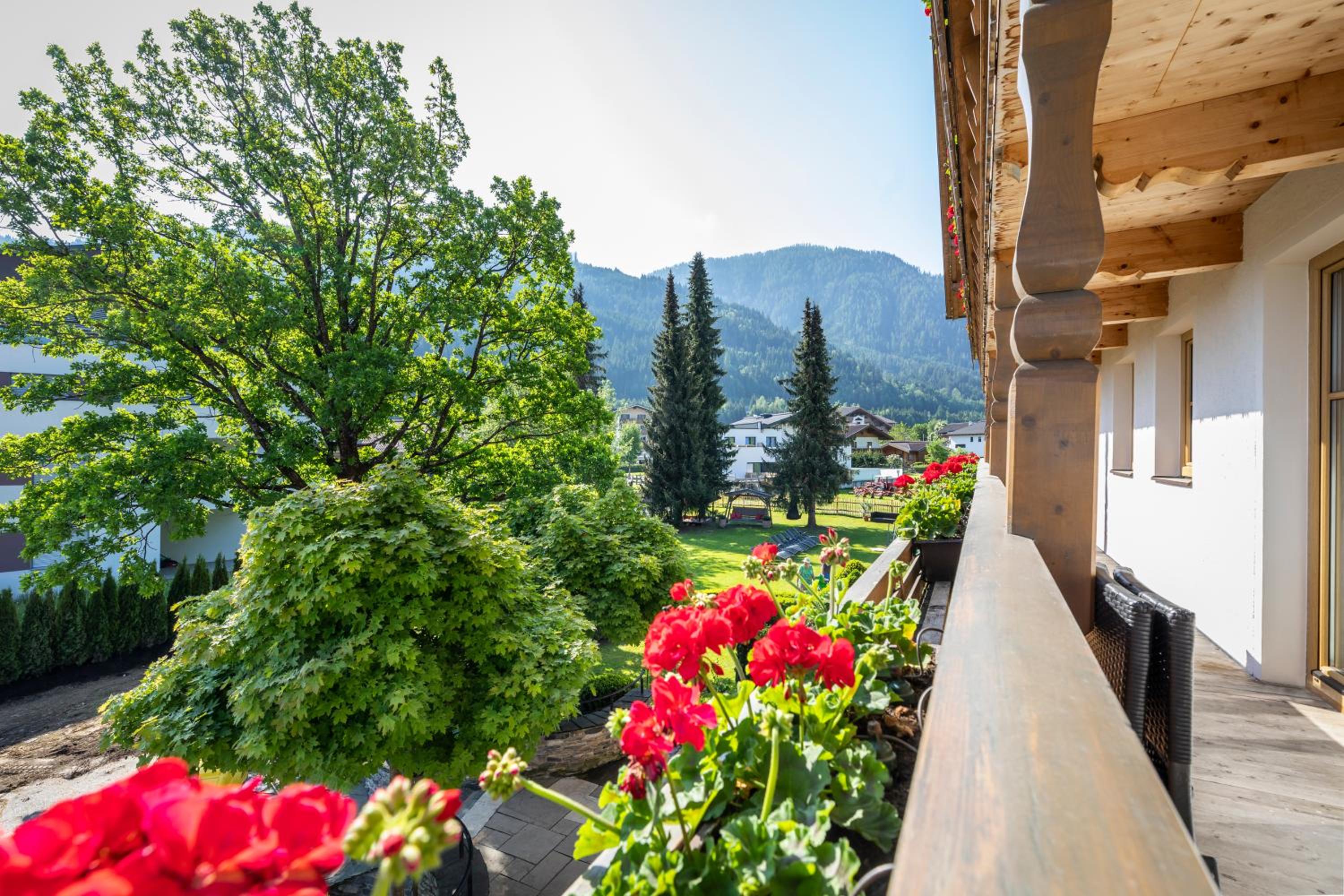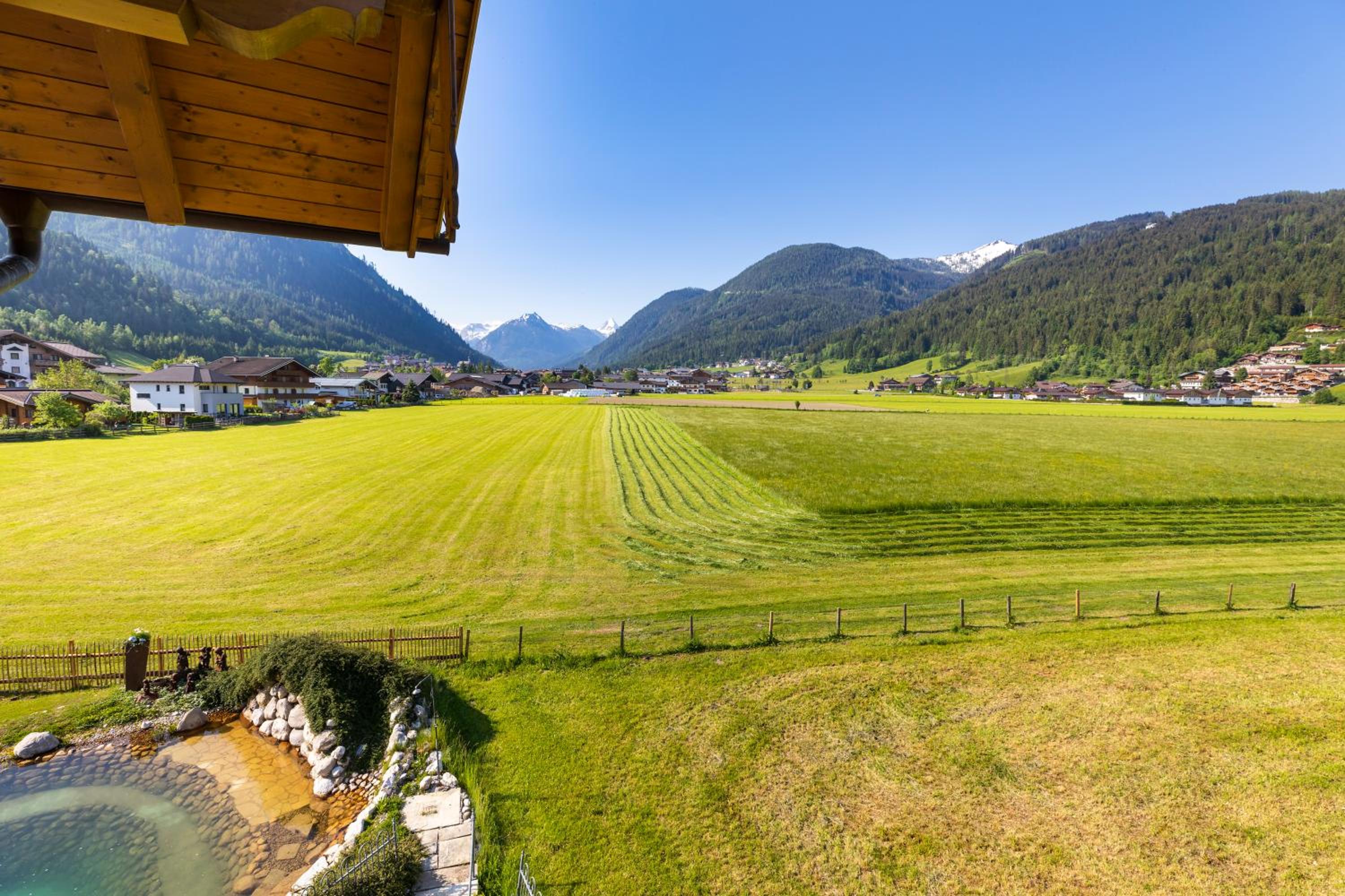 Wunderschöner Garten mit Schwimmteich und Kinderspielplatz. Spielzimmer im Hotel