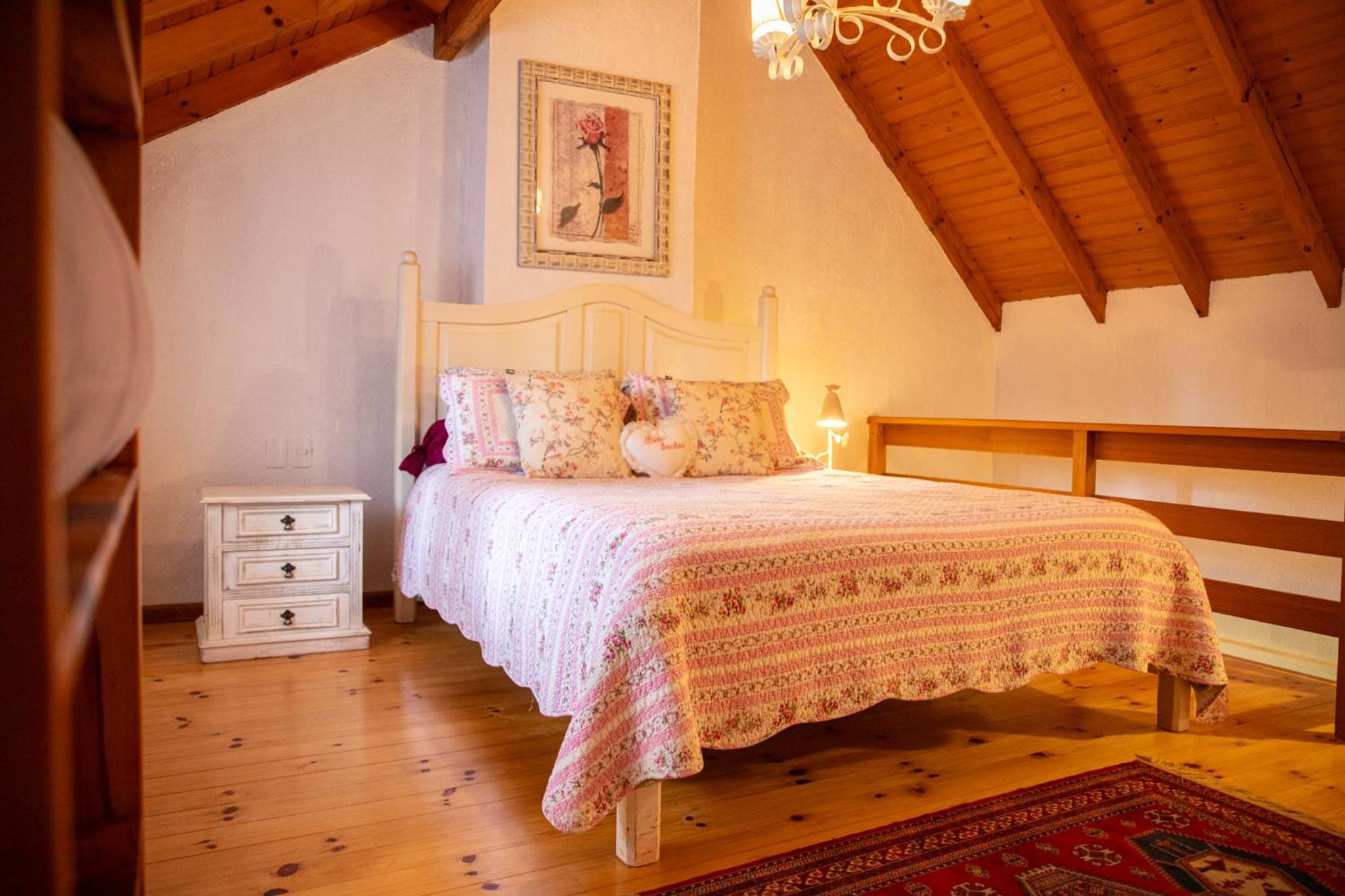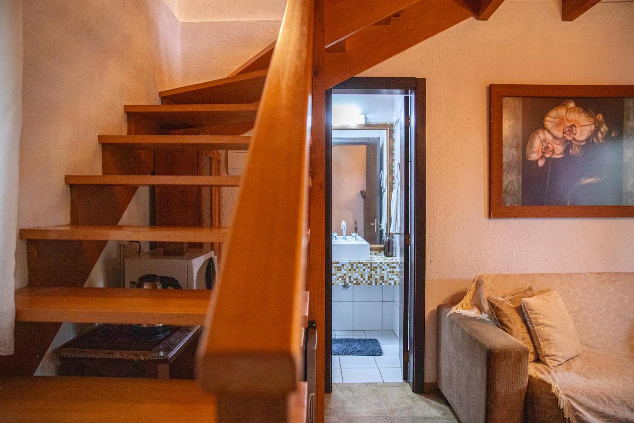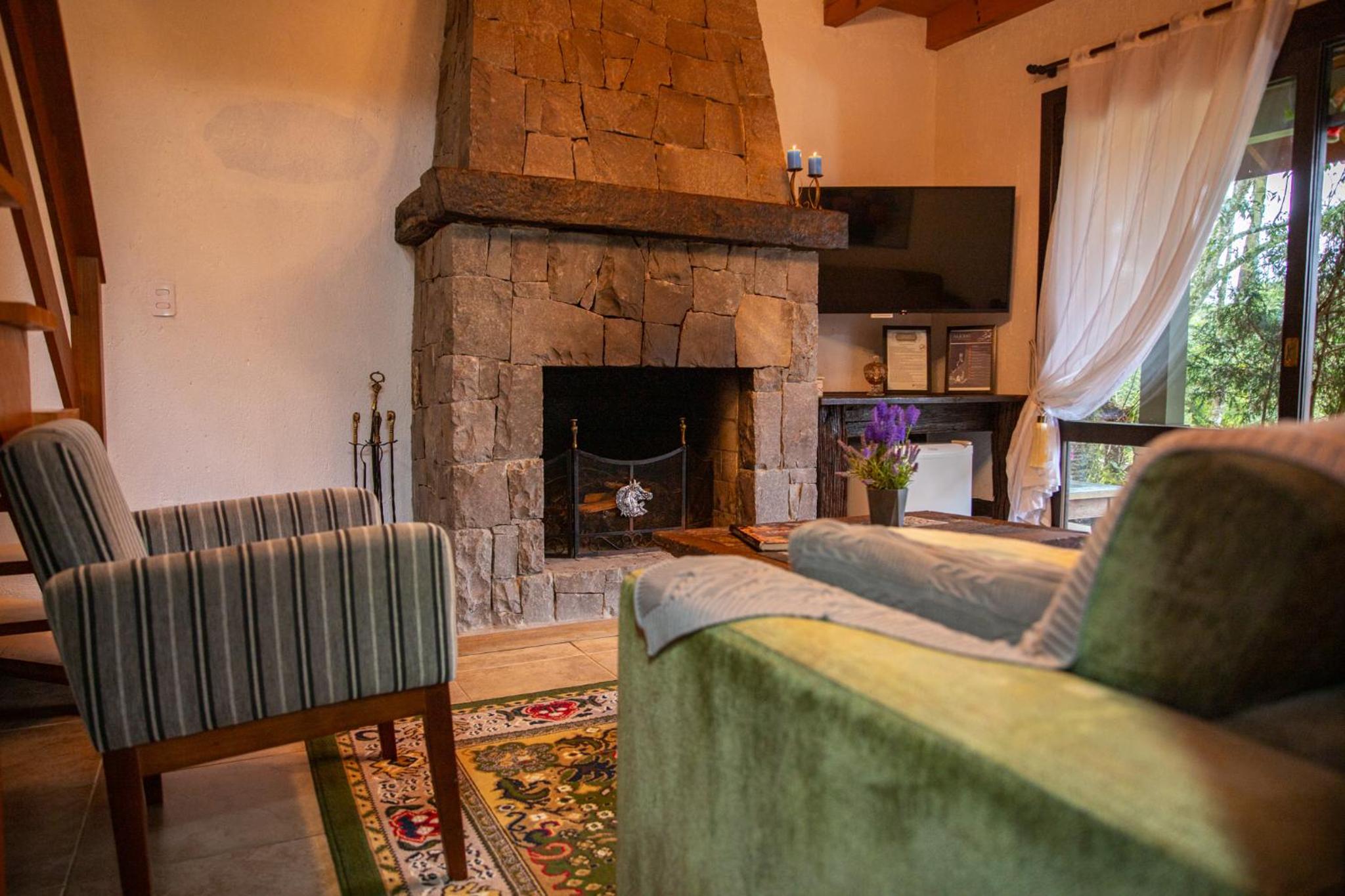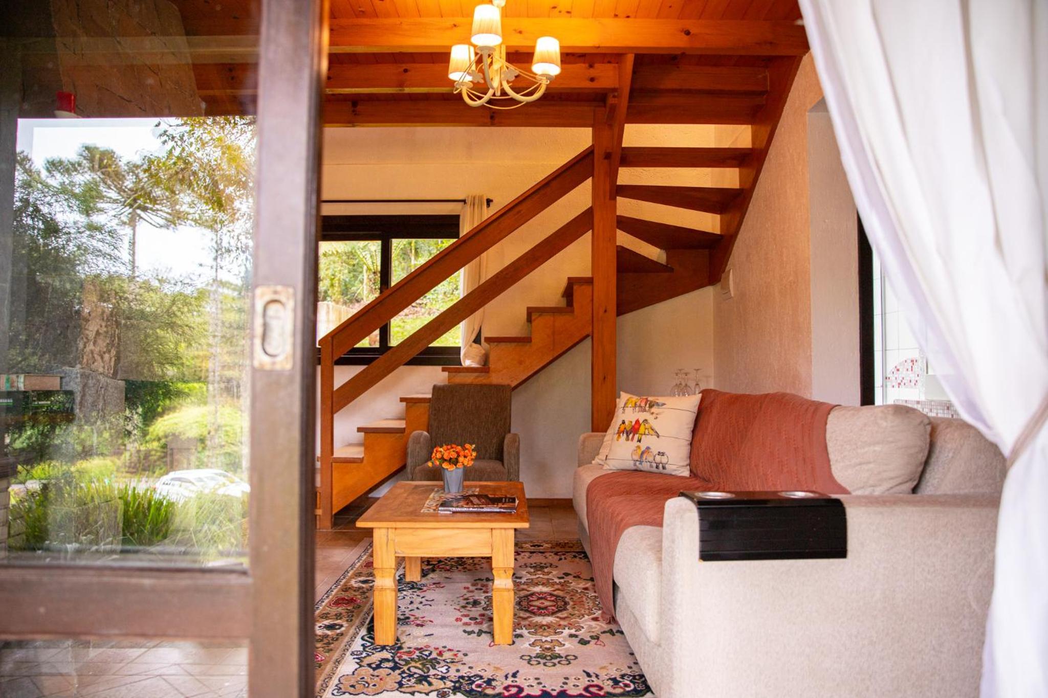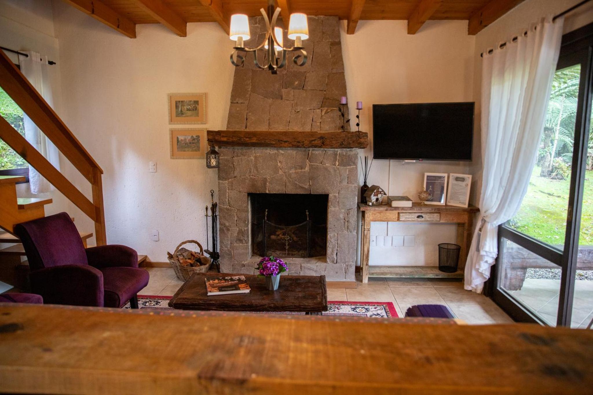 O chalé é amplo e confortável, porém as camas ficam no piso superior, enquanto o banheiro, a lareira e a TV no térreo. Isto causa alguns desconfortos. Se na madrugada há necessidade de ir ao banheiro é preciso descer a escada, algo perigoso. Também se as malas ficarem no piso superior, tem-se de descer com as roupas para tomar banho no térreo. E não há espaço adequado para as malas ficarem no térreo. Se você quer dormir com a lareira acesa, não pode, pois camas e lareira ficam em pisos diferentes. Outro desconforto é quanto ao ar condicionado (quente e frio) que só tem no piso superior. Para dormir é ótimo, mas se você quer assistir TV ou jantar no piso térreo é muito frio. Há necessidade de acender a lareira, mas a lenha só dura 1 ou 2 horas. Ou seja, em dias frios ou em dias muito quentes o piso térreo é desconfortável demais, o que impossibilita almoçar, jantar, assistir TV. Até para tomar banho há desconforto em dias frios, pois não há aquecedor no banheiro, nem no piso térreo.