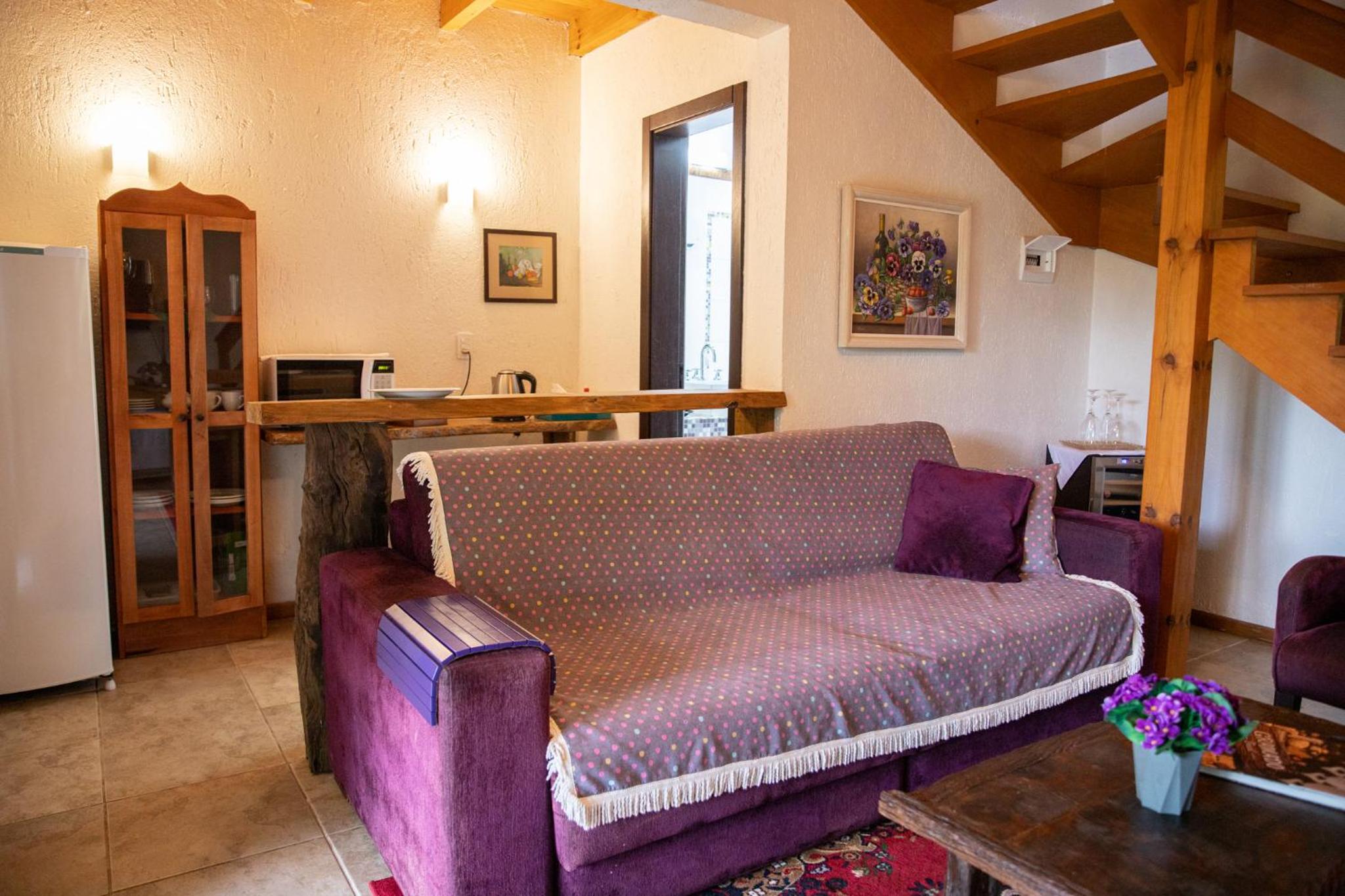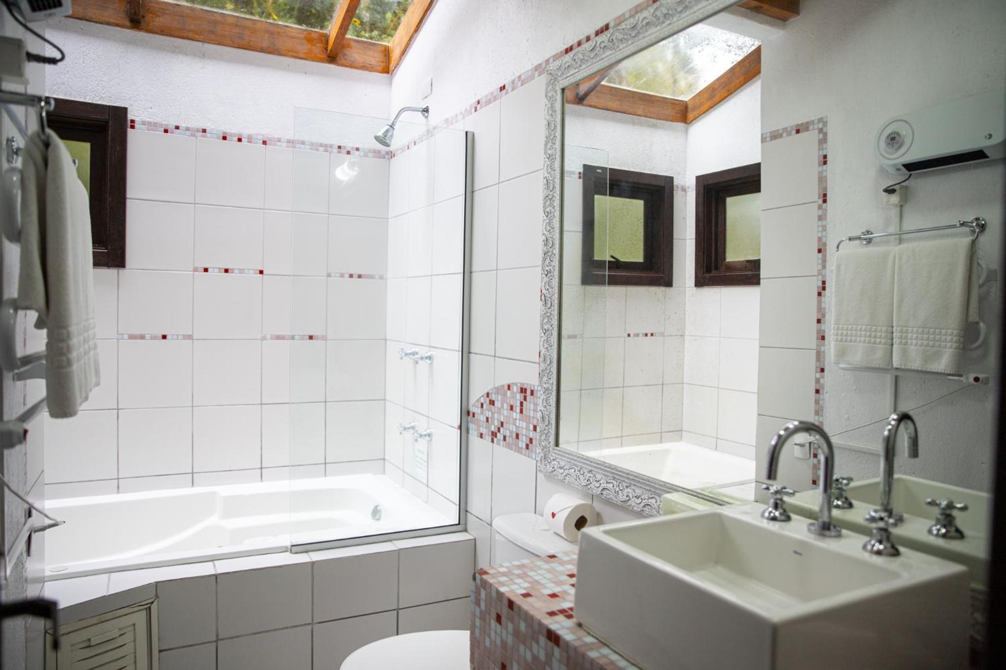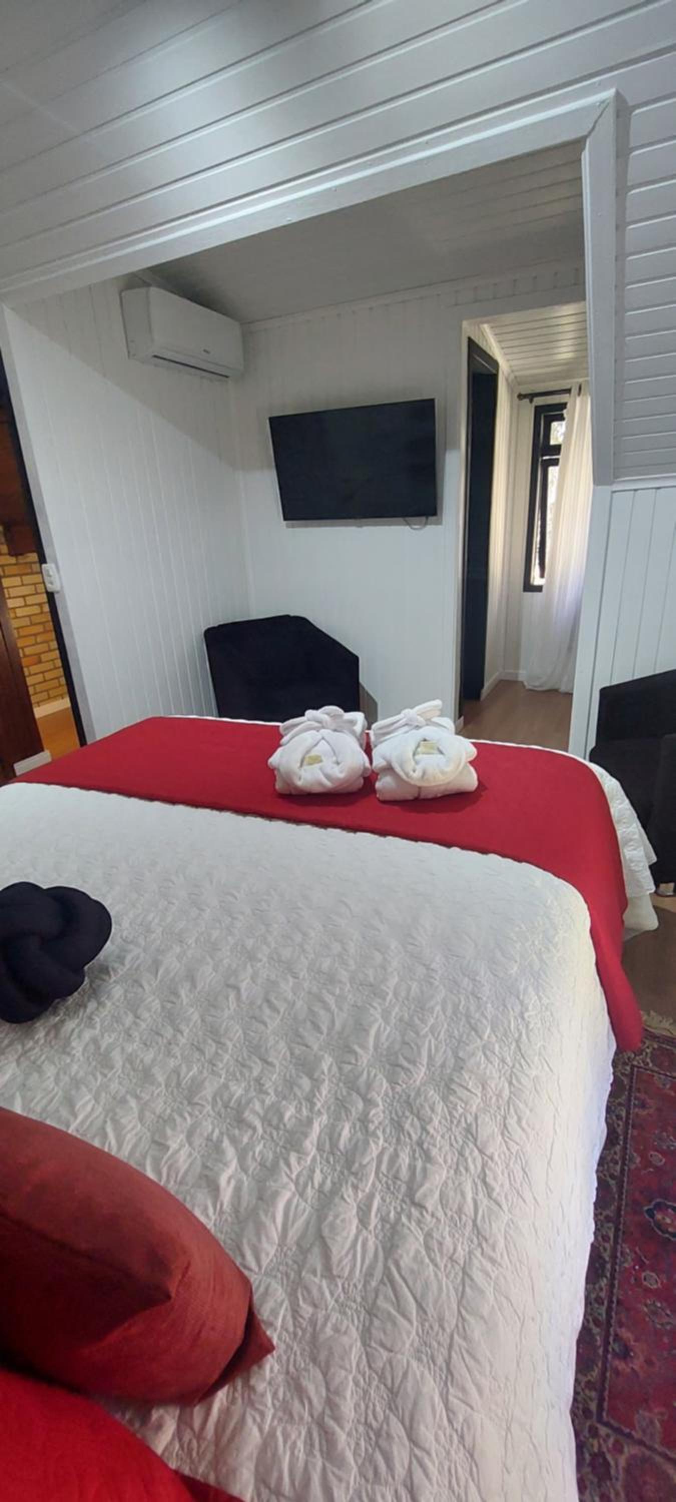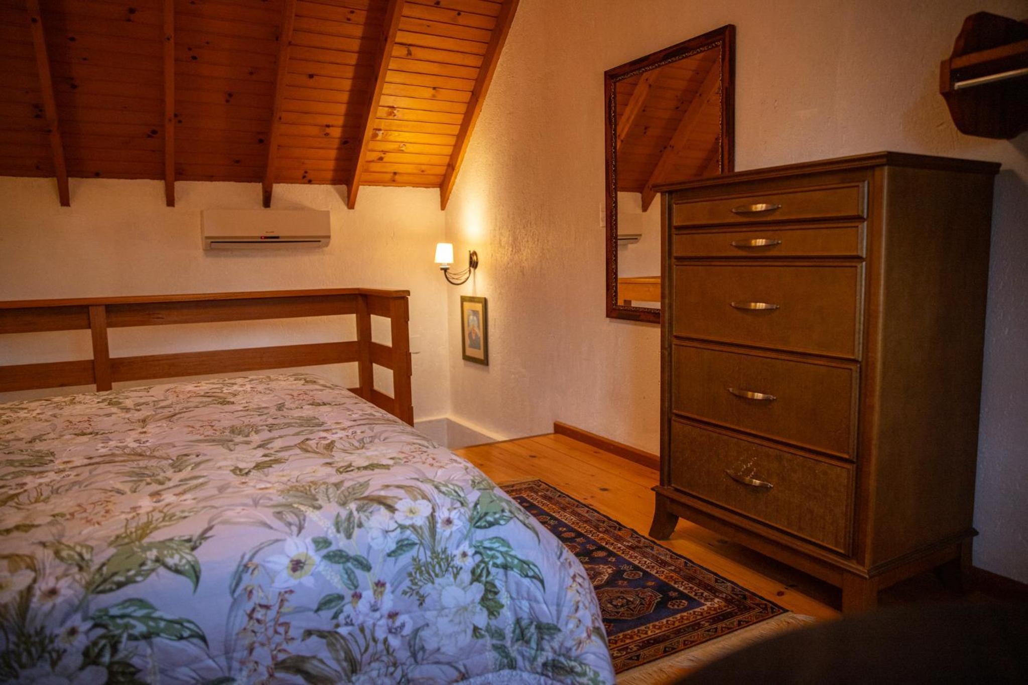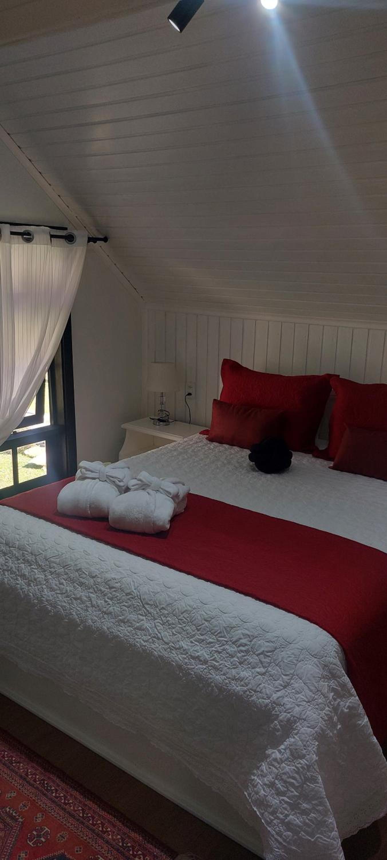 O chalé é amplo e confortável, porém as camas ficam no piso superior, enquanto o banheiro, a lareira e a TV no térreo. Isto causa alguns desconfortos. Se na madrugada há necessidade de ir ao banheiro é preciso descer a escada, algo perigoso. Também se as malas ficarem no piso superior, tem-se de descer com as roupas para tomar banho no térreo. E não há espaço adequado para as malas ficarem no térreo. Se você quer dormir com a lareira acesa, não pode, pois camas e lareira ficam em pisos diferentes. Outro desconforto é quanto ao ar condicionado (quente e frio) que só tem no piso superior. Para dormir é ótimo, mas se você quer assistir TV ou jantar no piso térreo é muito frio. Há necessidade de acender a lareira, mas a lenha só dura 1 ou 2 horas. Ou seja, em dias frios ou em dias muito quentes o piso térreo é desconfortável demais, o que impossibilita almoçar, jantar, assistir TV. Até para tomar banho há desconforto em dias frios, pois não há aquecedor no banheiro, nem no piso térreo.