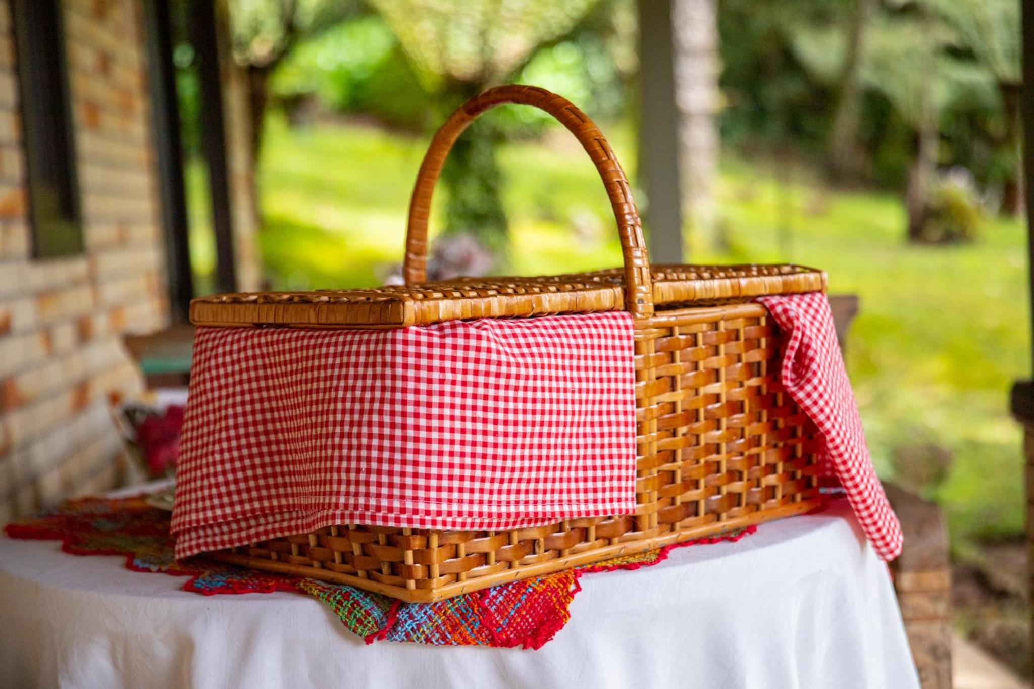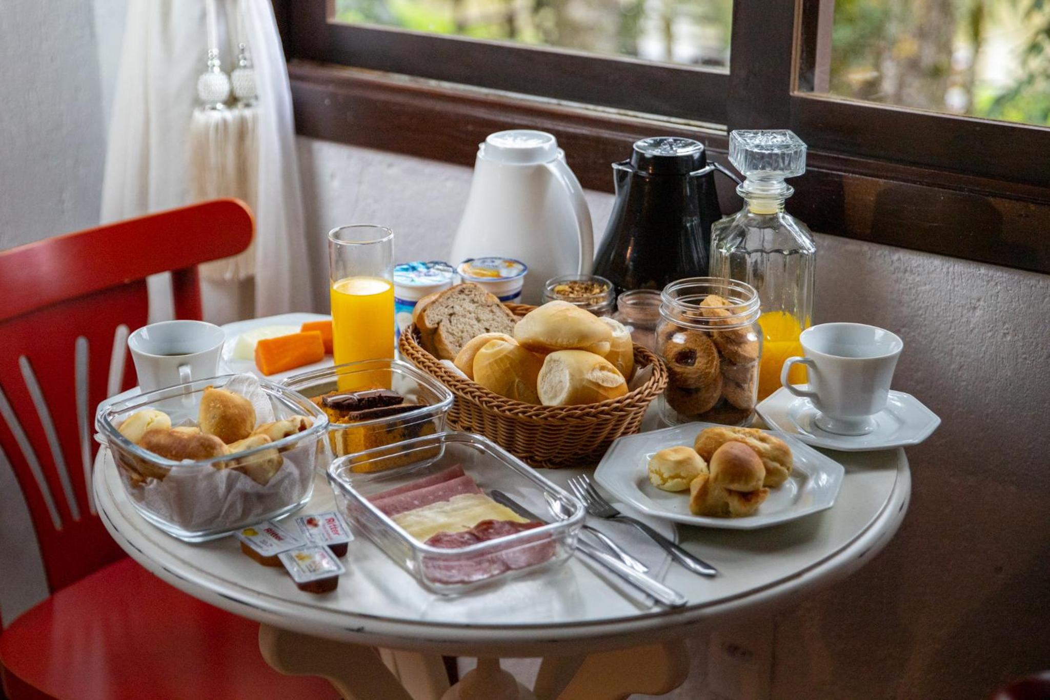 O café da manhã é outro ponto negativo da hospedagem. É servido numa sexta de piquenique pontualmente às 9h. Embora seja algo “romântico”, tem pouca variedade de alimentos, e também em pouca quantidade: um único tipo de fruta, um único tipo de suco, um único tipo de bolo, apenas 2 mini pães franceses e 4 fatias de pão de forma. Pouca quantidade de manteiga, geleia, queijo e frios, tudo muito “contatinho”. Até talheres, louças e guardanapos descartáveis vêm em pequena quantidade. Algo interessante é suficiente para um piquenique, mas não para café da manhã.