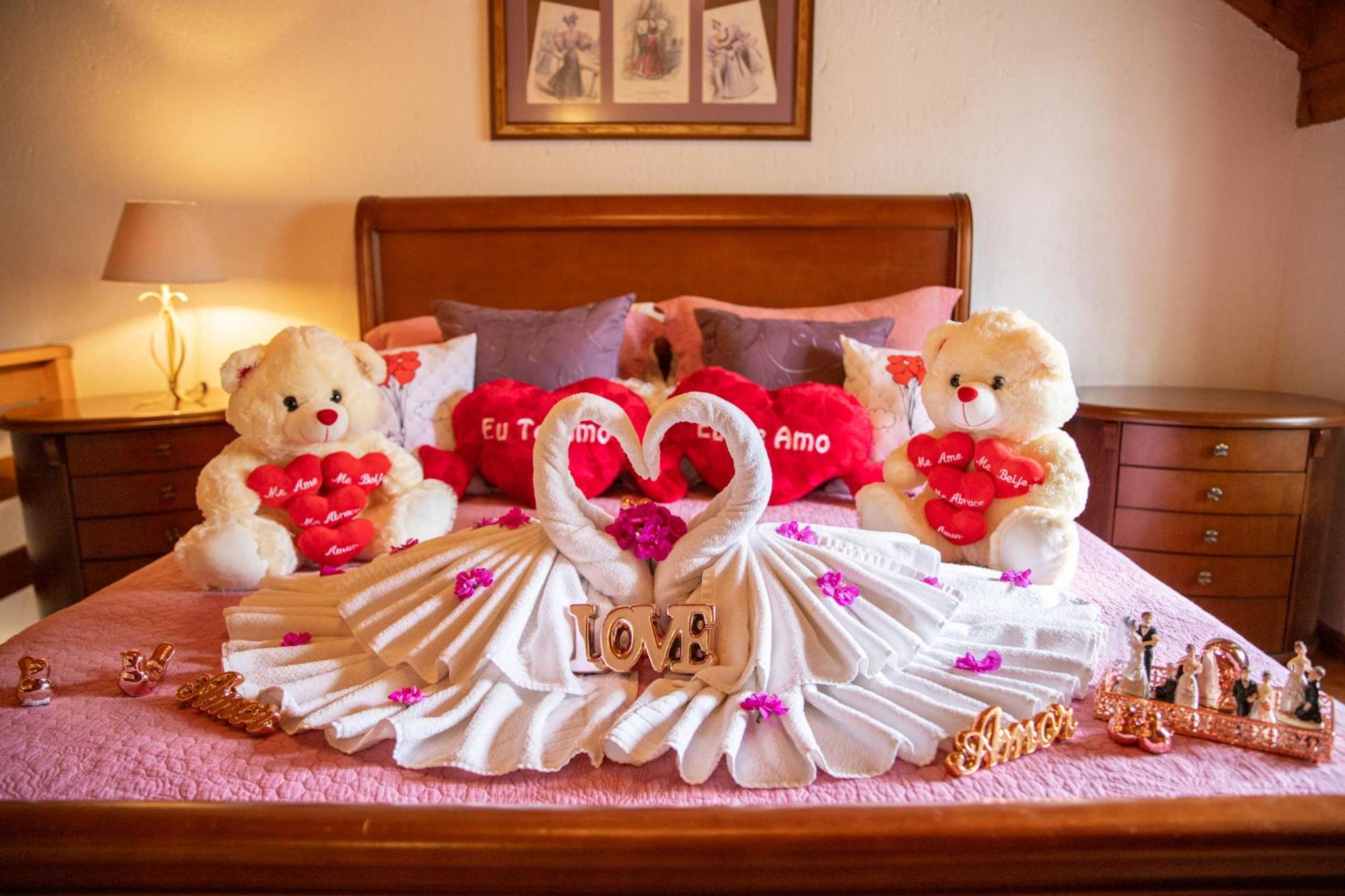 Indulge in comfort in our charming chalets featuring spa baths, stone fireplaces, and private balconies with forest views. Relax in a hot tub and unwind in a cozy atmosphere with pastel pink themes and flowery décor.