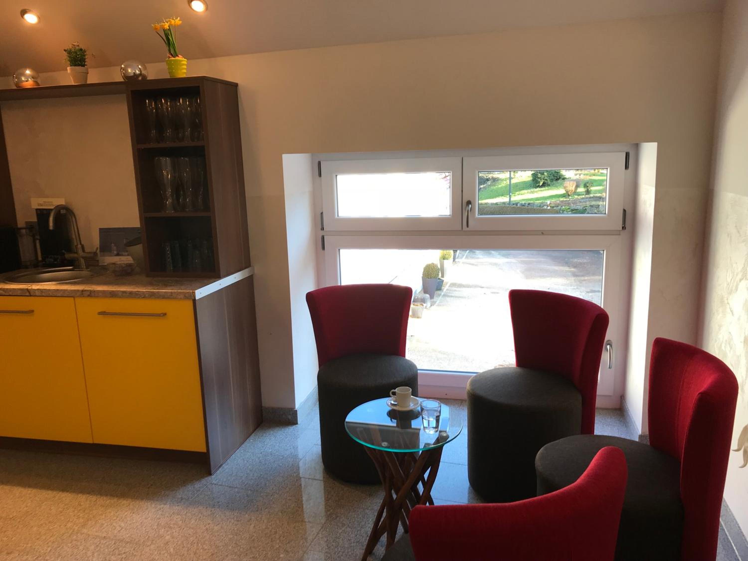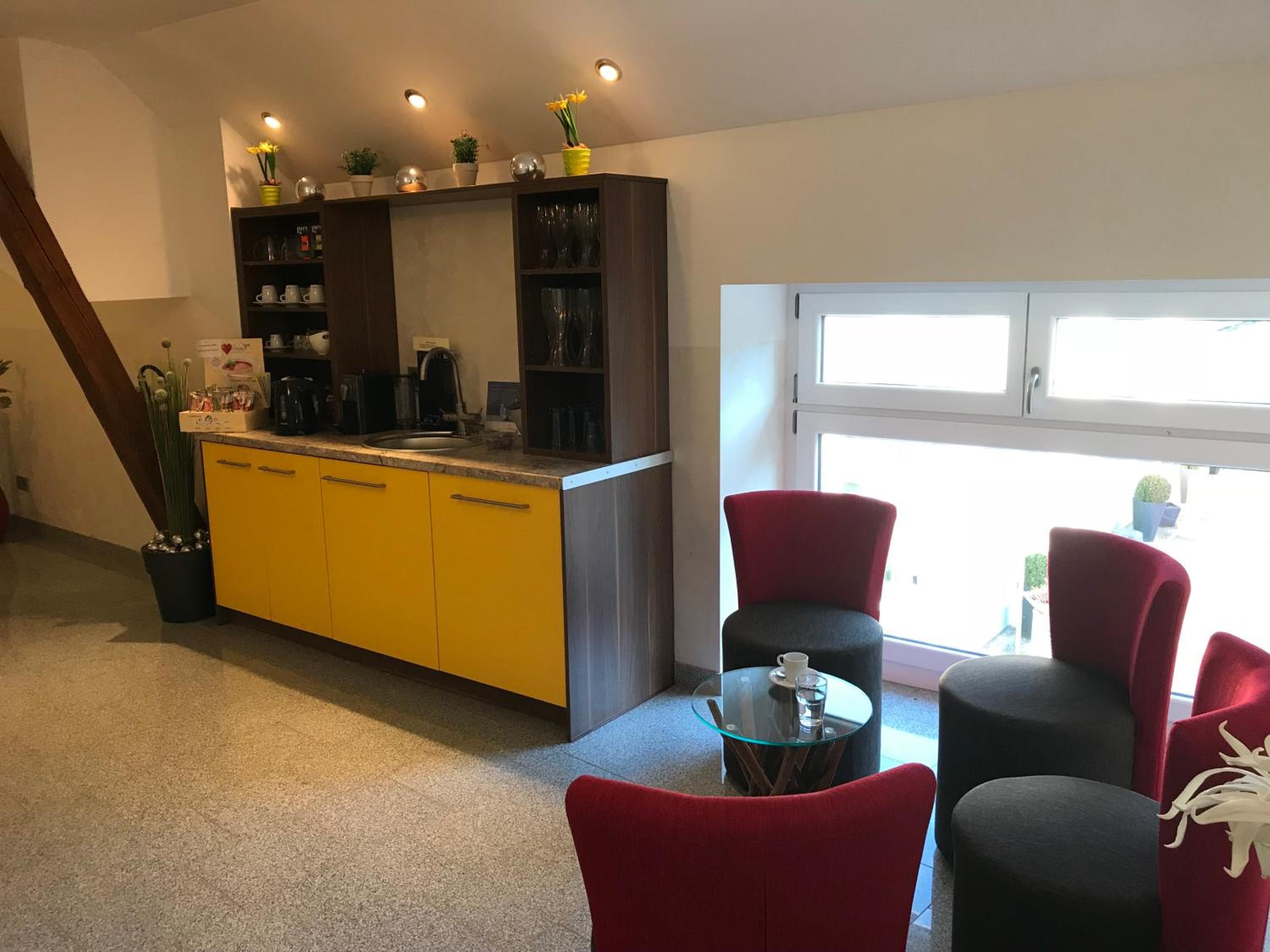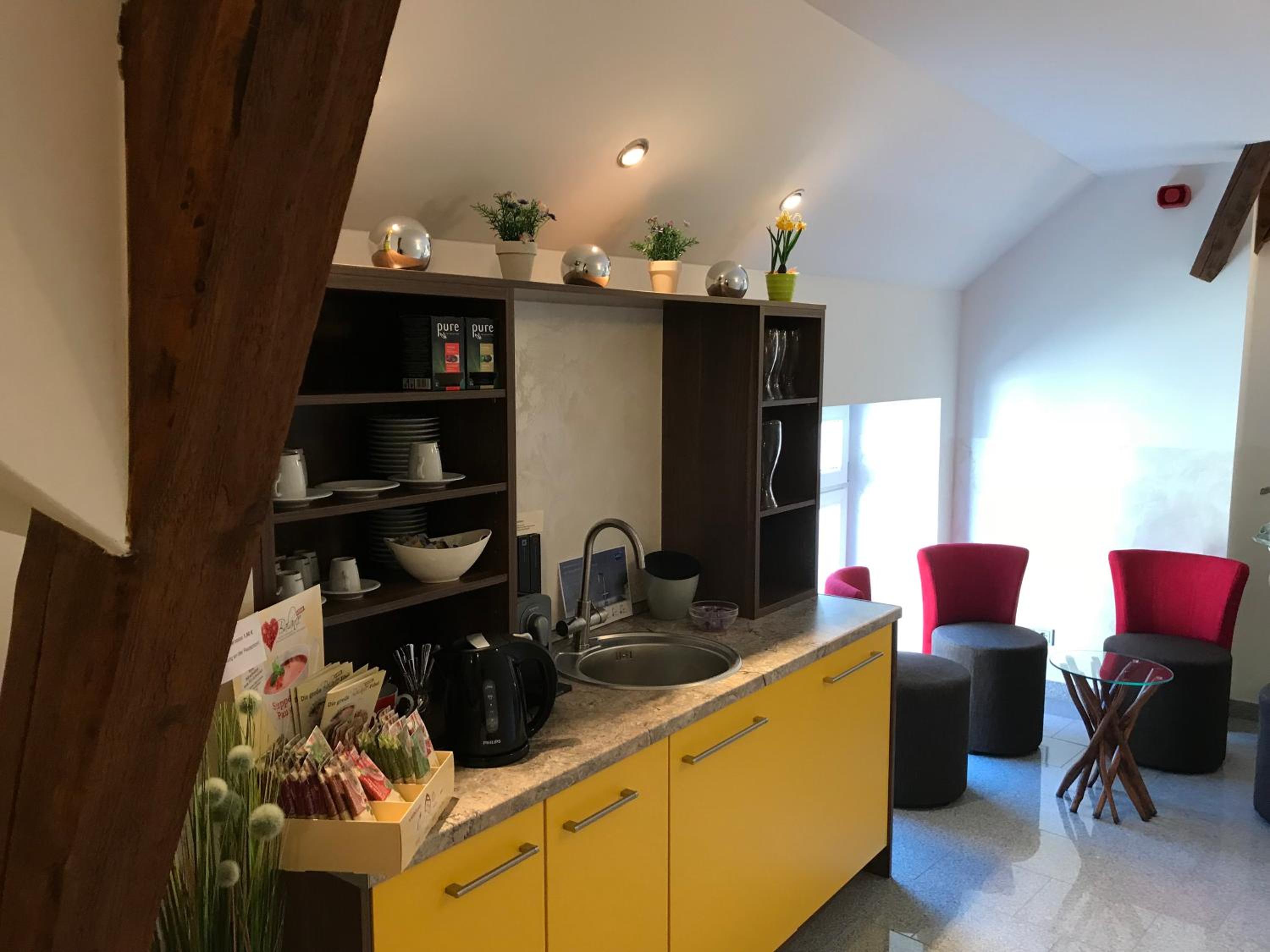 Es gibt eine Wasser- und Kaffebar zur Selbstbedienung.