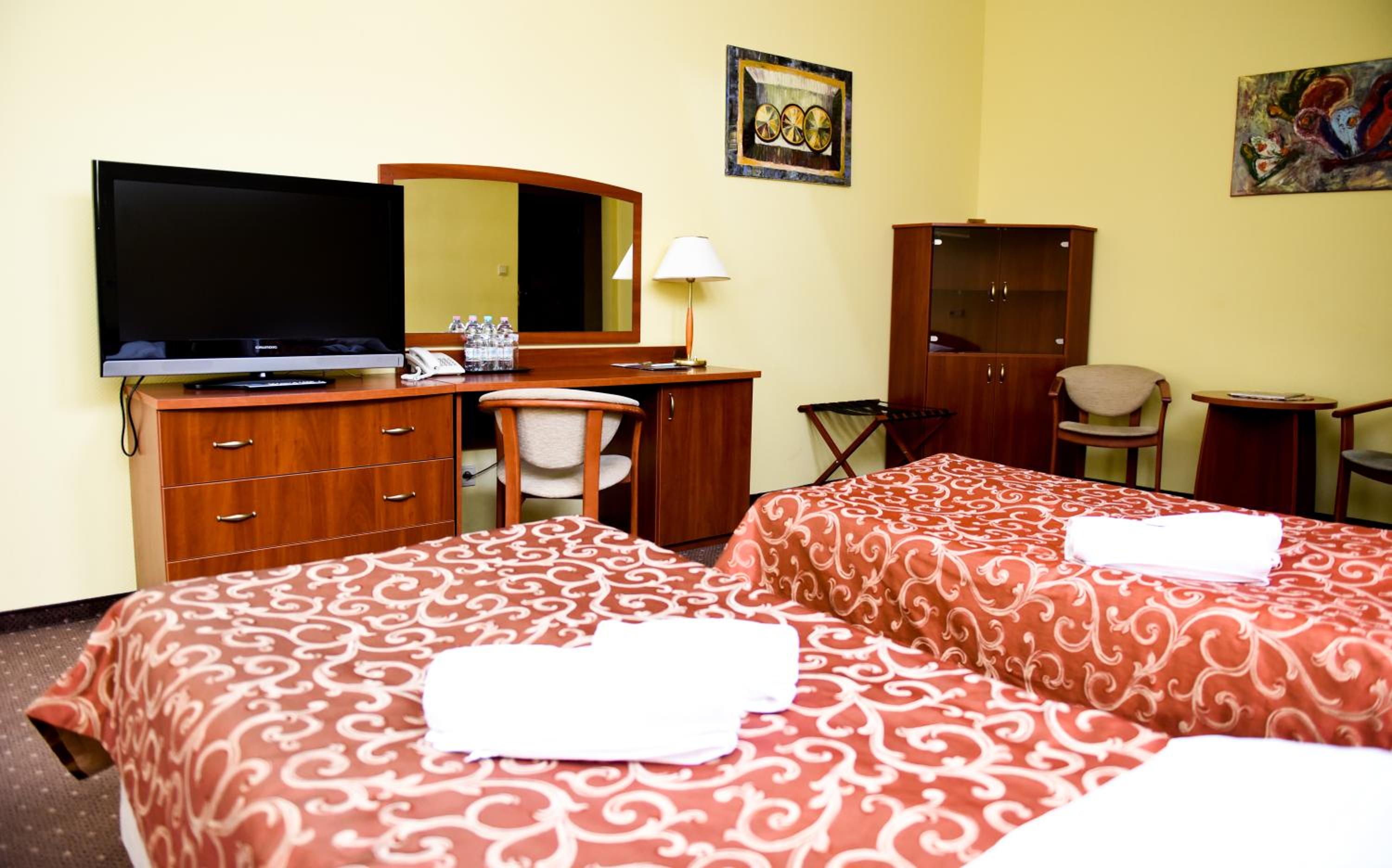 Comfort and Convenience: Relax in well-equipped rooms featuring flat-screen TVs, private bathrooms, and cozy bedding. Benefit from English and Polish-speaking staff at the 24-hour front desk.