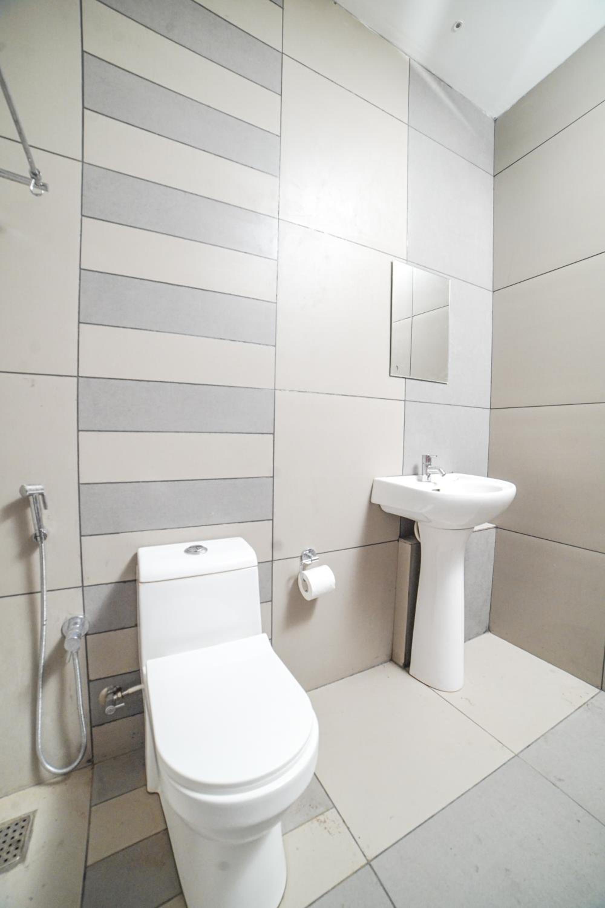 The dim lit bathroom n stink