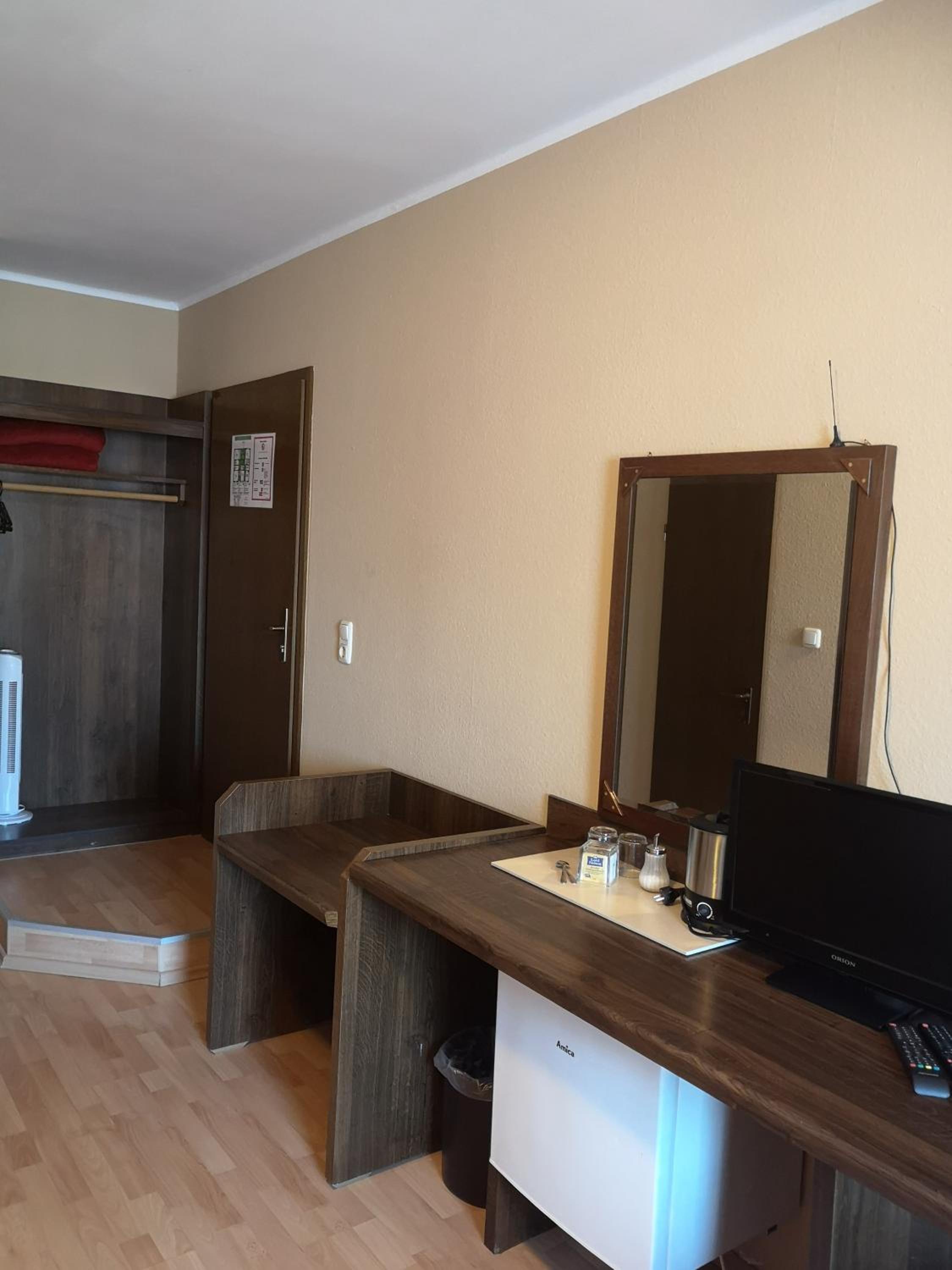 Die Zimmer müssten renoviert werden.An der Decke hangen Tapetenfetzen runter,es ist nach einem Wasserschaden nur notdürftig repariert worden . Die Zimmereinrichtung ist sehr Veraltet .