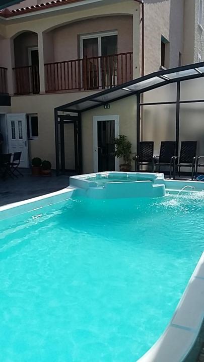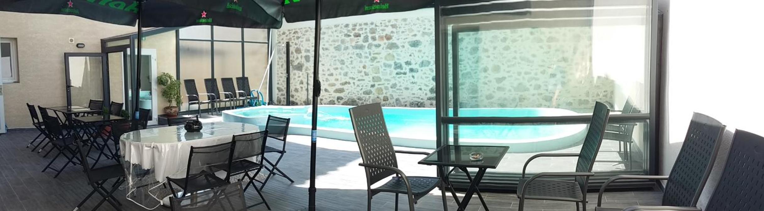 Unwind by the seasonal outdoor pool at Palais Cathare, perfect for a refreshing dip or lounging in the sun. The pool area offers a tranquil setting for guests to enjoy during their stay.