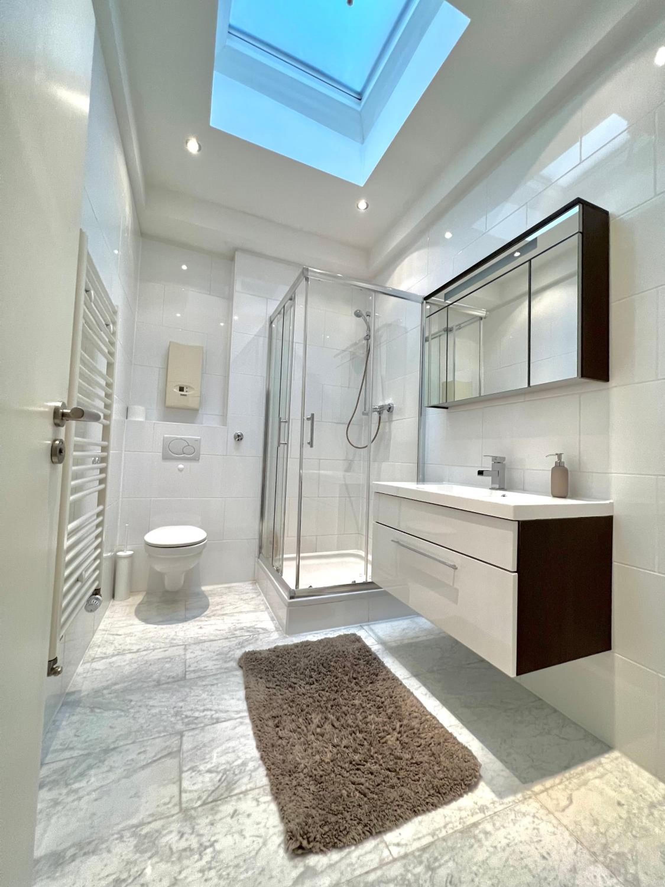 Im Bad kein Shampoo bzw Duschzeug… die Dusche war kaputt, Kalk am Waschbecken… Wasserflecken im Bad….