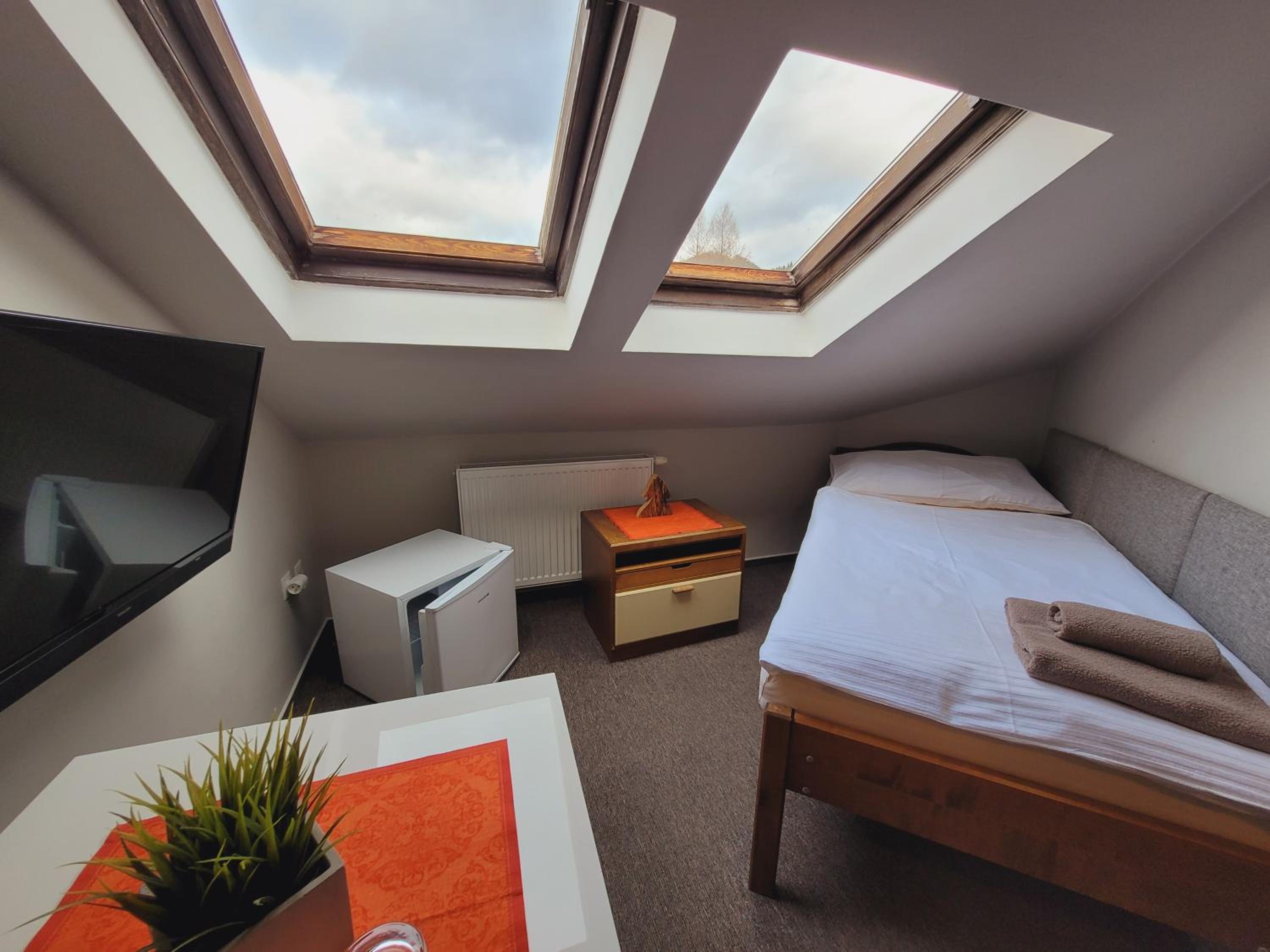 Měl jsem malinký podkrovní pokoj se dvěma malými okýnky a postelí pod svažující se střechou. Bohužel mi bylo jasné, že je jen otázkou času, než při vstávání z postele narazím hlavou do stropu...