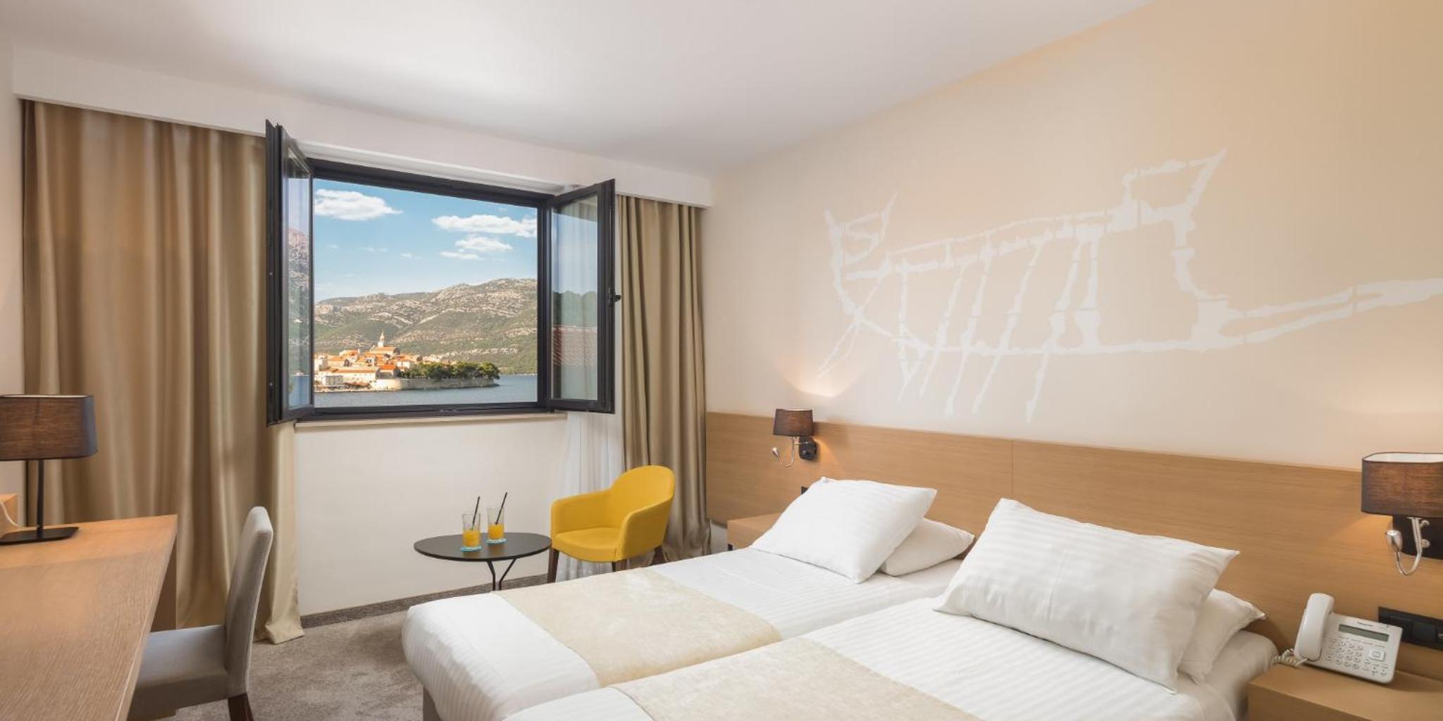 Experience enchanting views of Korčula Old Town and Mediterranean-inspired interior design reminiscent of Liburna ships at Aminess Liburna Hotel.
