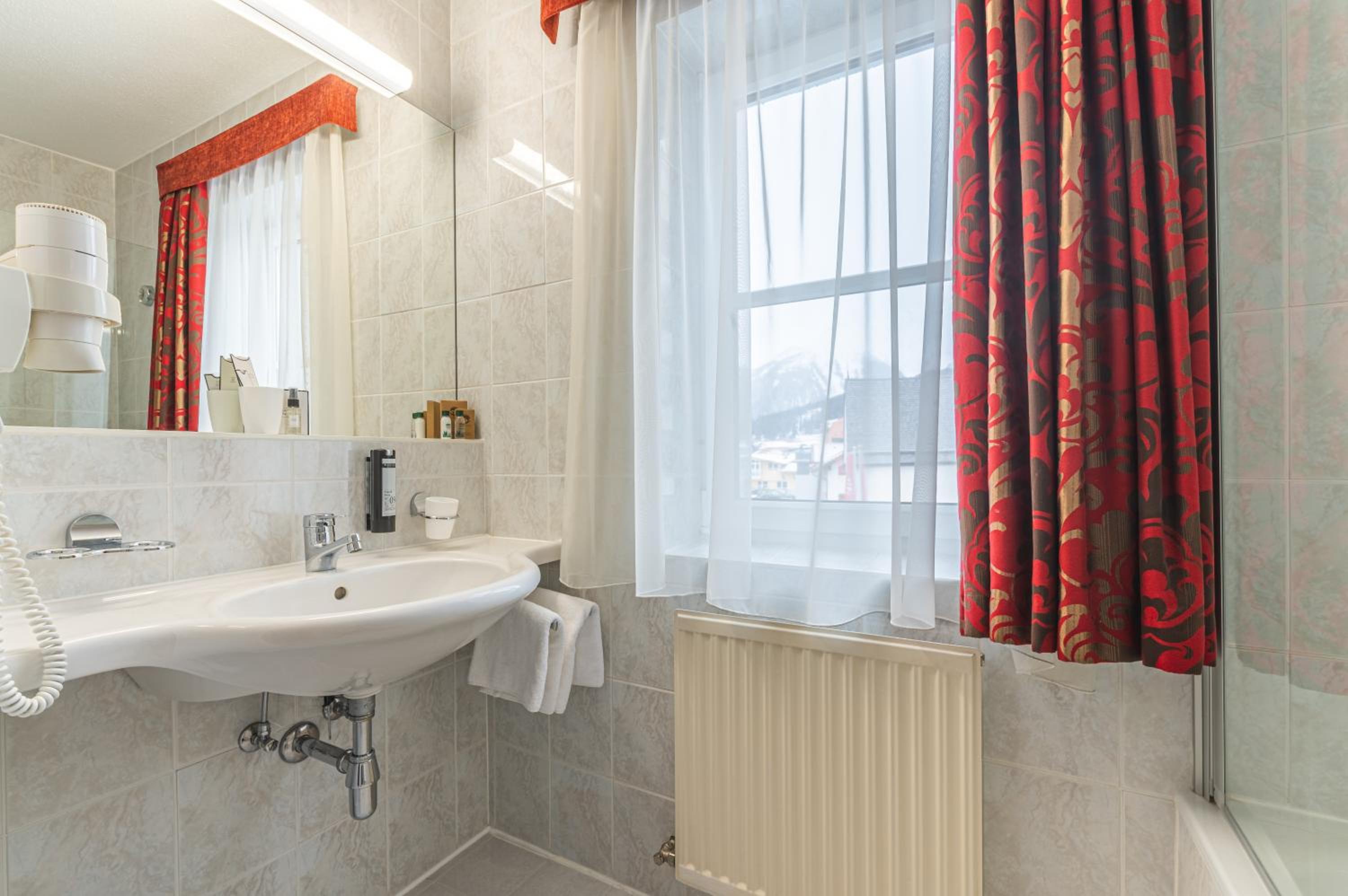 Die Lage ist sehr zentral, Bushaltestelle gegenüber dem Ski-Keller, sehr praktisch. Zimmer war großzügig, man hatte Platz, auch im Bad. Frühstück war in Ordnung.