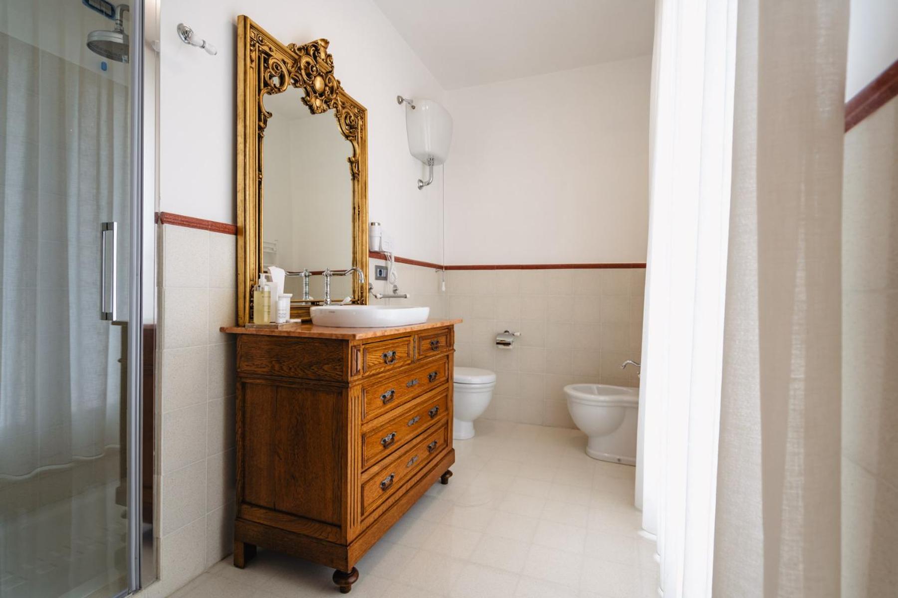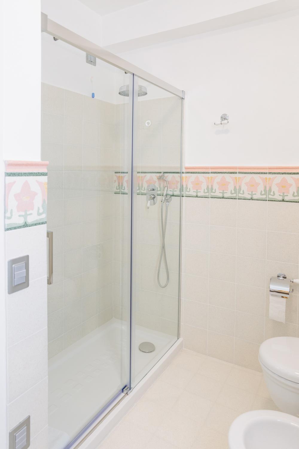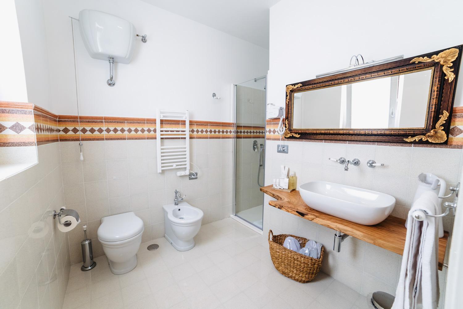 Bagno con box doccia bellissimi e ben tenuti( ottima l'idea di avere bagnoschiuma,sapone, shampoo e crema a portata di mano).