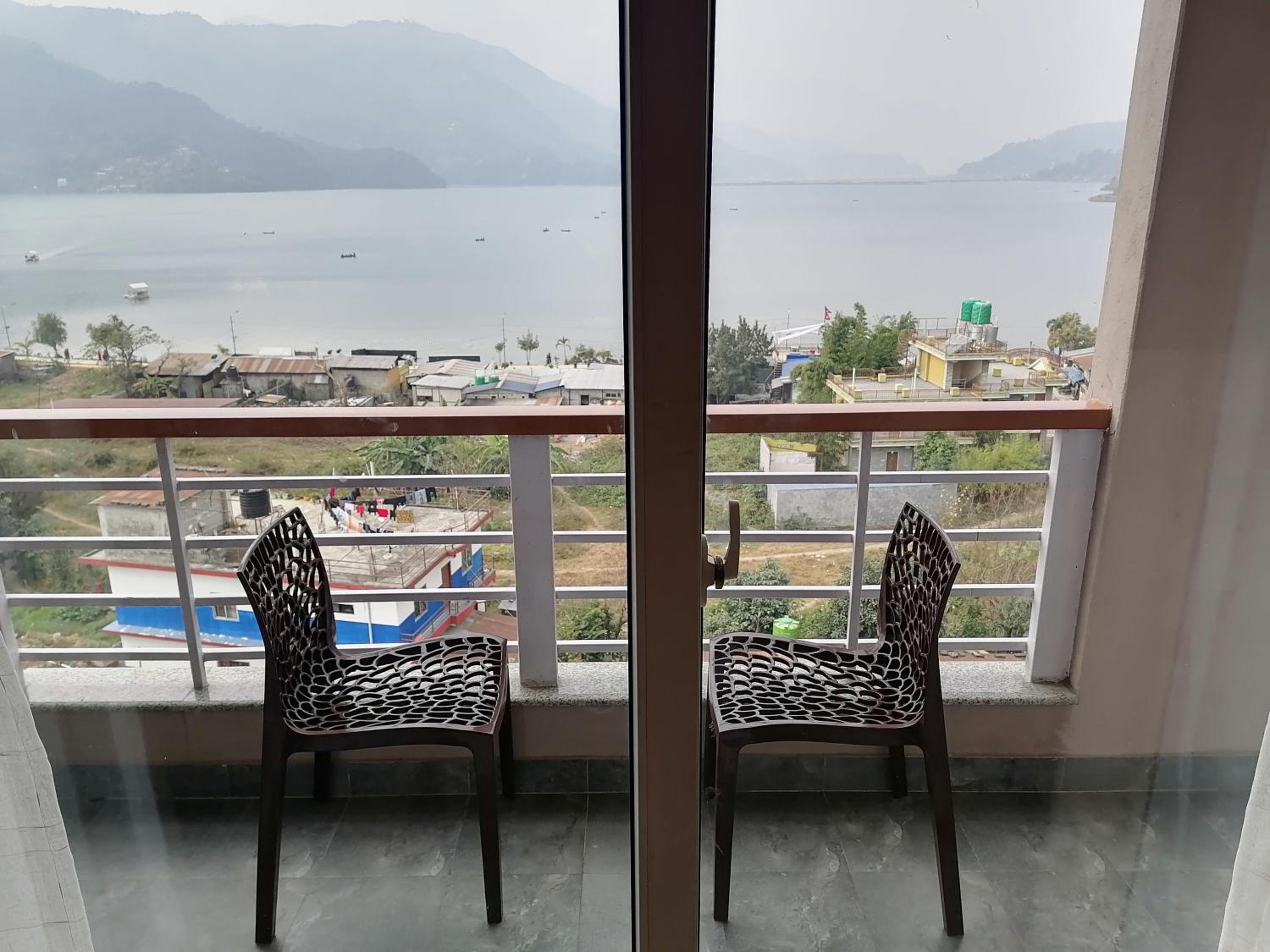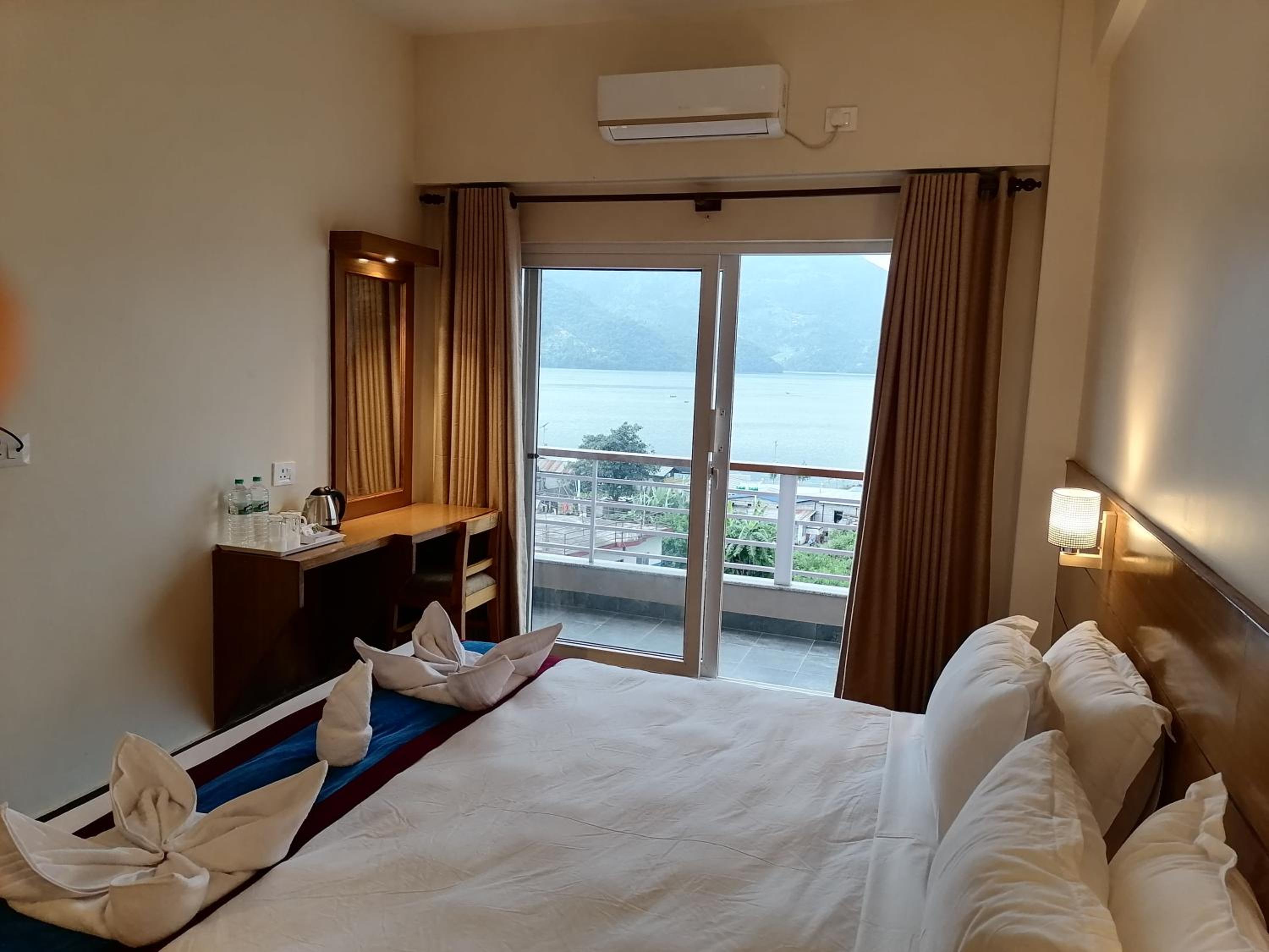 Nice view of lake, mountain, sarangkot, shiv statue and world peace pagoda. The bathroom has hot water, and the beds are comfortable enough.