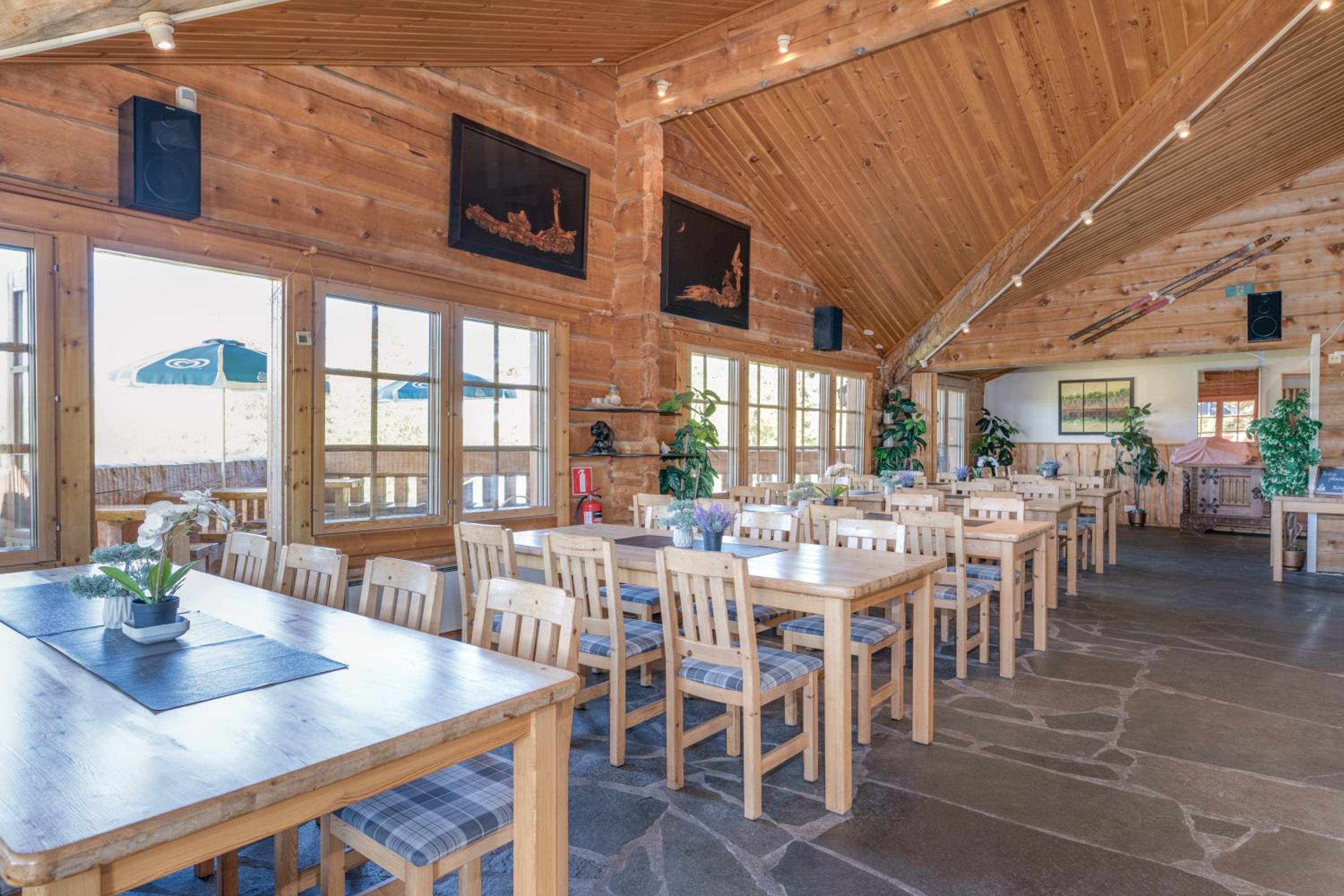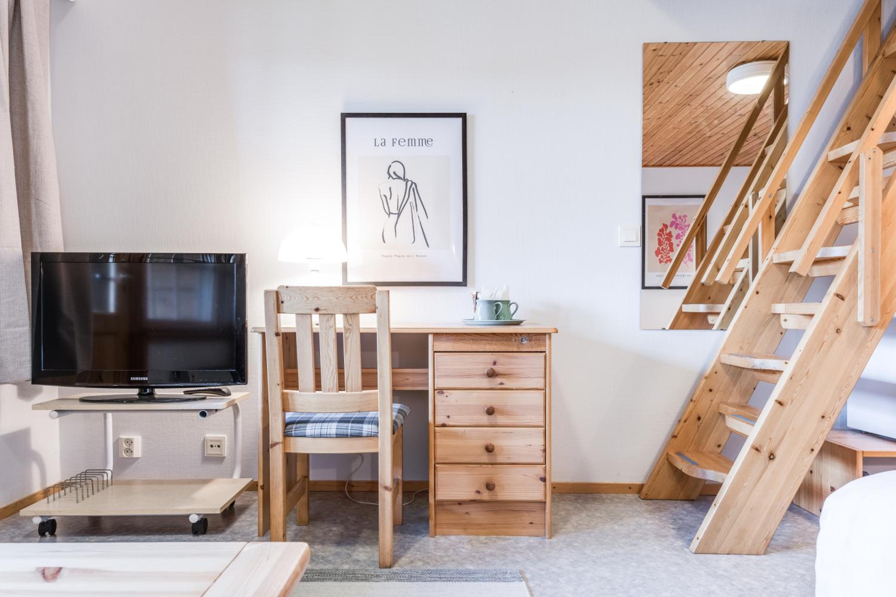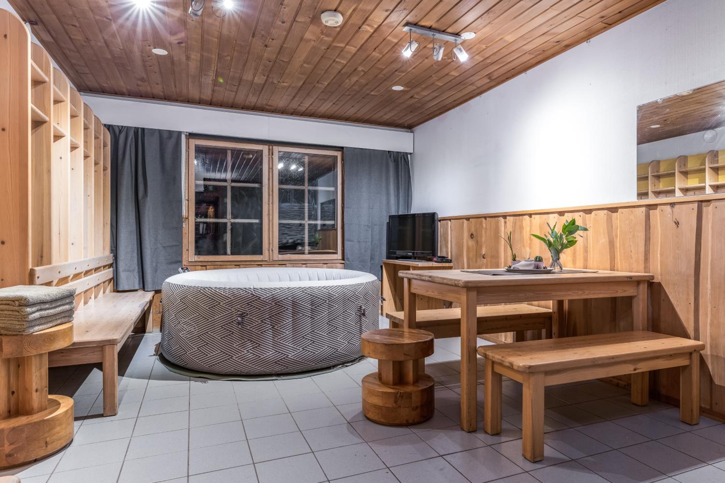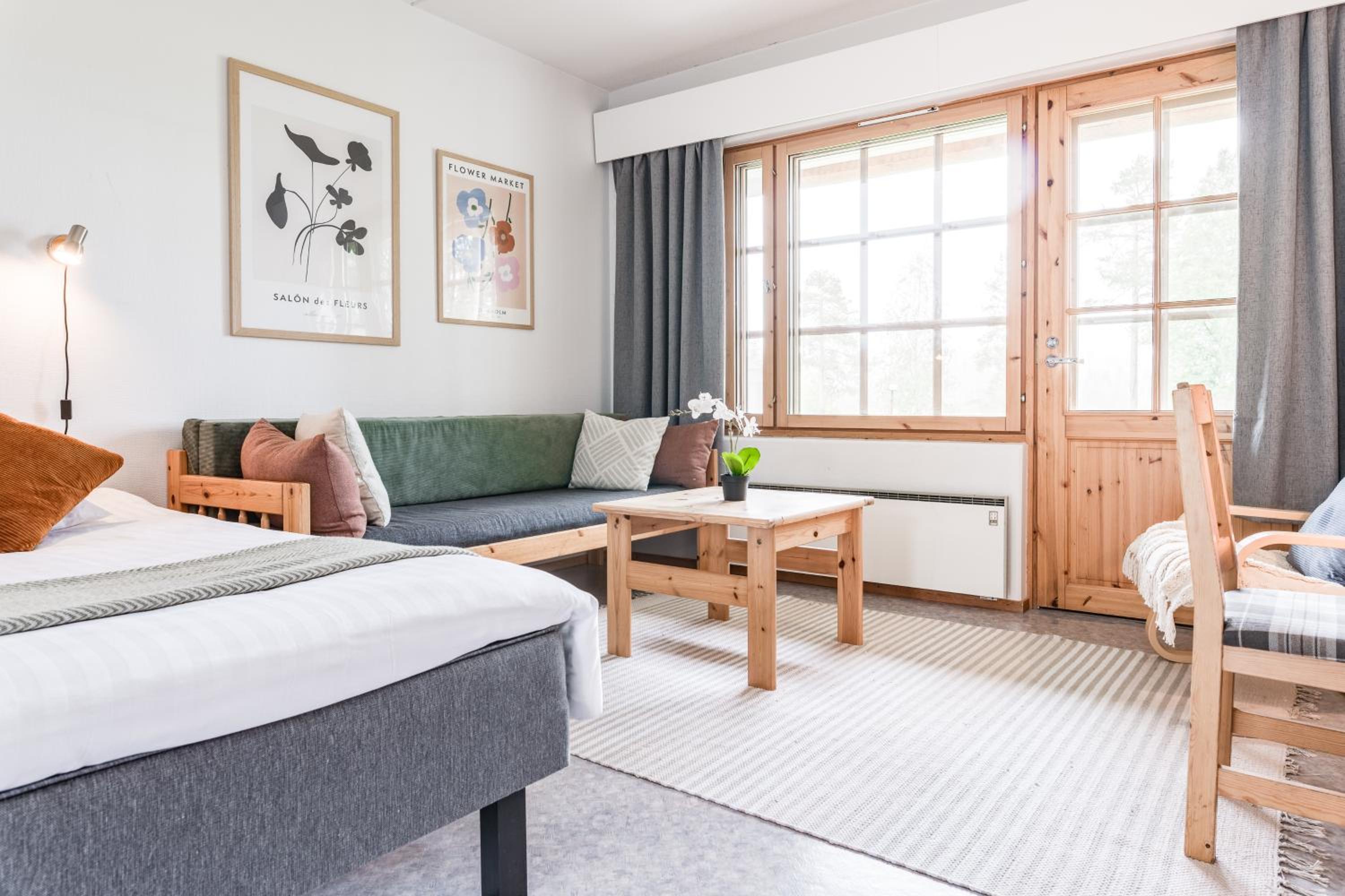 Huone oli mukavan mökkimäinen ja ravintolassa oli hyvä ruoka. Oli mukava kun pääsi saunaan.