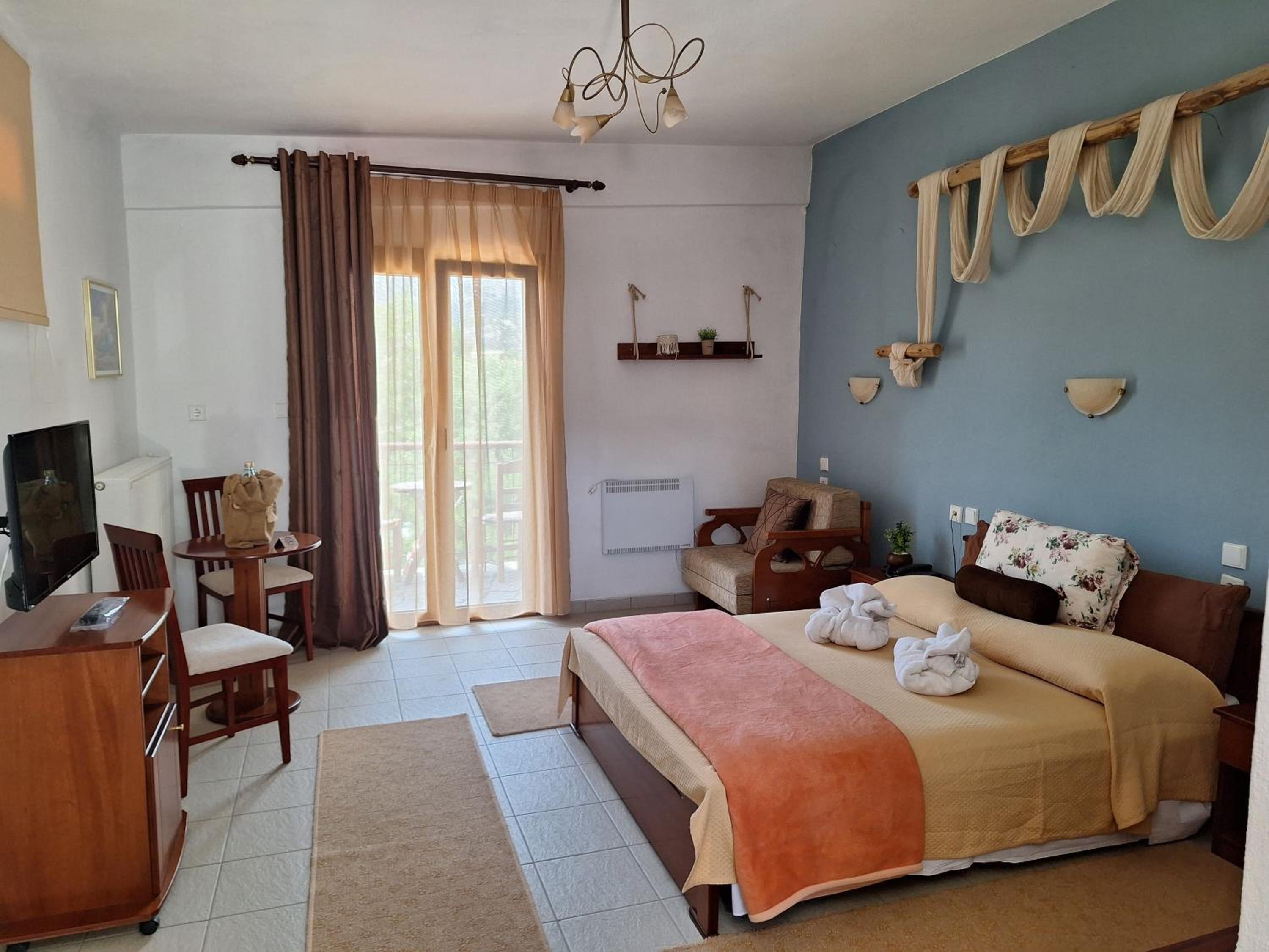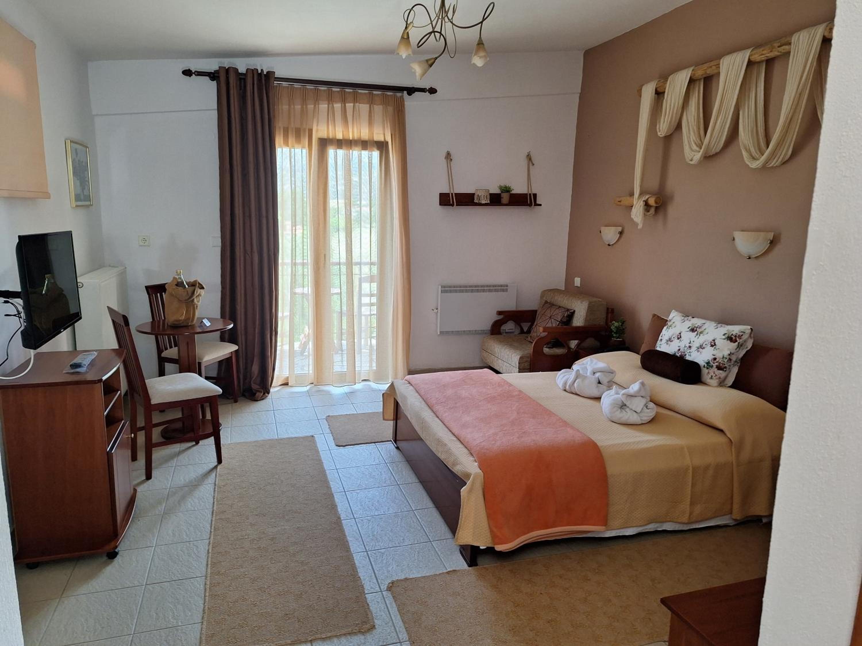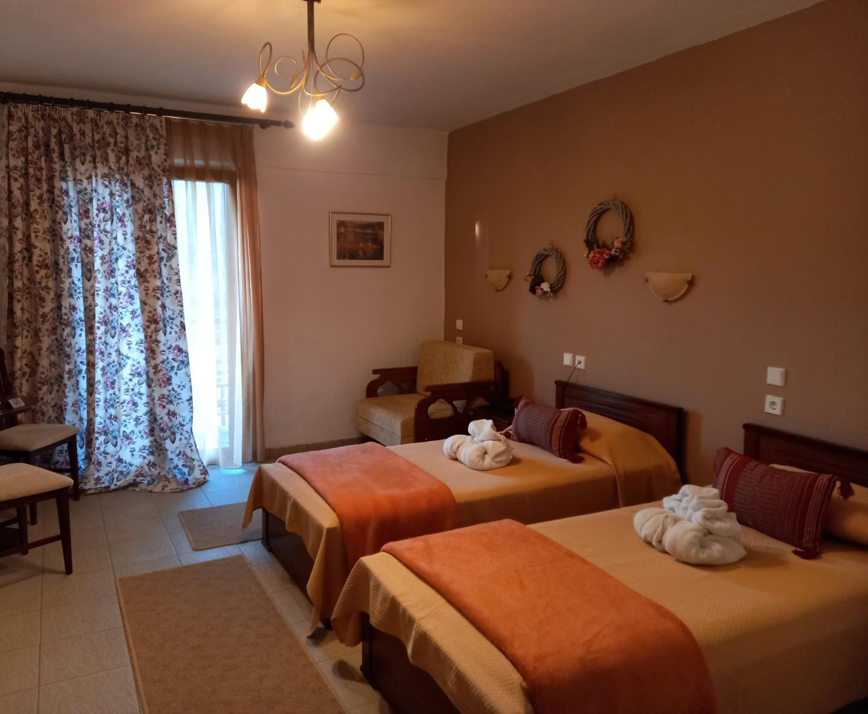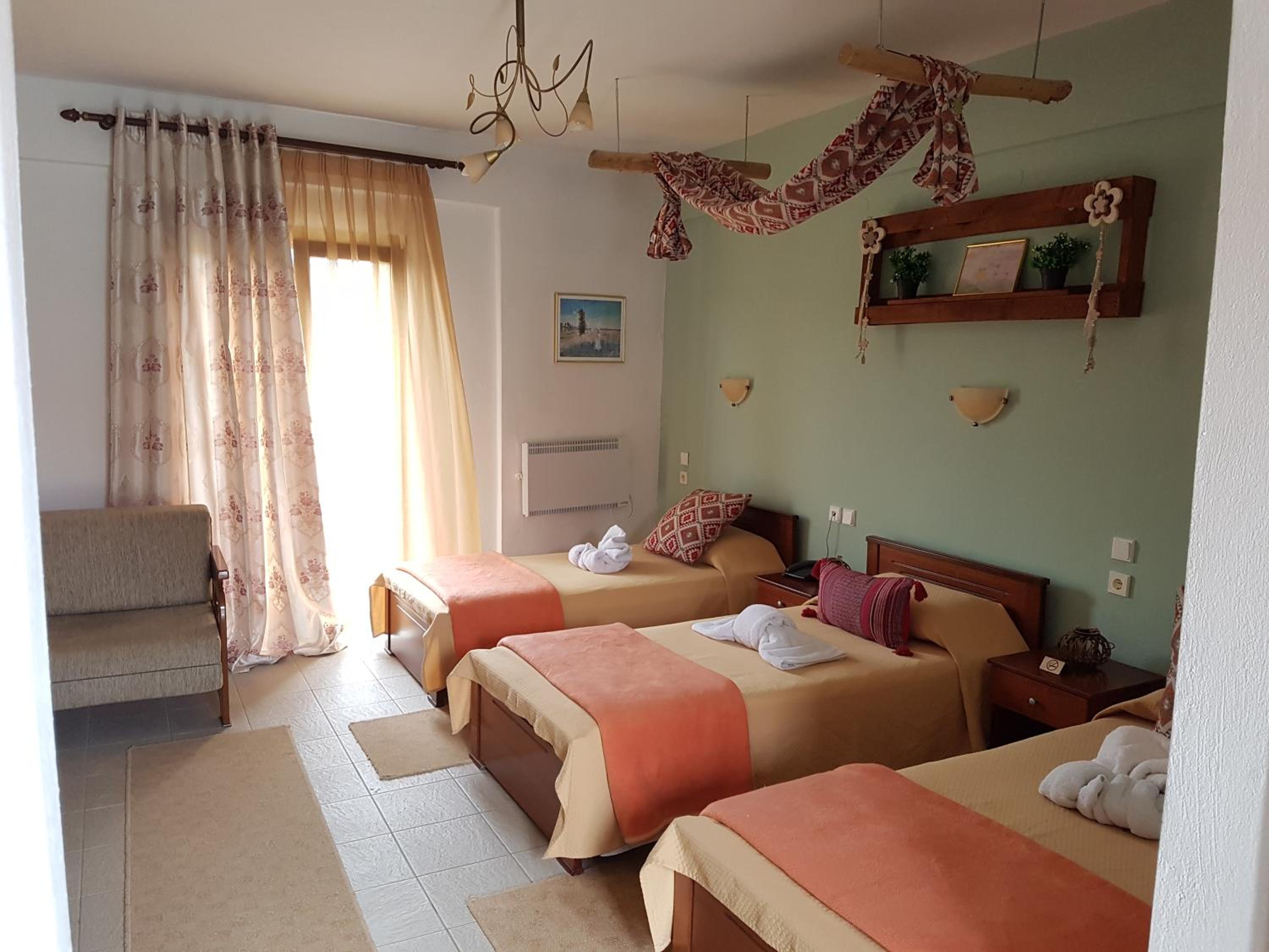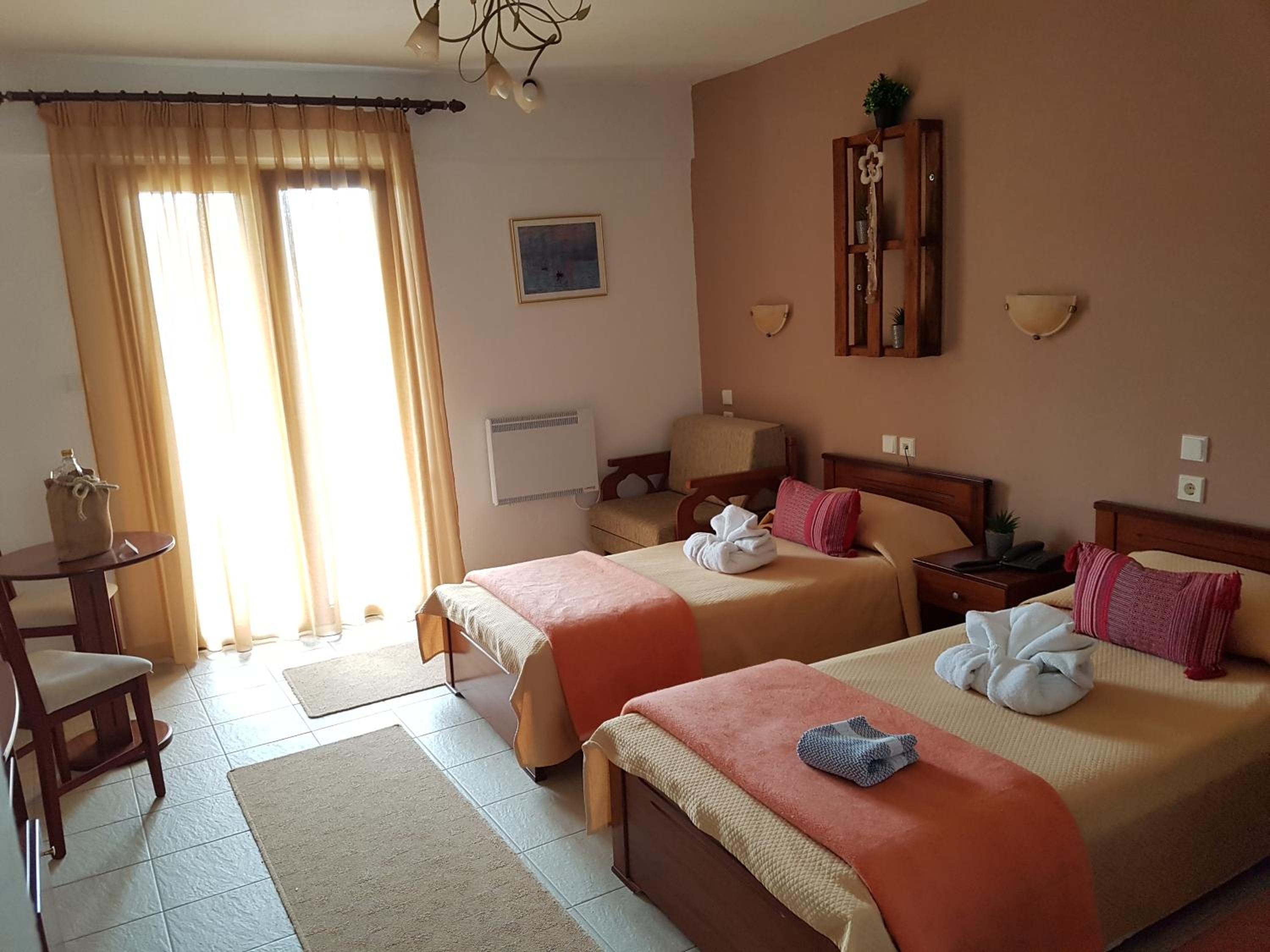 The rooms are clean and with a balcony. Comfy beds. Very friendly family staff and the best breakfast. A lovely little village where rural Greece is real, the villagers going about their lives and the food is good.