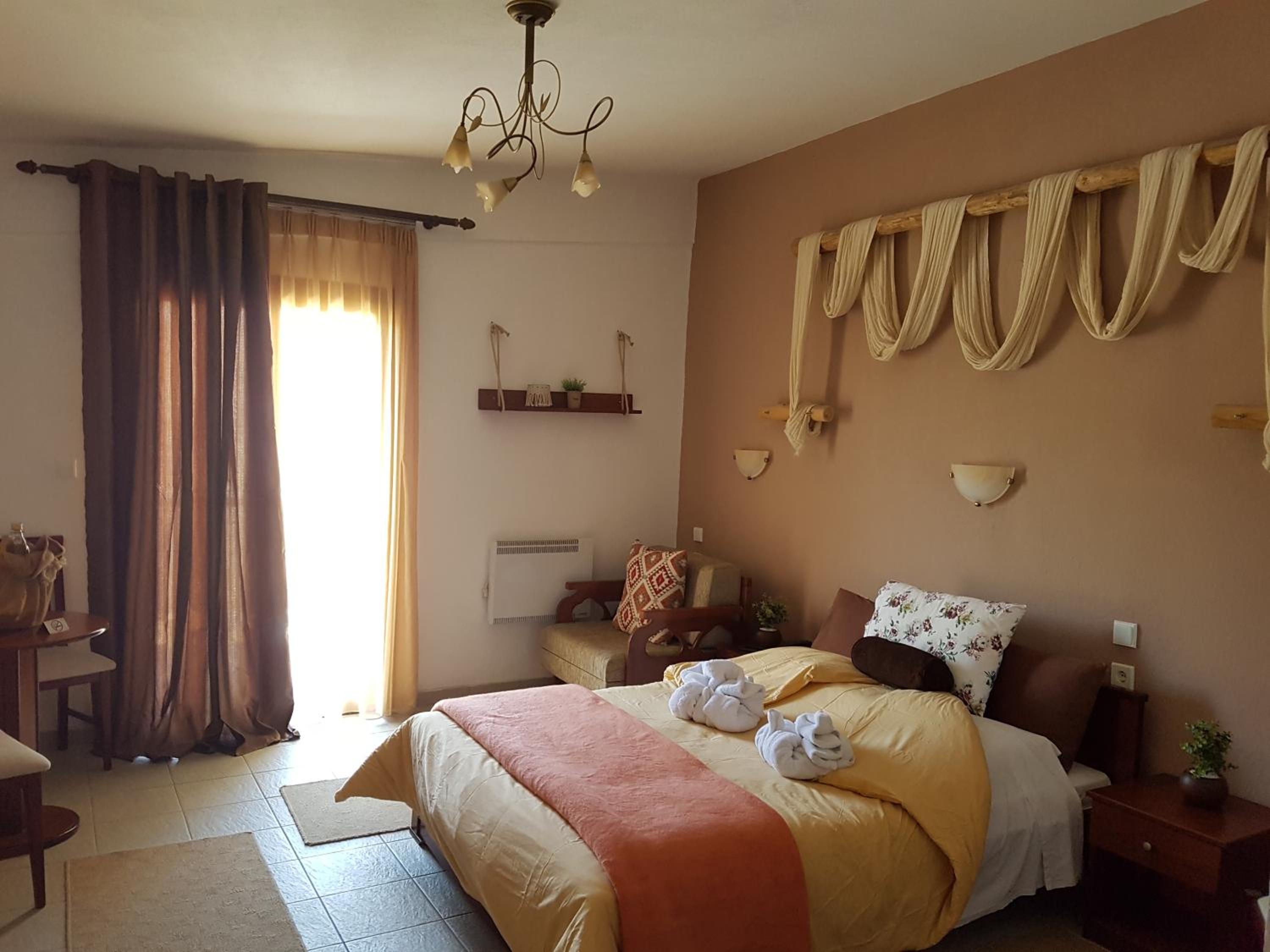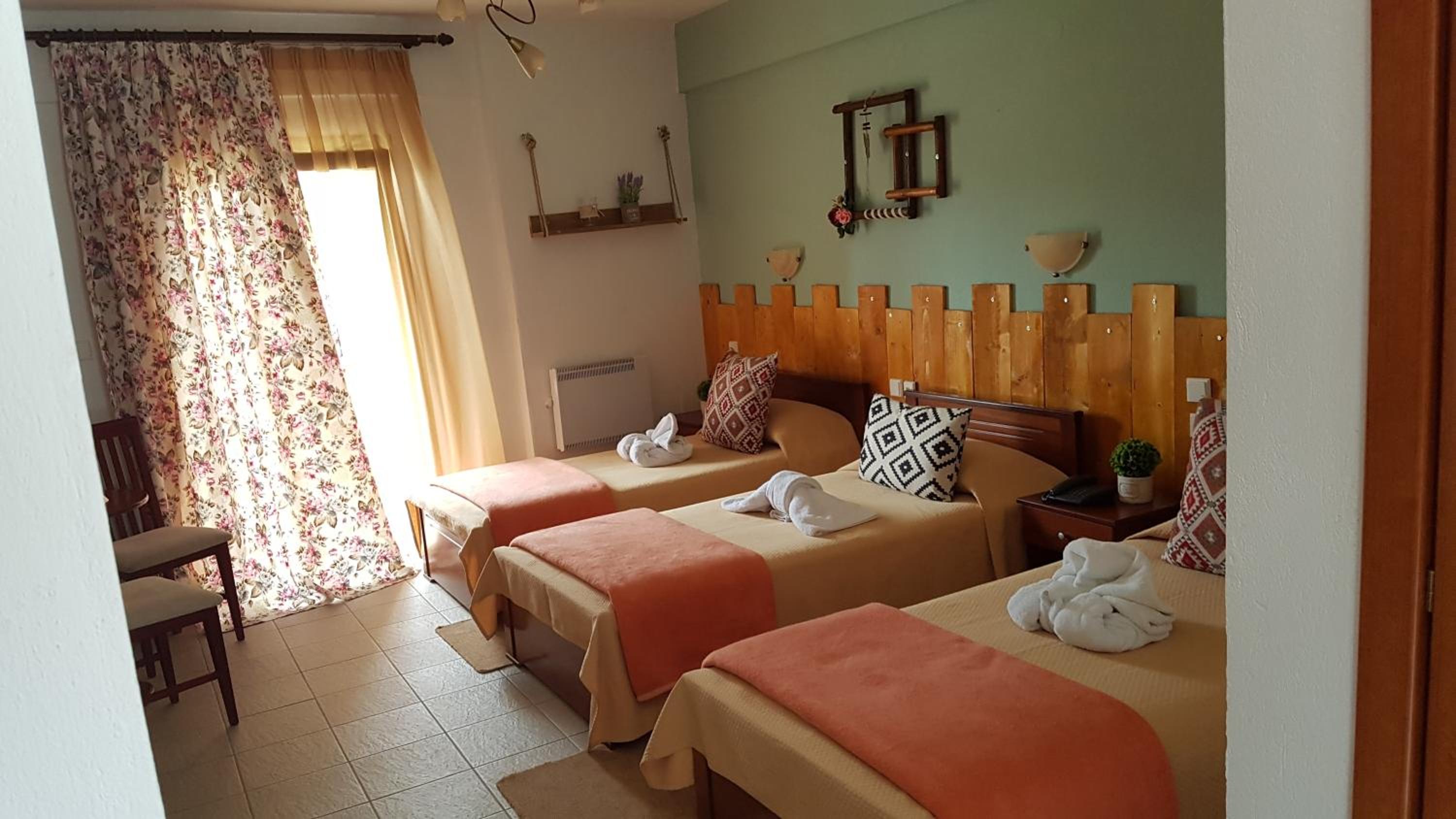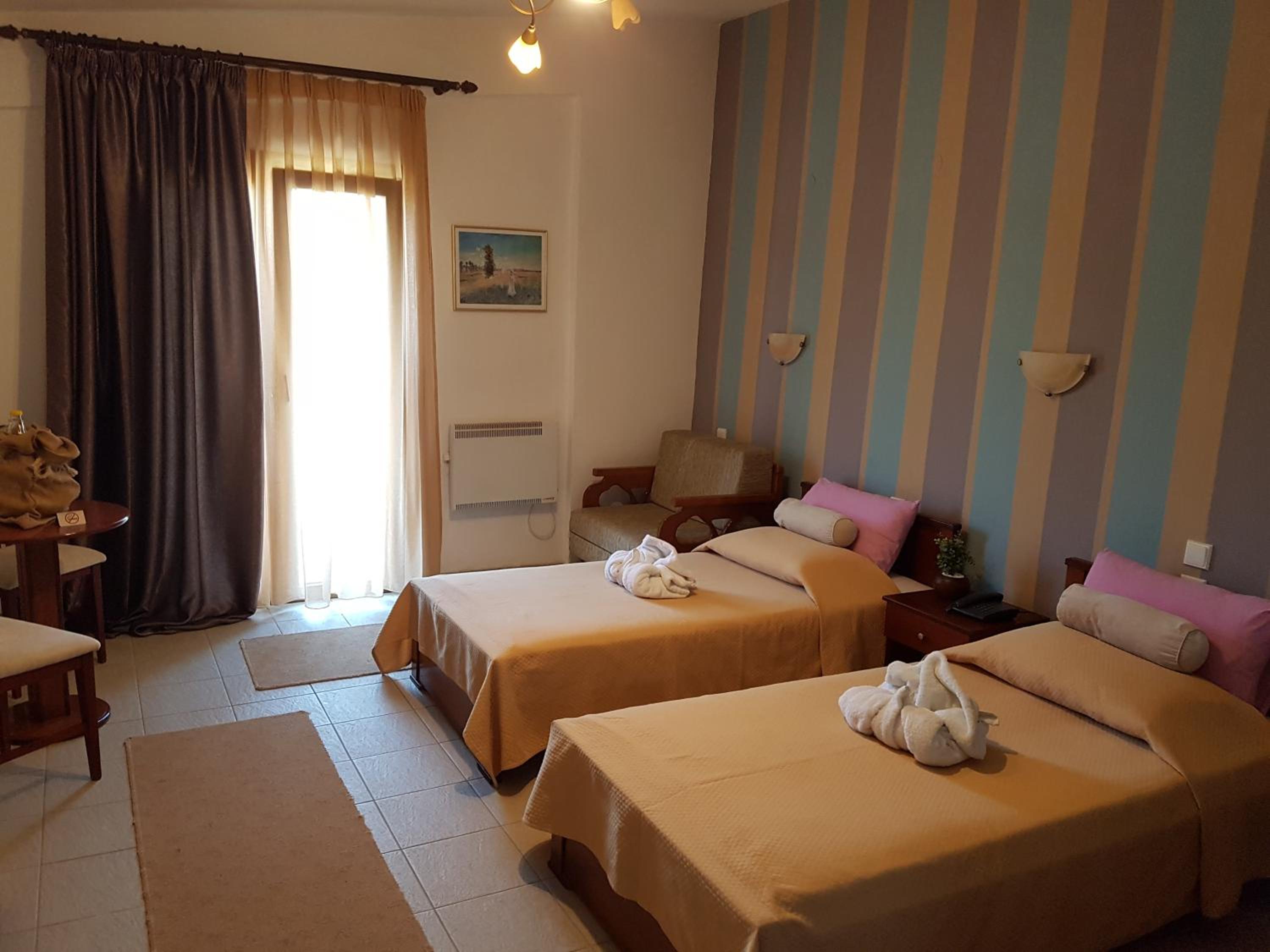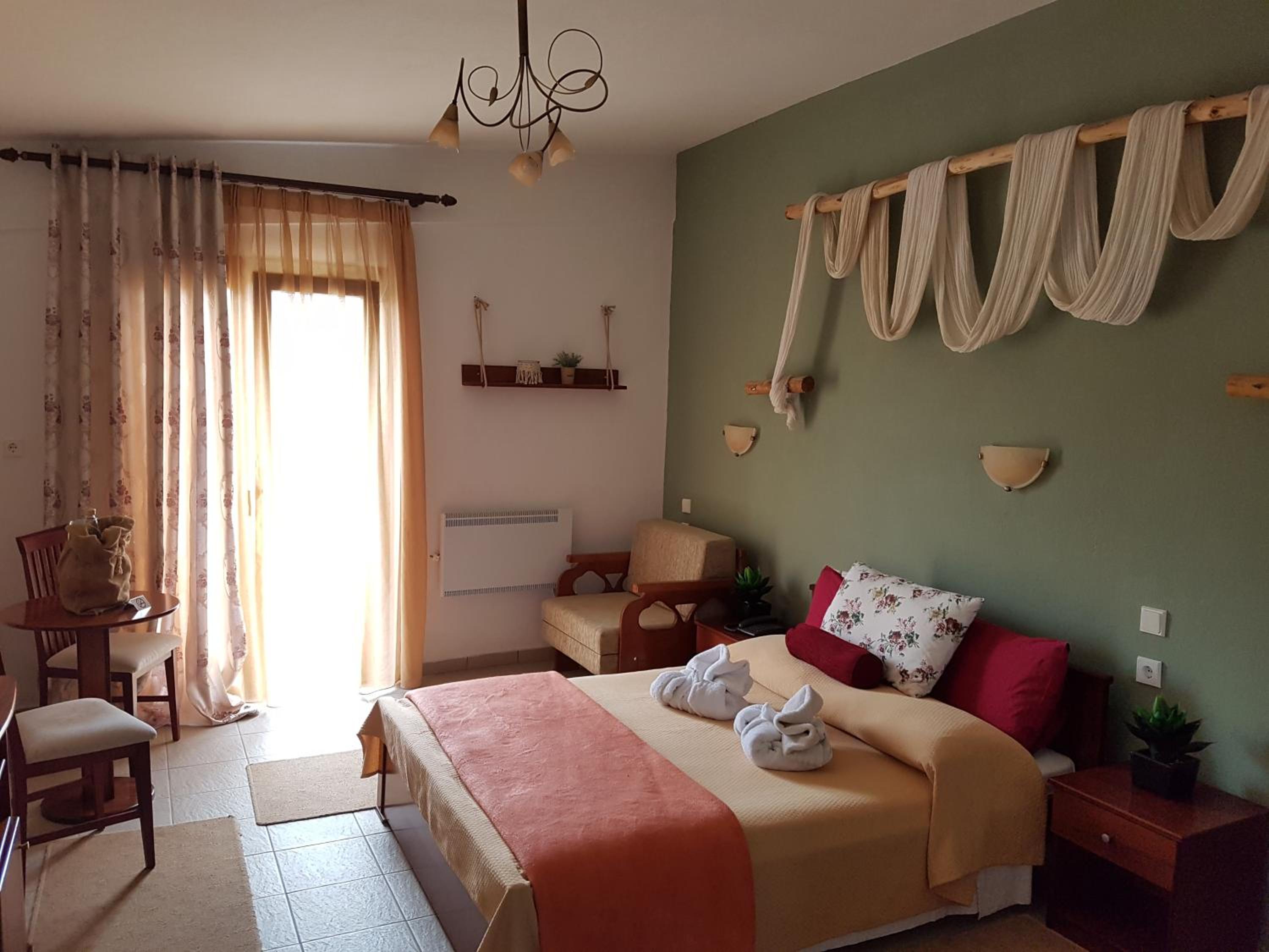 The rooms are clean and with a balcony. Comfy beds. Very friendly family staff and the best breakfast. A lovely little village where rural Greece is real, the villagers going about their lives and the food is good.