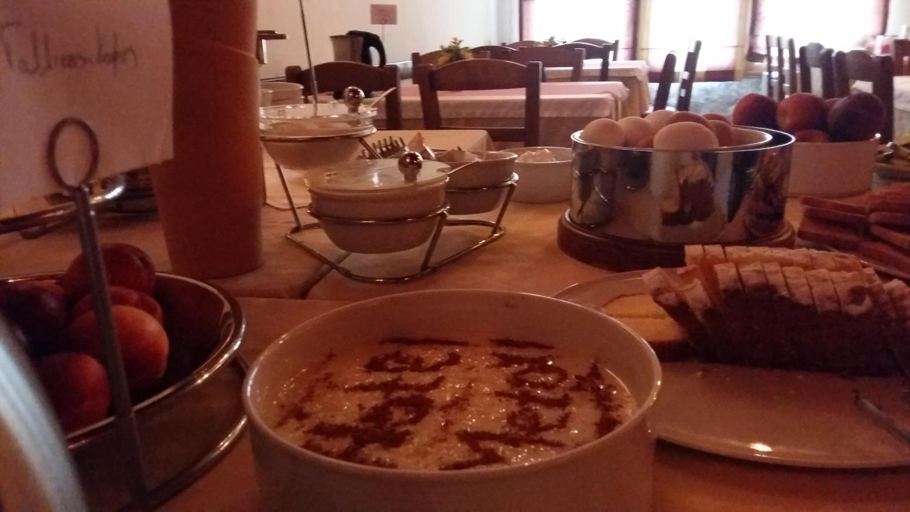 A reggeli nagyon bőséges, változatos és ízletes volt. Kérésre mindent pótoltak ami elfogyott az asztalról. A tulajdonos ajánlására egy helyi különlegességet is megkóstolhattunk. A kilátás pedig az étkező teraszról egyszerűen varázslatos...