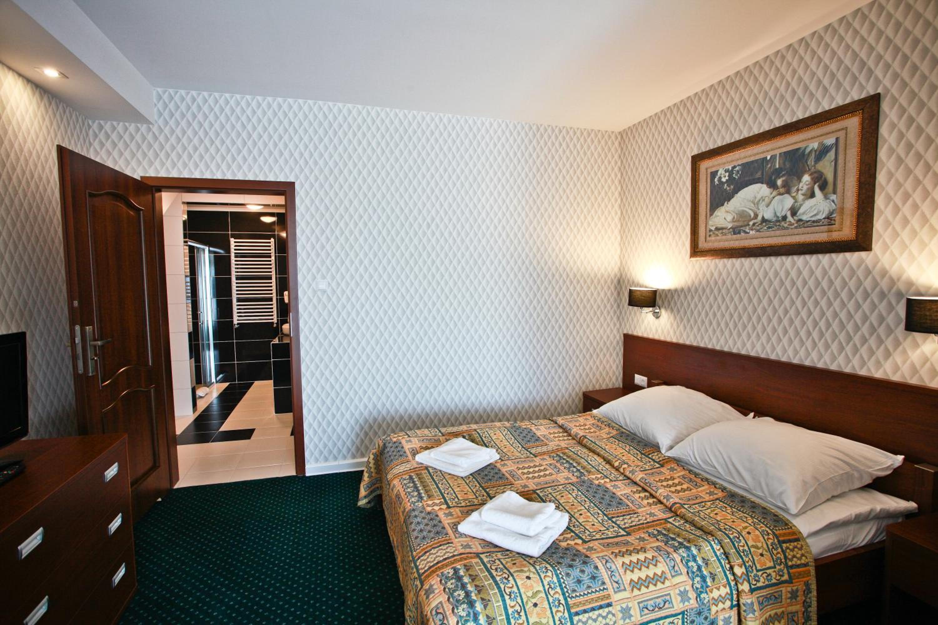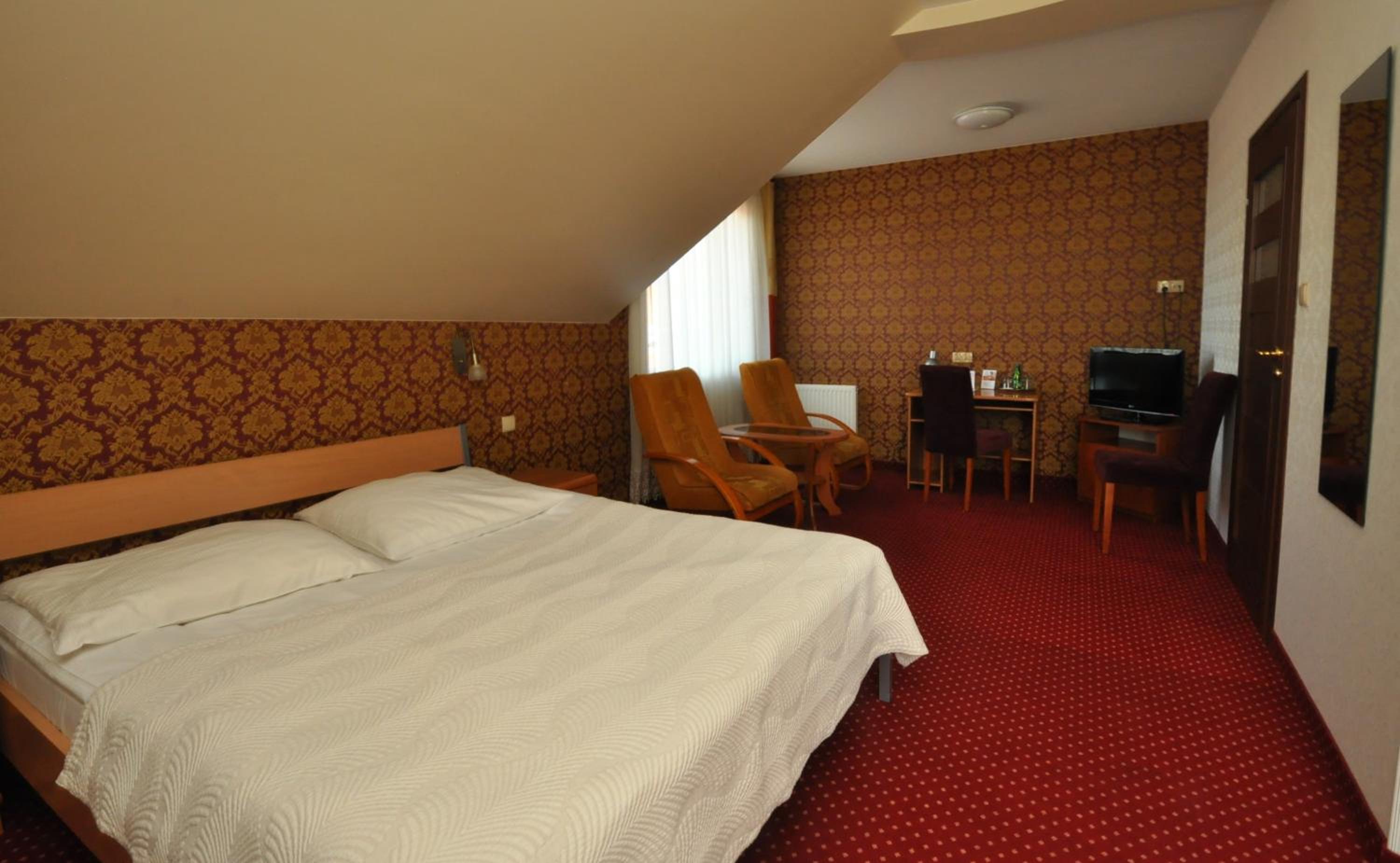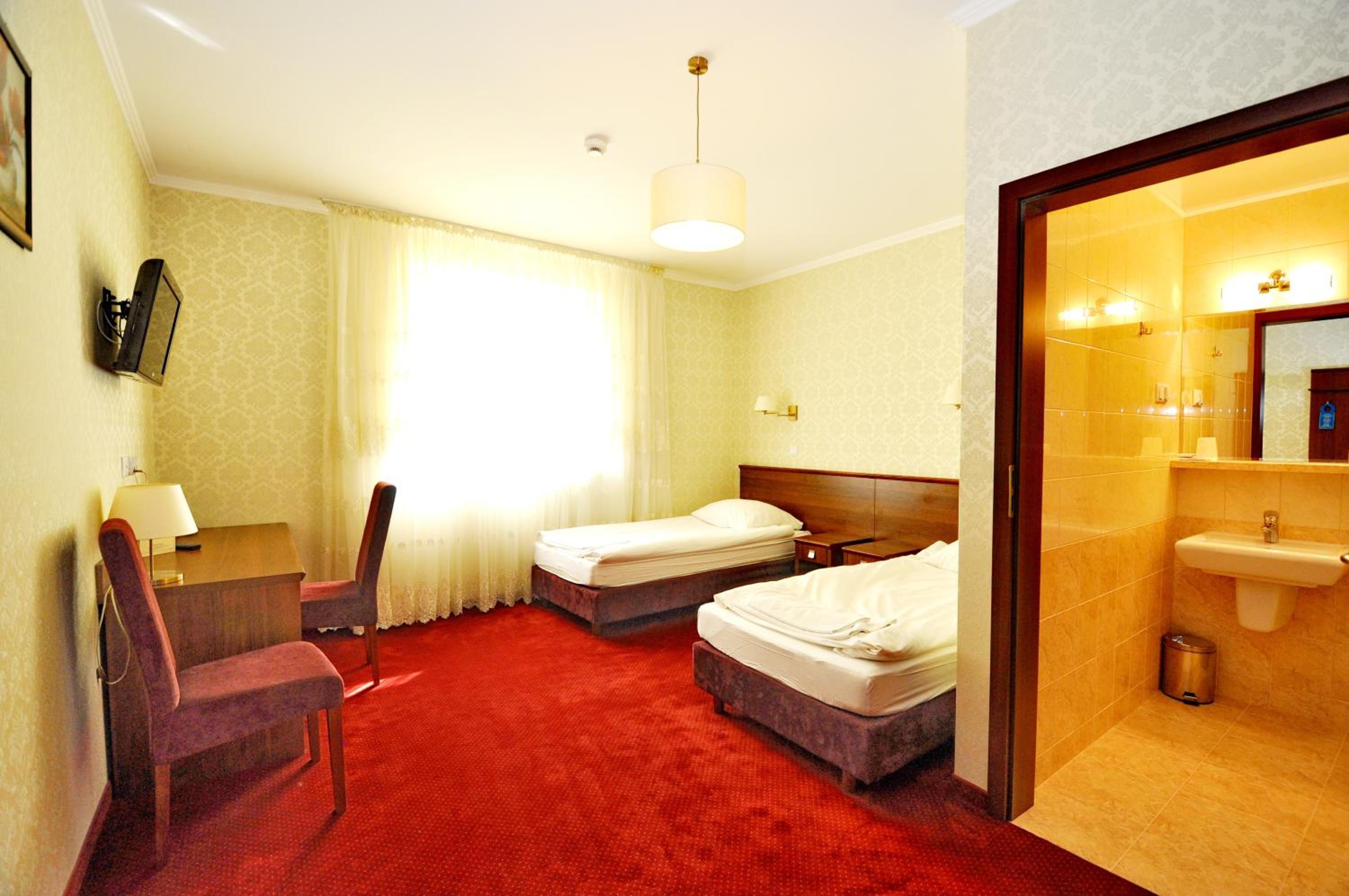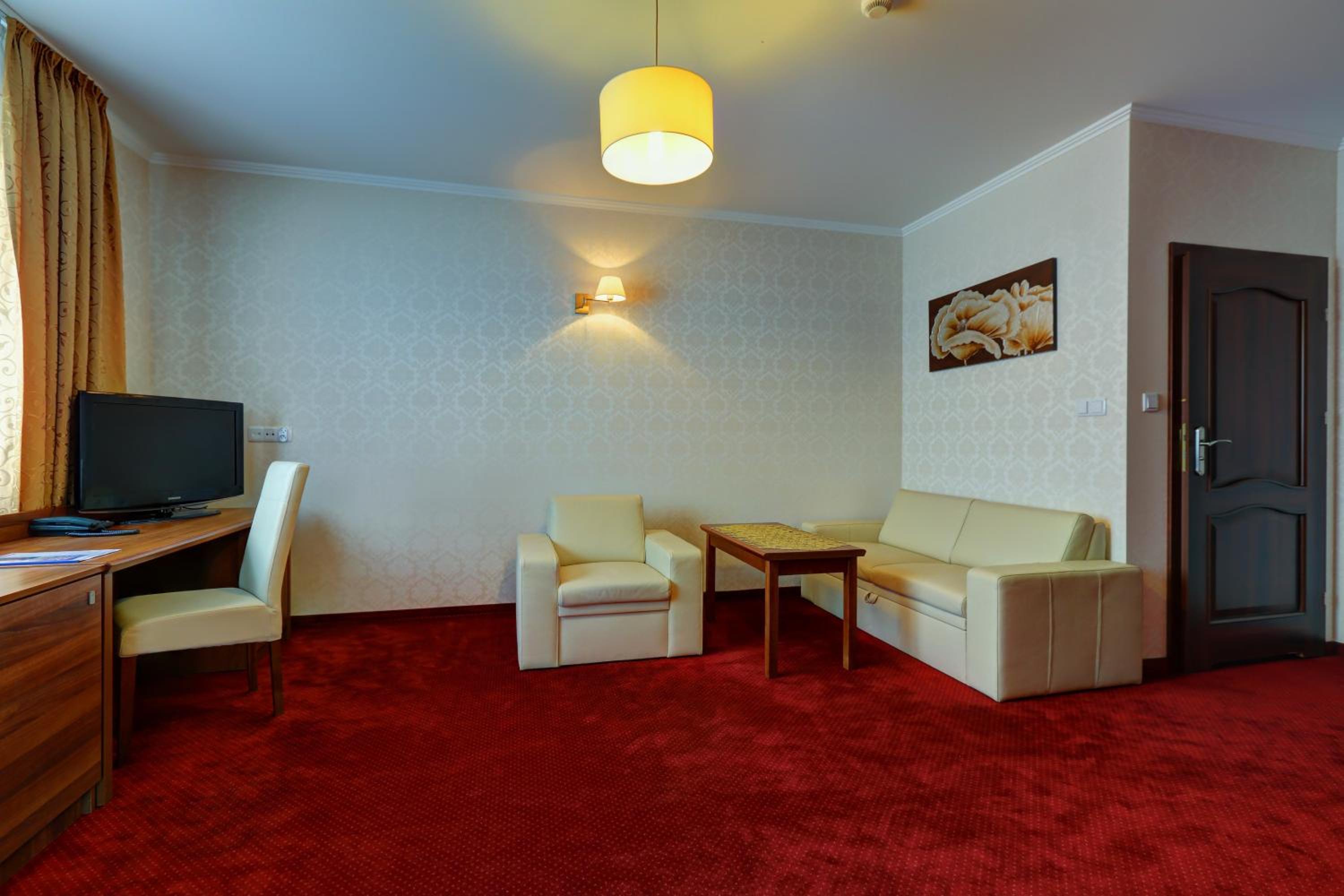 The rooms at Hotel Chabrowy Dworek feature a classic interior design in warm pastel colors, creating a cozy and inviting atmosphere for guests. Each room is equipped with a TV with satellite channels, a seating area, and a private bathroom with a shower, ensuring a comfortable stay for all visitors.