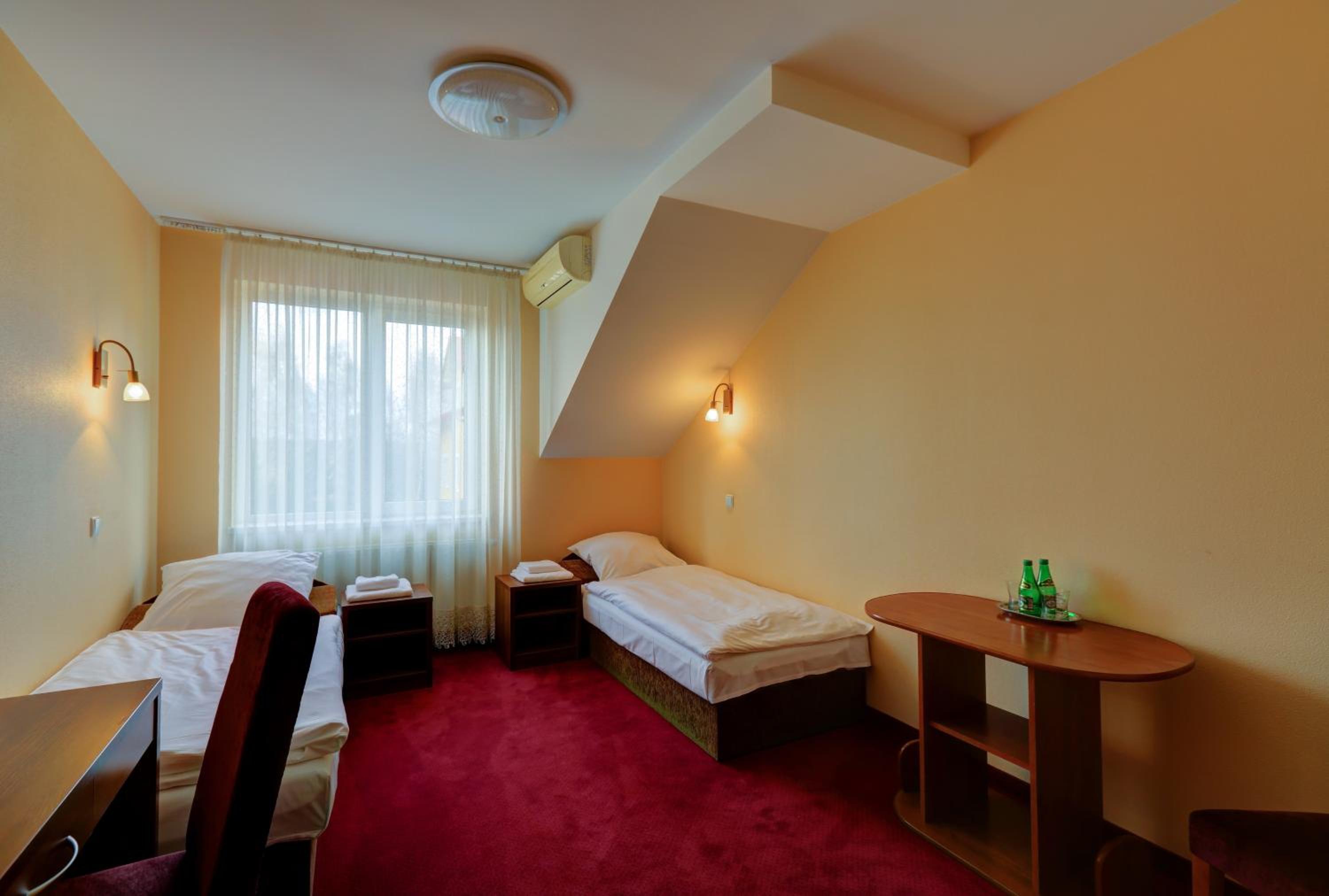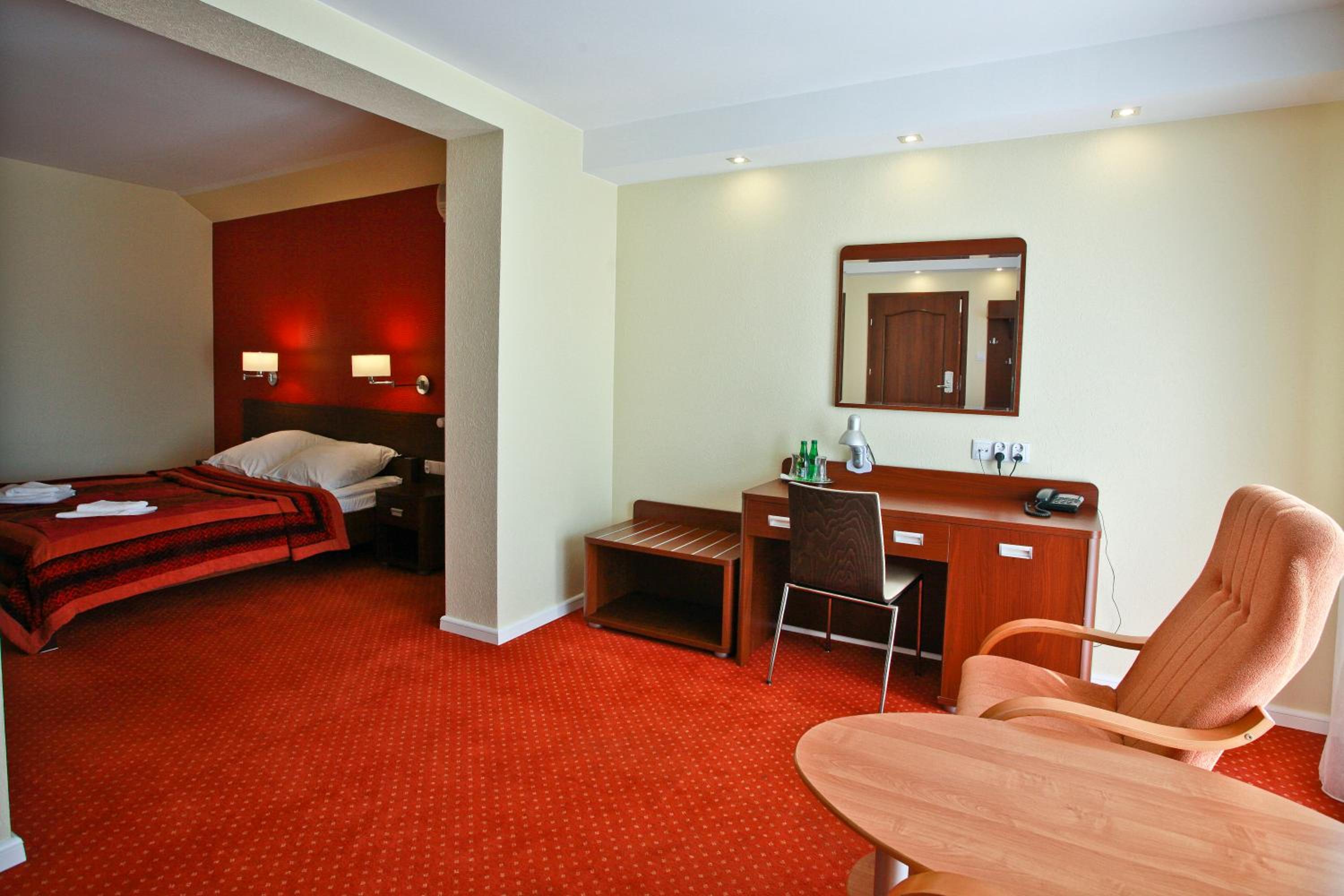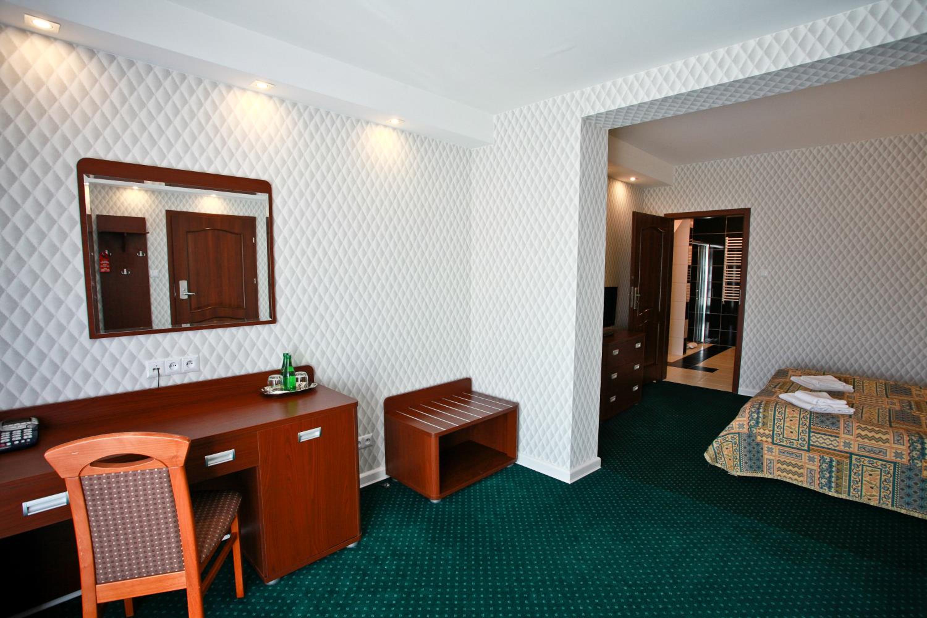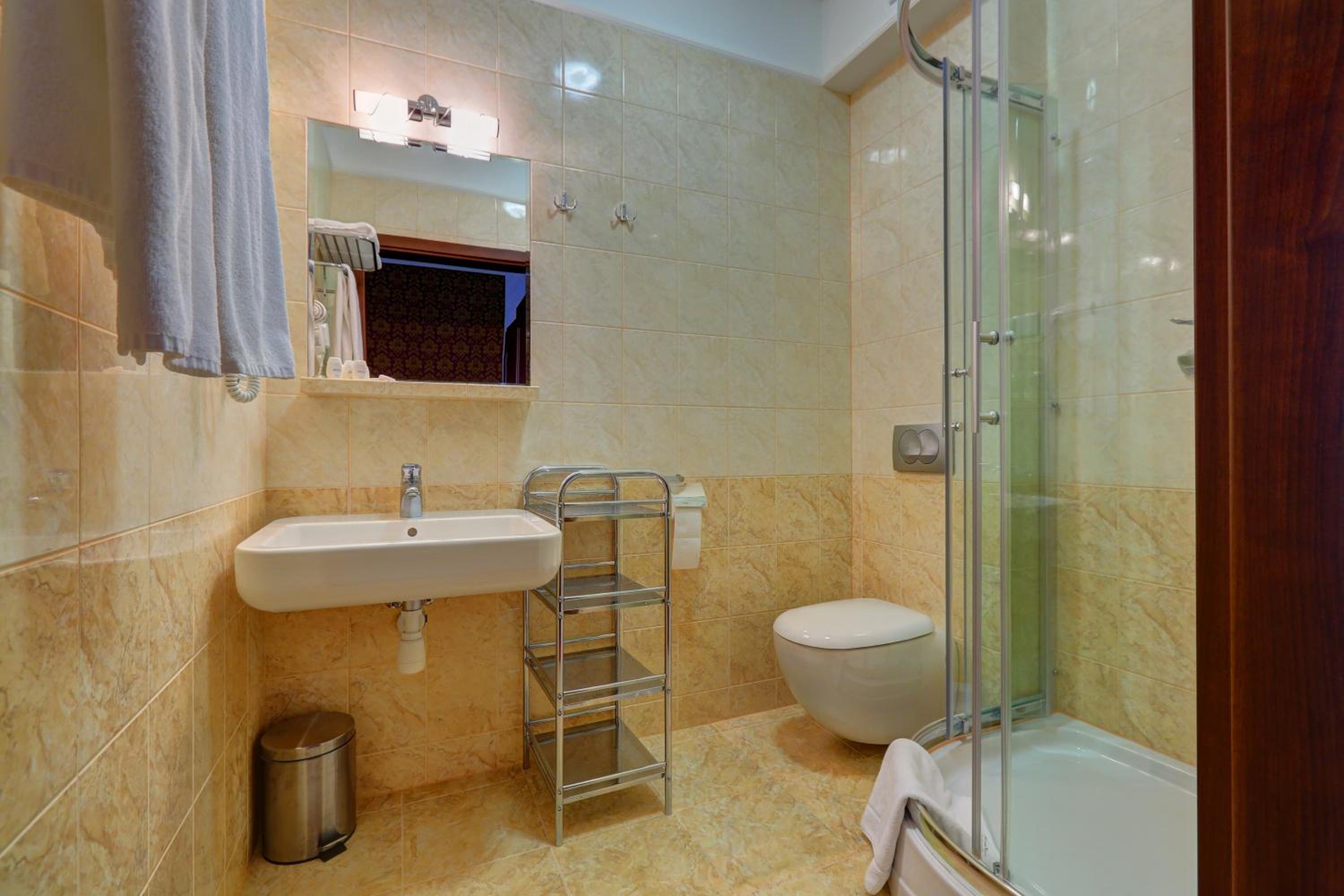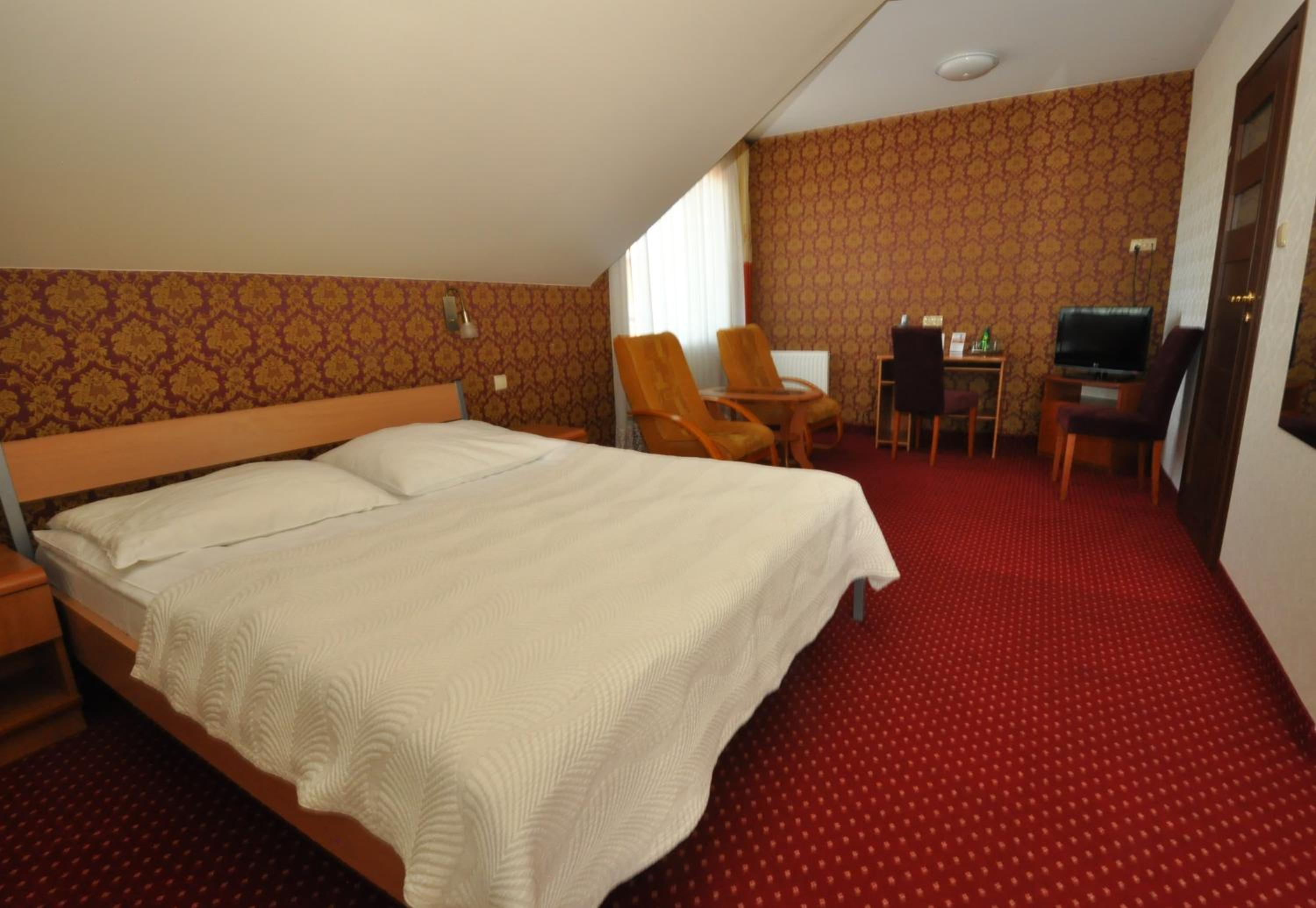 The rooms at Hotel Chabrowy Dworek feature a classic interior design in warm pastel colors, creating a cozy and inviting atmosphere for guests. Each room is equipped with a TV with satellite channels, a seating area, and a private bathroom with a shower, ensuring a comfortable stay for all visitors.