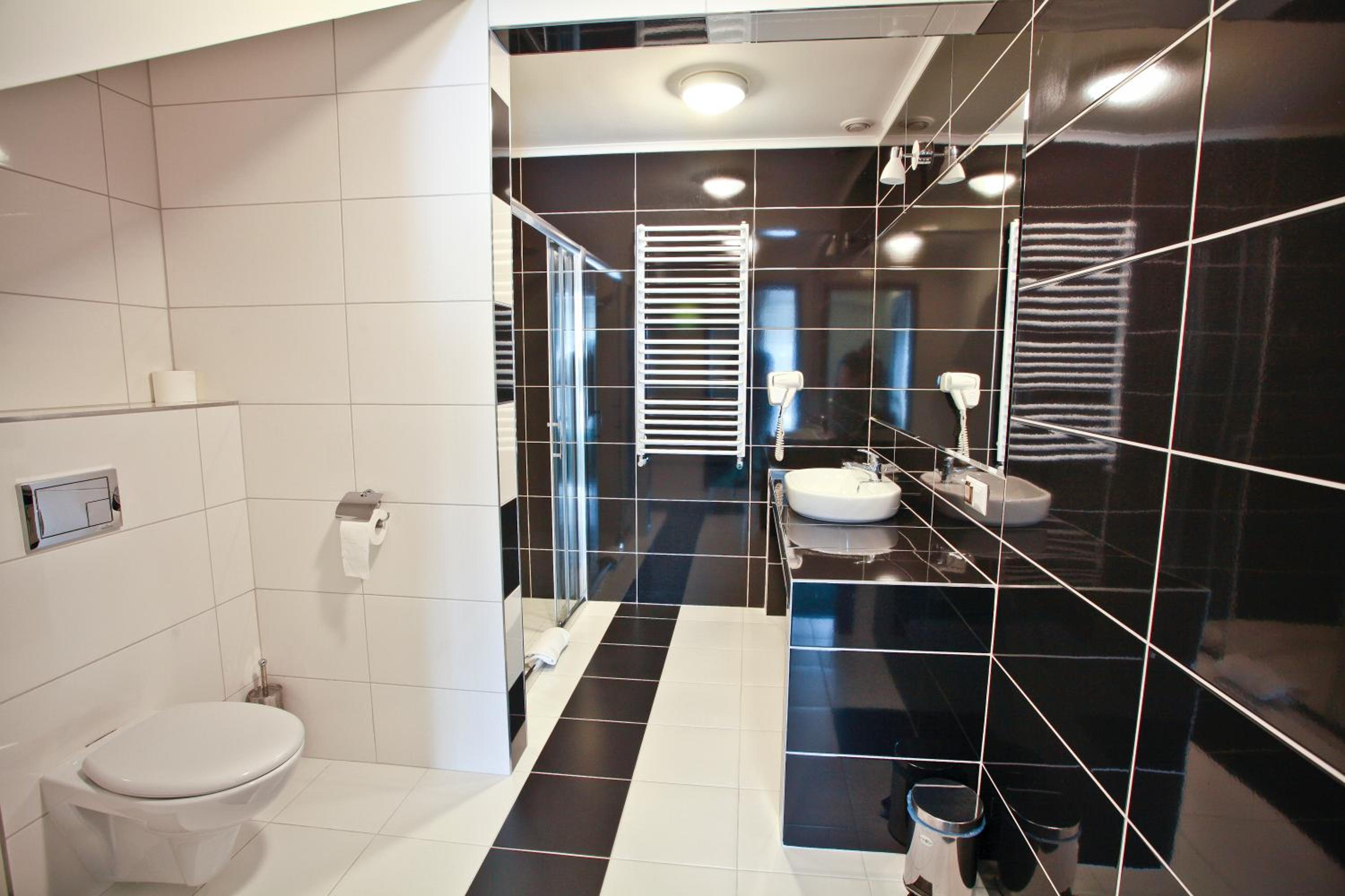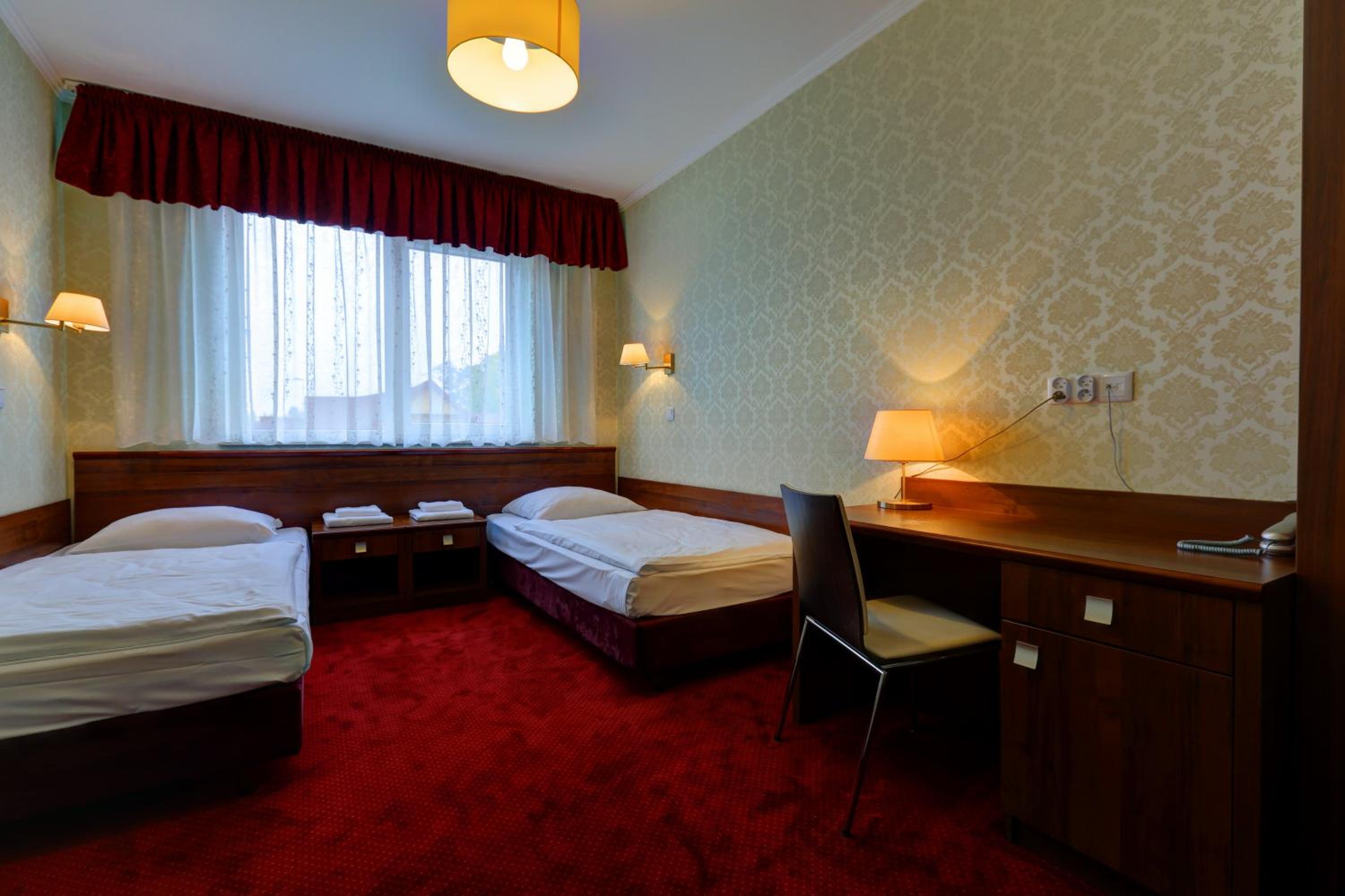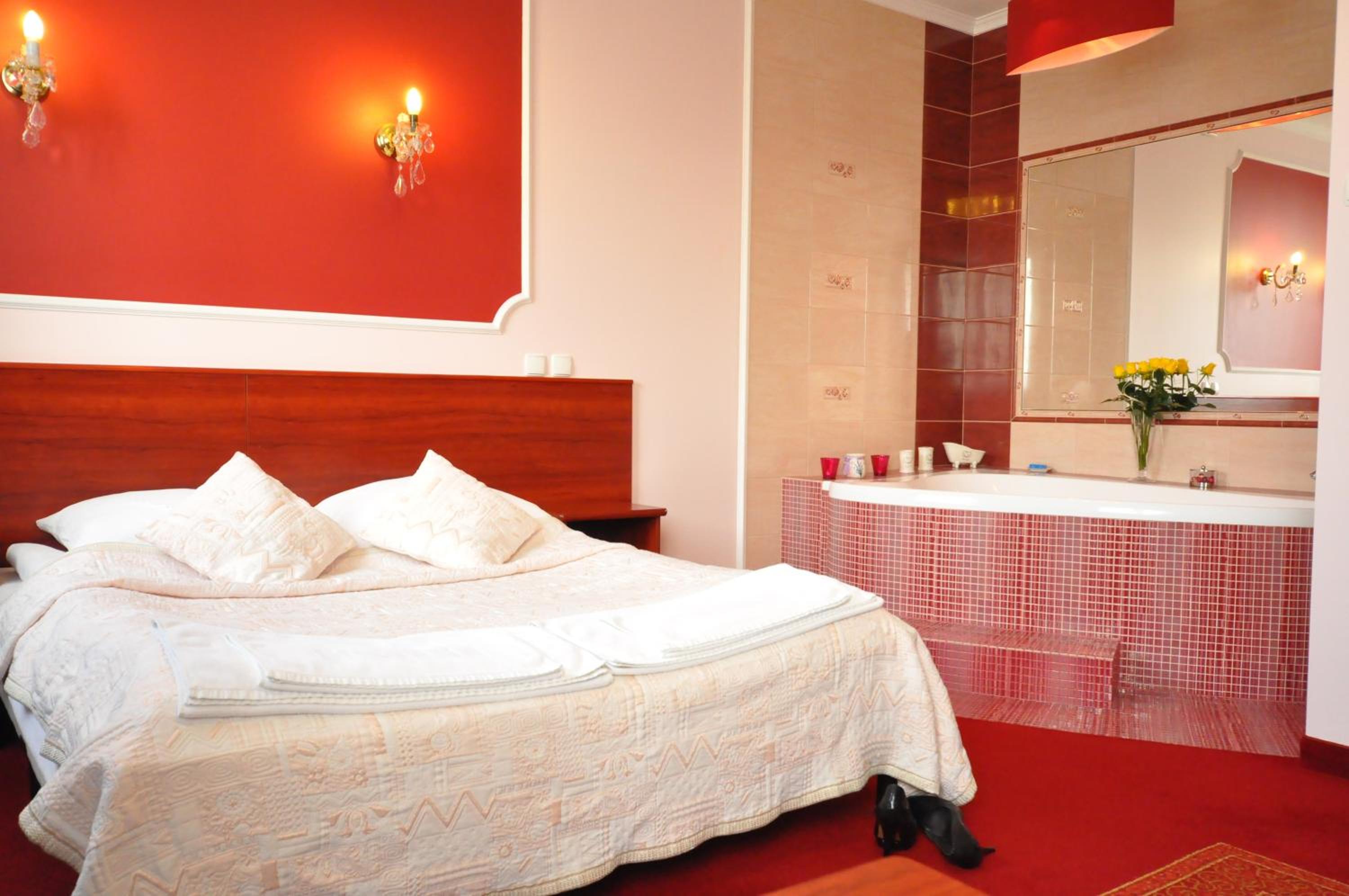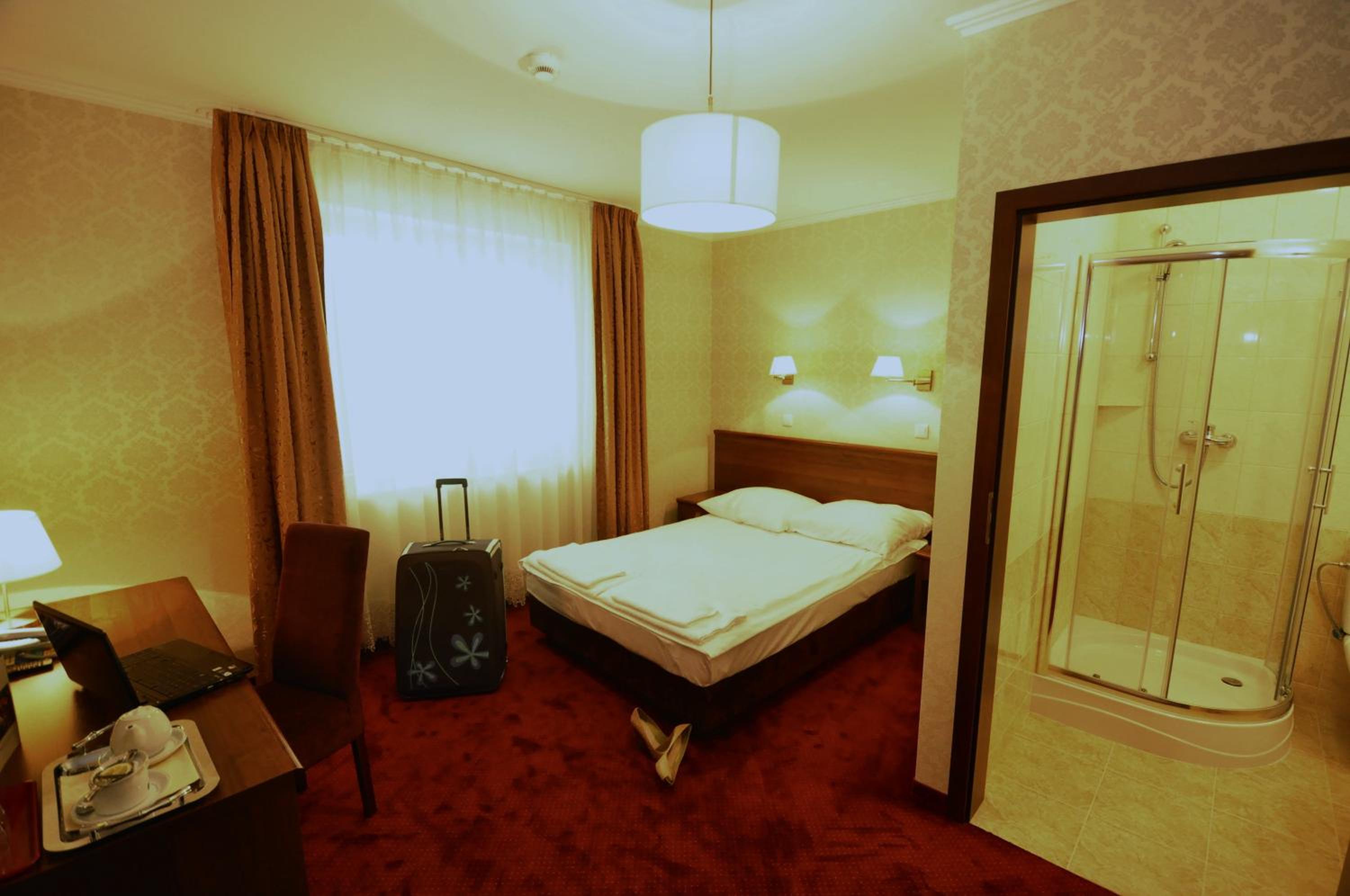 The rooms at Hotel Chabrowy Dworek feature a classic interior design in warm pastel colors, creating a cozy and inviting atmosphere for guests. Each room is equipped with a TV with satellite channels, a seating area, and a private bathroom with a shower, ensuring a comfortable stay for all visitors.