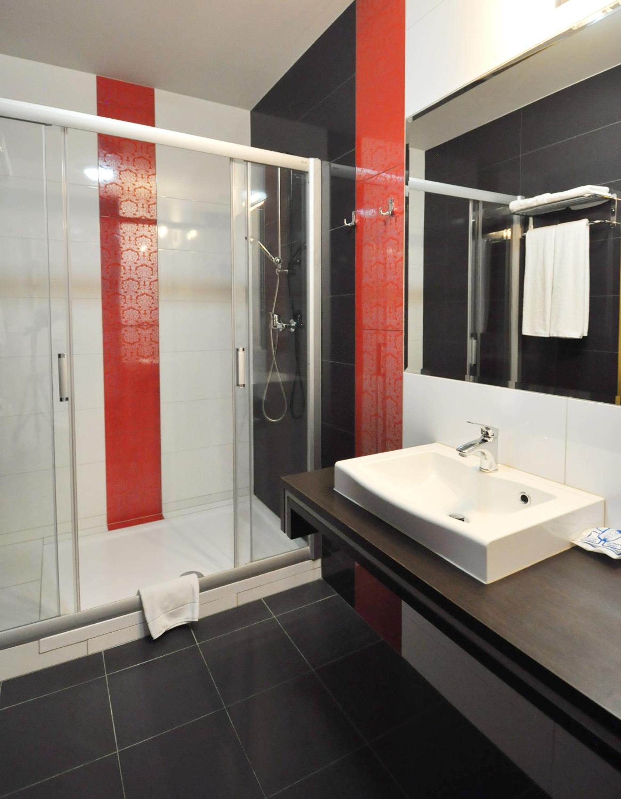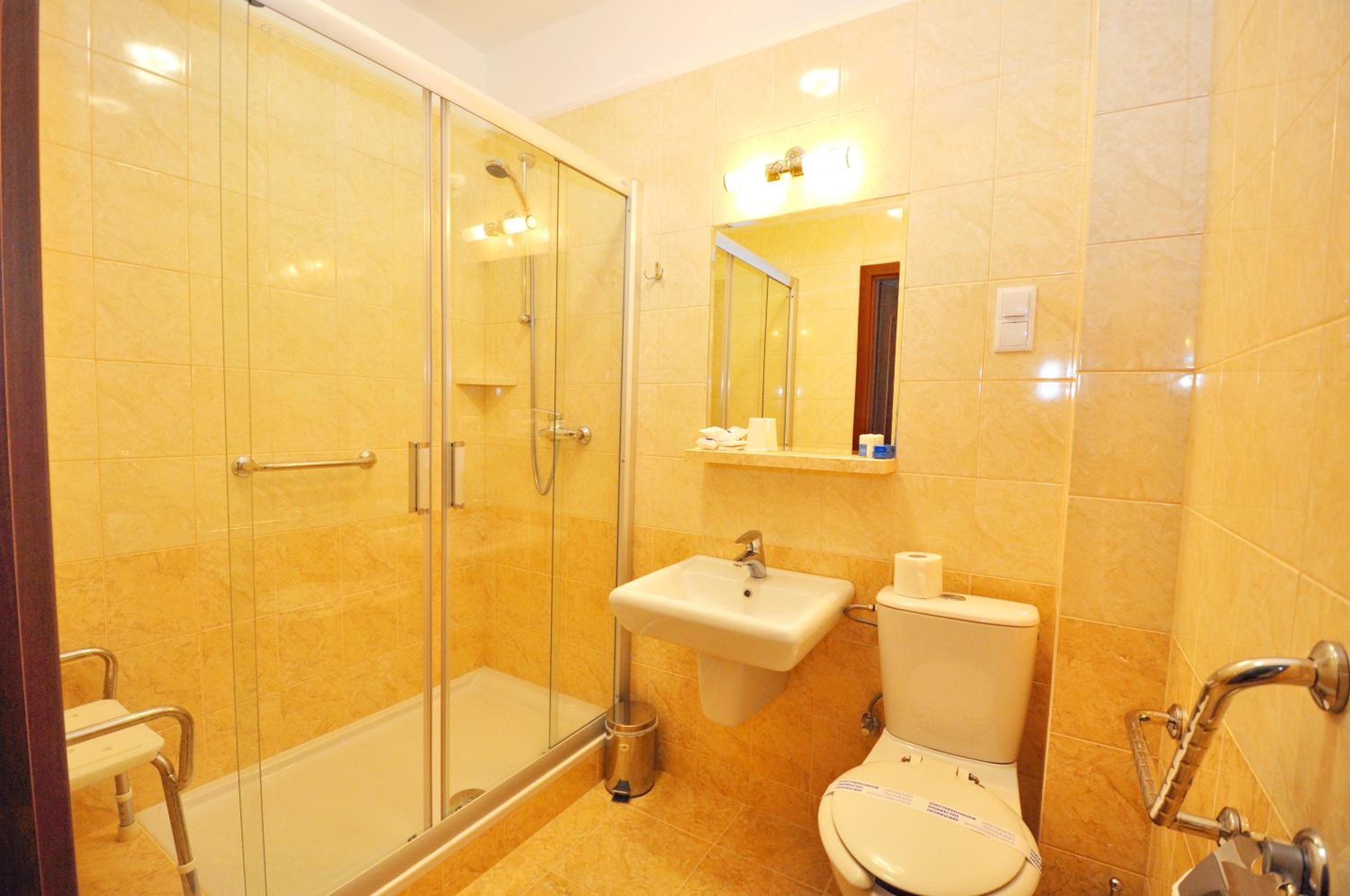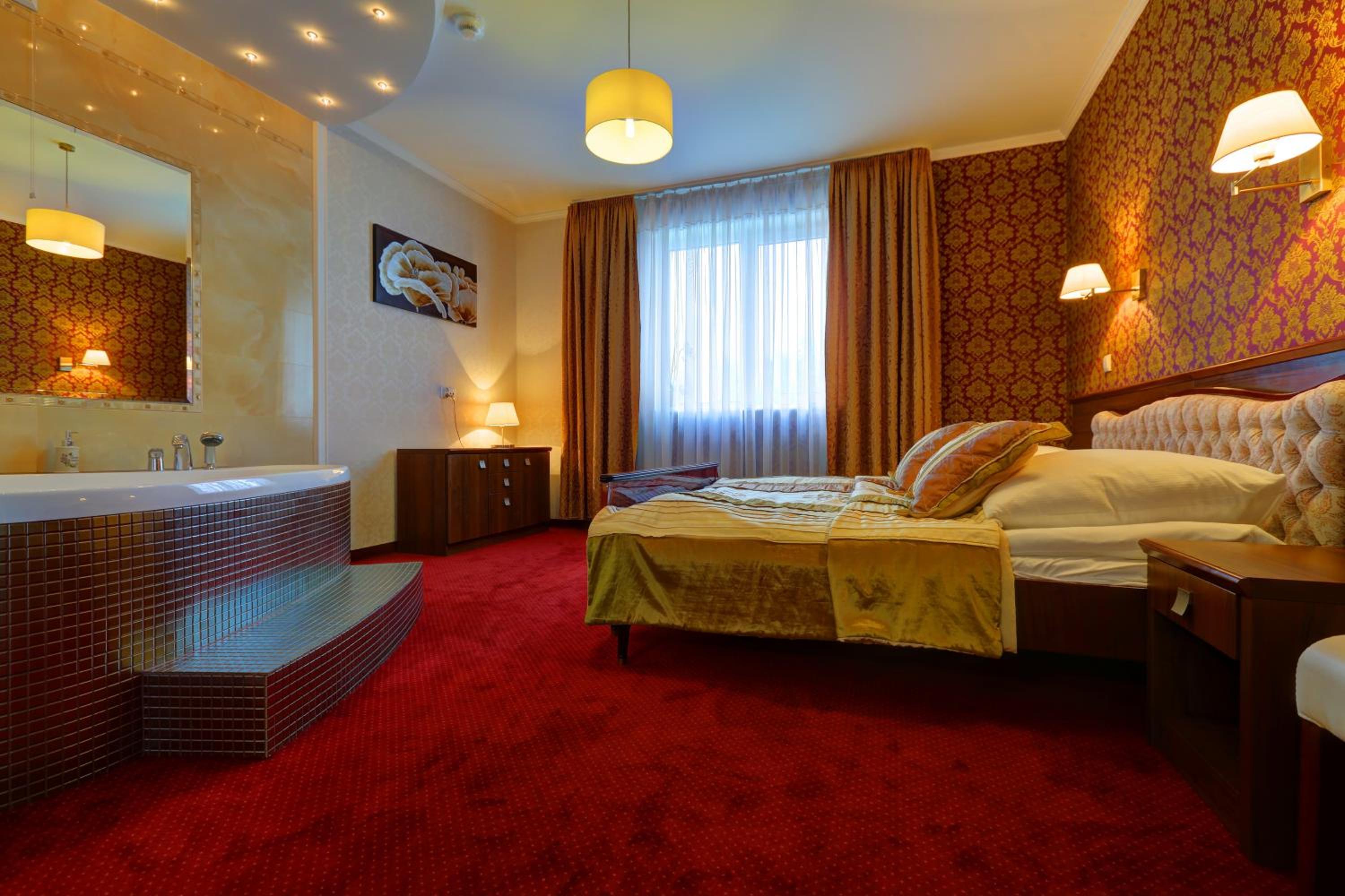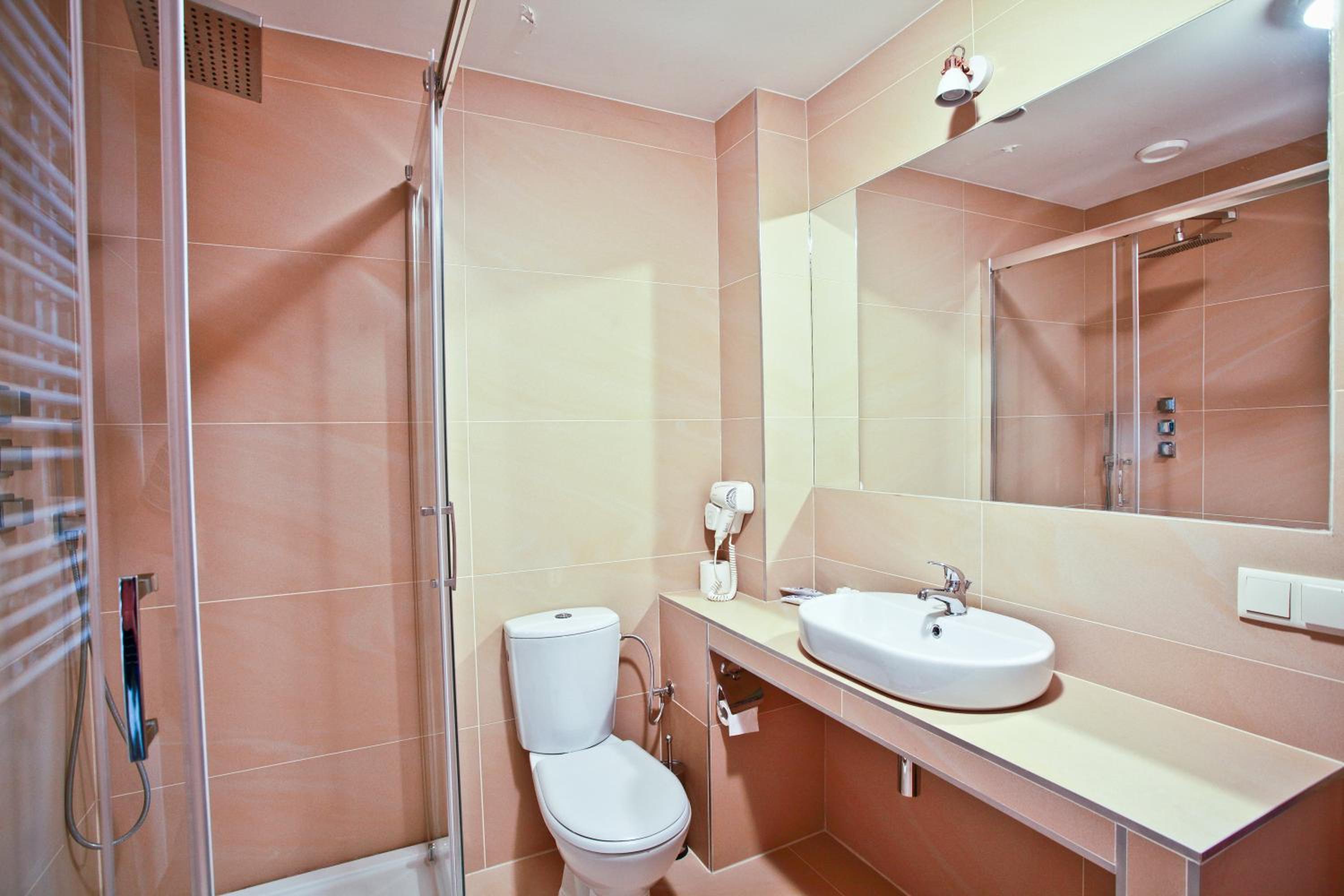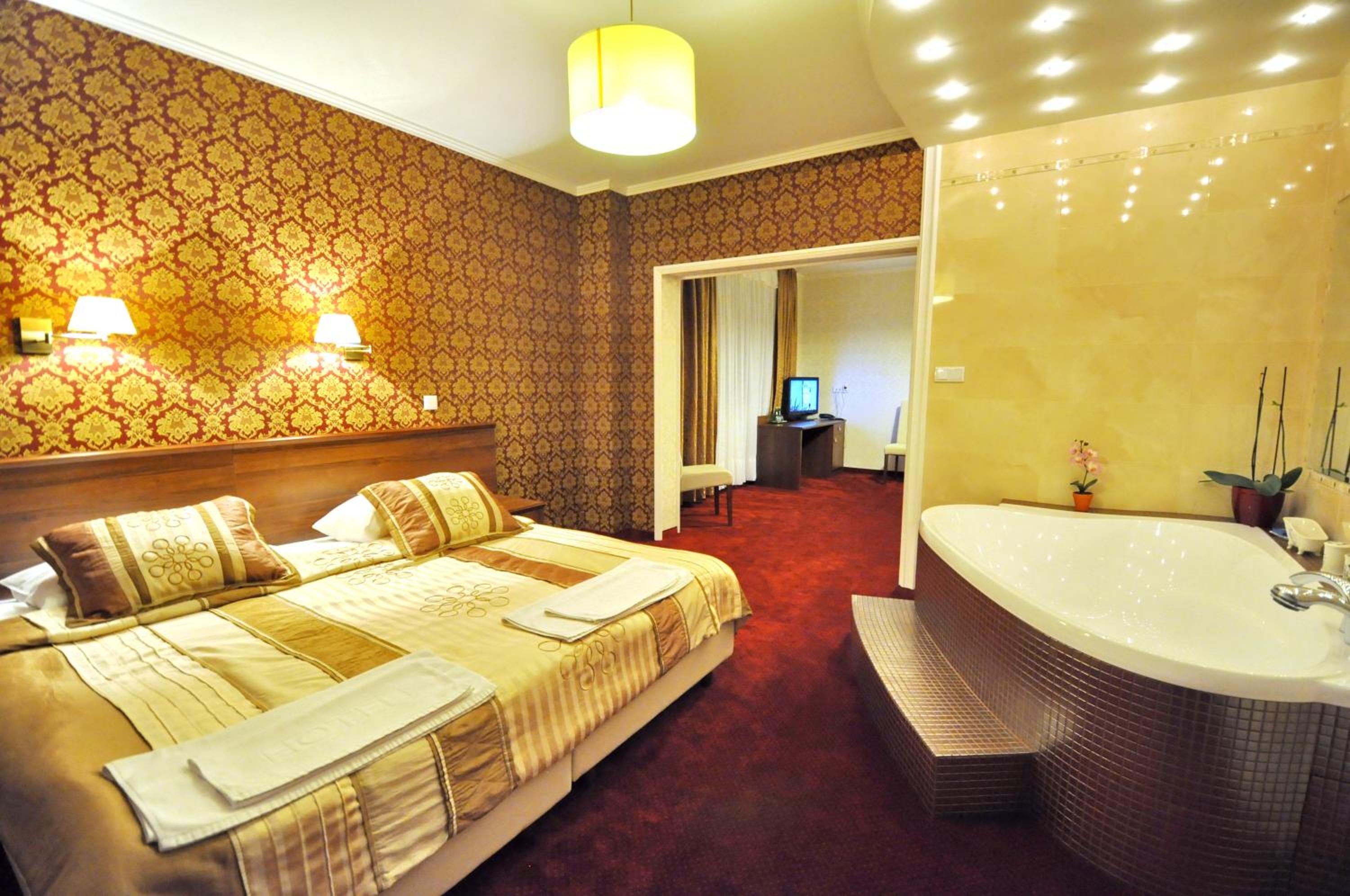 The rooms at Hotel Chabrowy Dworek feature a classic interior design in warm pastel colors, creating a cozy and inviting atmosphere for guests. Each room is equipped with a TV with satellite channels, a seating area, and a private bathroom with a shower, ensuring a comfortable stay for all visitors.