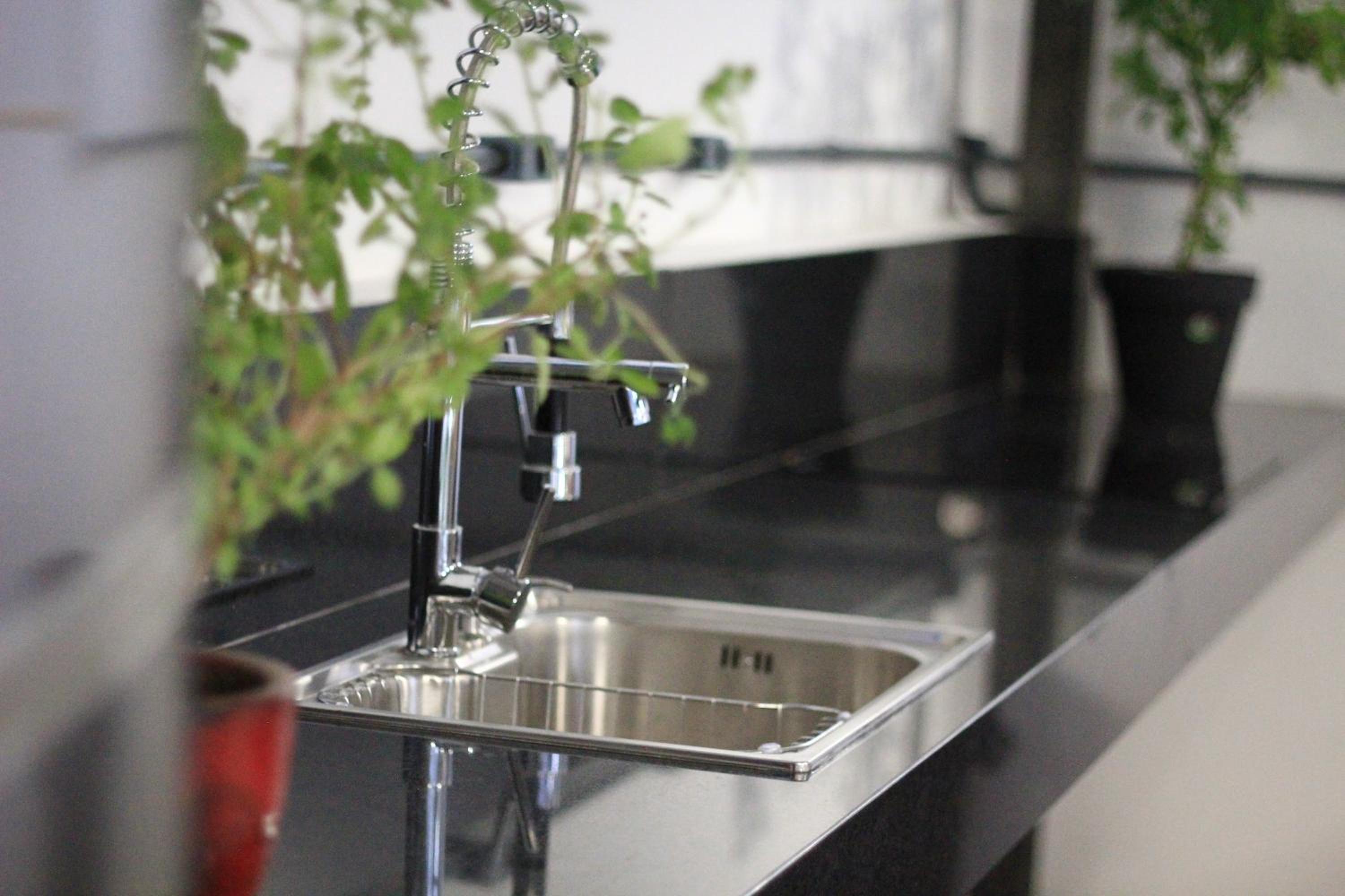 Final corredor acesso à cozinha, geladeira, pia, água.